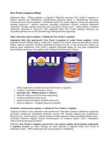 Now Foods L-Arginine 500mg Suplement diety - 500mg argininy w kapsułce! Odżywka sportowa Now Foods L-arginine, w którym arginina jest niezbędnym aminokwasem biorącym udział w metabolizmie mocznika. Farmaceutycznie czysta l-arginina w tabletkach marki Now Foods odgrywa ważną rolę organizmie każdego sportowca - odtruwa organizm, stymuluje wydzielanie insuliny, zwiększa odporność organizmu. Ponadto arginina uznawana jest za prekursor tlenku azotu - nasila erekcję i zwiększa sprawność seksualną u mężczyzn. Tani suplement diety Now Foods Arginine polecany jest wszystkim sportowcom w celu prawidłowego funkcjonowania organizmu. Opis i charakterystyka argininy w tabletkach Now Foods L-arginina. Suplement diety dla sportowców Now Foods L-arginine to wolna forma argininy. Każda kapsułka zawiera 500mg argininy. Odżywka L-arginine Now Foods zapewnia prawidłową syntezę białek, odtruwa organizm, zwiększa produkcję hormonu wzrostu, a więc pozytywnie wpływa na budowę masy mięśniowej. Now Foods L-arginine doskonale nadaje się więc jako uzupełnienie diety każdego sportowca, szczególnie osób trenujących kulturystykę i fitness. • • • • • • Zalety suplementu aminokwasowego Now Foods L-Arginine: zwiększa wydzielanie hormonu wzrostu, podwójna siła - 500mg argininy w tabletce, odżywka wpływa na wzrost masy mięśniowej, zwiększa produkcję tlenku azotu, preparat poprawia funkcje seksualne mężczyzn, odtruwa organizm - wyłapuje toksyczny amoniak. Działanie i zastosowanie argininy w tabletkach Now Foods L-Arginine. Arginina to bardzo ważny aminokwas dla sportowców. Naturalnie zwiększa odporność organizmu, powoduje zwiększone wydzielanie hormonu wzrostu GH. Ponadto arginina jest stymulatorem kreatynowym - bierze udział w syntezie kreatyny. Dobra arginina zwiększa produkcję tlenku azotu utrzymuje właściwe napięcie naczyń krwionośnych, co zwiększa dopływ tlenu i składników odżywczych do pracujących mięśni. Odżywka Now Foods L-Arginina zawiera dwa razy więcej argininy niż przeciętne suplementy z argininą dostępne na rynku. Dlatego też tania odżywka L-Arginine marki Now Foods to doskonały wybór - 100% farmaceutycznie czysta arginina w tabletkach. Produkt nie zawiera: cukru, soli, drożdży, glutenu, jaj, mleka, soi, skrobi, kukurydzy, pszenicy ani żadnych środków konserwujących. Kilka słów o producencie: Firma Now Foods w prowadzonej od 1968 roku działalności każdym dniem zapracowała sobie na miano najbardziej renomowanego producenta w branży w USA. Potwierdzają to liczne tytuły i nagrody: Producent Roku 2003 w USA, Najlepsza Marka w sklepach ze zdrową żywnością w USA w 2004 roku. Now Foods mając na celu najwyższą satysfakcję swoich klientów produkuje tylko najwyższej dostępnej farmaceutycznej klasy. Dla zapewnienia bezwzględnej jakości podstawowych składników każdy z naszych dostawców jest przez nas kontrolowany w nieregularnych audytach. Now Foods robi wszystko co możliwe, aby najwyższa jakość produktów mogła być zaoferowana klientom w cenie, na którą mogą sobie pozwolić. Sprawdź jak tanie odżywki z USA i najlepsze suplementy diety firmy Now Foods wspomagają zdrowie polskich kulturystów. Producent wysokiej jakości odżywki aminokwasowej - L-Arginine: Now Foods Zobacz wszystkie suplementy diety z kategorii: odżywki z argininą, gdzie znajdziesz odżywki łączące różne formy argininy, argininę w kapsułkach, argininę w tabletkach czy też argininę w proszku. Wszystkie odżywki z argininą kupisz w niezwykle atrakcyjnych cenach na strona sklepu Kulturystyka.sklep.pl (woj. Śląskie, Kleszczów, ul. Gliwicka 14). Sprawdź nasze atrakcyjne niskie ceny i wybierz coś dla siebie! Skład odżywki aminokwasowej Now Sports Arginine: Zawartość opakowania odżywki: jednej porcji odżywki 1 tabletka L-Arginina 500 mg Skład odżywki: L-arginina, stearynian magnezu, dwutlenek krzemu, żelatyna (składnik otoczki) Sposób użycia L-argininy Now Foods: Należy stosować 1 porcję (2 kapsułki) 1-3 razy dziennie, najlepiej pomiędzy posiłkami bądź przed snem wraz z napojem węglowodanowym w celu lepszej absorpcji. Tutaj kupisz produkt: L-arginine 100 kaps. -> http://www.kulturystyka.sklep.pl/p/1140856793/NOW-FOODSL-Arginine-100-kaps-500mg L-arginine 250 kaps. -> http://www.kulturystyka.sklep.pl/p/1140858449/NOW-FOODSL-Arginine-250-kaps-500mg/
