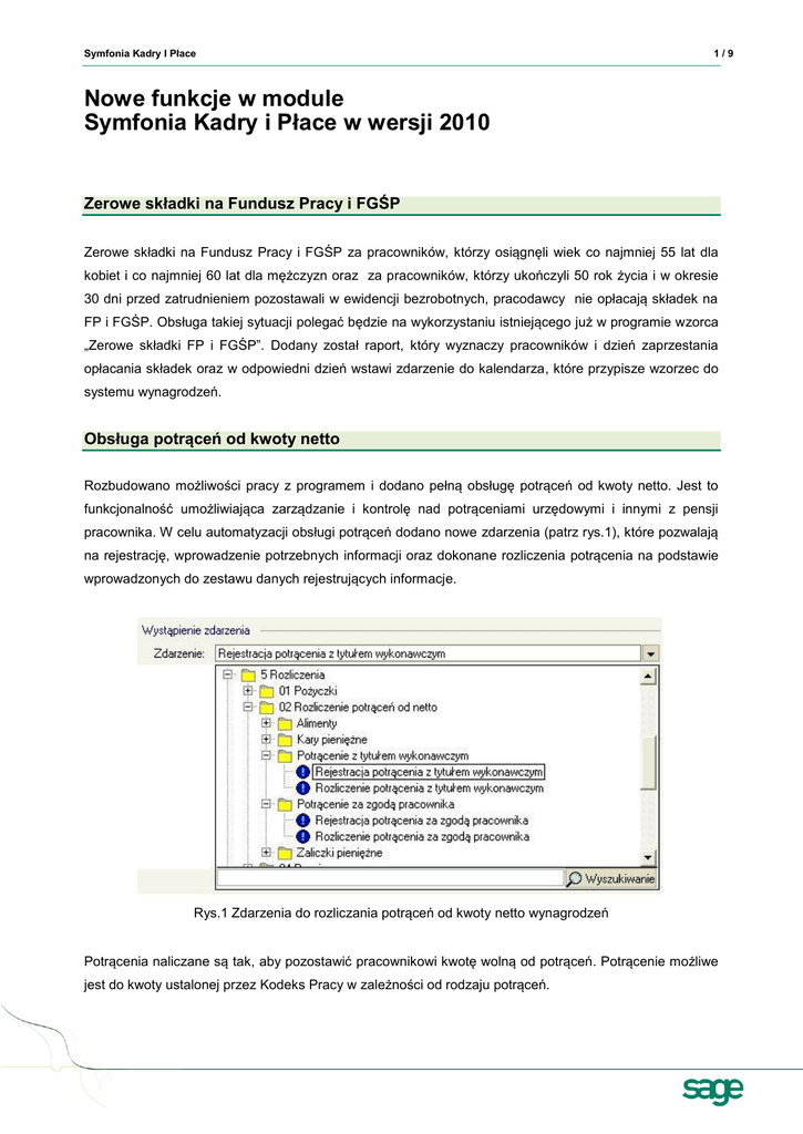 Symfonia Kadry I Płace 1/9 Nowe funkcje w module Symfonia Kadry i Płace w wersji 2010 Zerowe składki na Fundusz Pracy i FGŚP Zerowe składki na Fundusz Pracy i FGŚP za pracowników, którzy osiągnęli wiek co najmniej 55 lat dla kobiet i co najmniej 60 lat dla mężczyzn oraz za pracowników, którzy ukończyli 50 rok życia i w okresie 30 dni przed zatrudnieniem pozostawali w ewidencji bezrobotnych, pracodawcy nie opłacają składek na FP i FGŚP. Obsługa takiej sytuacji polegać będzie na wykorzystaniu istniejącego już w programie wzorca „Zerowe składki FP i FGŚP”. Dodany został raport, który wyznaczy pracowników i dzień zaprzestania opłacania składek oraz w odpowiedni dzień wstawi zdarzenie do kalendarza, które przypisze wzorzec do systemu wynagrodzeń. Obsługa potrąceń od kwoty netto Rozbudowano możliwości pracy z programem i dodano pełną obsługę potrąceń od kwoty netto. Jest to funkcjonalność umożliwiająca zarządzanie i kontrolę nad potrąceniami urzędowymi i innymi z pensji pracownika. W celu automatyzacji obsługi potrąceń dodano nowe zdarzenia (patrz rys.1), które pozwalają na rejestrację, wprowadzenie potrzebnych informacji oraz dokonane rozliczenia potrącenia na podstawie wprowadzonych do zestawu danych rejestrujących informacje. Rys.1 Zdarzenia do rozliczania potrąceń od kwoty netto wynagrodzeń Potrącenia naliczane są tak, aby pozostawić pracownikowi kwotę wolną od potrąceń. Potrącenie możliwe jest do kwoty ustalonej przez Kodeks Pracy w zależności od rodzaju potrąceń. Symfonia Kadry I Płace 2/9 W przypadku należności alimentacyjnych nie uwzględniamy kwoty wolnej tak jak to ma miejsce w przypadku potrąceń innego rodzaju. Potrącana jest kwota do wysokości trzech piątych wynagrodzenia. Alimenty możemy potrącać jako jednorazową kwotę lub cyklicznie, bez ograniczenia czasu trwania transakcji (patrz rys.2). Domyślnie potrącenia alimentów będą generowane co jeden miesiąc aż do ręcznego zakończenia transakcji przez upoważnionego użytkownika. Rys.2 Rozliczanie alimentów Dokonując potrąceń wynagrodzenia, przy wyborze rodzaju potrącenia i zbiegu tych samych typów potrąceń, uwzględniamy kolejność potrąceń, o których użytkownik sam decyduje w atrybucie „kolejność przy zbiegu potrąceń o takim samym typie” oraz w atrybucie „przy zbiegu potrąceń na to potrącenie uwzględnij % wynagrodz”. Ustalając dopuszczalną kwotę potrącenia od wynagrodzenia za pracę, zgodnie z art. 87 Kodeksu Pracy, odlicza się składki na ubezpieczenia społeczne oraz zaliczkę na podatek dochodowy od osób fizycznych. Uwzględniane są również składki na ubezpieczenie zdrowotne. W elemencie kadrowym „Przy ustalaniu maks. kwoty potrącenia uwzględniaj zdrowotną” użytkownik może zmienić to ustawienie i zdecydować czy składkę zdrowotną uwzględniać czy też nie. Obsługa potrąceń obejmuje również zasiłki, od których można pobierać kwoty na zaspokojenie należności urzędowych i innych. W programie zasiłki podlegają egzekucji na zaspokojenie należności alimentacyjnych – do wysokości 60% kwoty zasiłku oraz egzekucji na zaspokojenie innych należności – do wysokości 25% kwoty zasiłku. Wolna od egzekucji jest kwota zasiłku w części odpowiadającej: Symfonia Kadry I Płace – 3/9 50% kwoty najniższej emerytury przy egzekwowaniu potrąceń ustalonych na mocy tytułów wykonawczych i na zaspokojenie należności alimentacyjnych – 60% kwoty najniższej emerytury przy egzekwowaniu innych należności Podstawa prawna: • art. 138, art. 139–144 ustawy z 17 grudnia 1998 r. o emeryturach i rentach z Funduszu Ubezpieczeń Społecznych (DzU z 2004 r. nr 39, poz. 353 ze zm.), • art. 66 ustawy z 25 czerwca 1999 r. o świadczeniach pieniężnych z ubezpieczenia społecznego w razie choroby i macierzyństwa (DzU z 2005 r. nr 31, poz. 267). W zestawie kadrowym Wynagrodzenia\Parametry potrąceń, użytkownik może zmieniać ustawienia granic wysokości potrącenia z zasiłków oraz procenty kwoty najniższej emerytury wolnej od potrąceń w zależności od rodzaju potrącenia. Elementem odpowiedzialnym za uwzględnianie zasiłków, zgodnie z powyższymi ustawieniami przy potrąceniach, jest element kadrowy „Przy potrąceniach od netto, zasiłki uwzględniaj zgodnie z”, który domyślnie ustawiony jest na wartość słownikową - ustawa emerytalna. Wszystkie elementy kadrowe służące jako parametry, które posiadają ustawienia domyślne zgodne z obowiązującymi przepisami, znajdują się w zestawie kadrowym Wynagrodzenia\Parametry potrąceń (patrz rys.3). Rys.3 Zestaw Parametry potrąceń Na podstawie wypełnionych atrybutów zestawu kadrowego rejestrującego potrącenie (nazwa banku, nr konta, imię, nazwisko), generowane są przelewy. Przelew dla wierzyciela (komornika, współmałżonka) generowany jest wraz z przelewem dla pracownika. W celu ułatwienia kontroli nad potrąceniami dodano raporty: – Zestawienie potrąceń z kwoty netto – Zestawienie kwot pozostałych do potrącenia Symfonia Kadry I Płace 4/9 Dodano Zestawy elementów: – Karta wynagrodzeń potrącenia od netto – Lista płac potrącenia od netto Uwzględniono również potrącenia na kartach wynagrodzeń i listach płac. Wspomaganie użytkownika w podstawowych procesach Wprowadzono udogodnienie w obsłudze podstawowych procesów w programie poprzez zgrupowanie ich pod łatwo dostępnymi przyciskami. Rozwiązanie to opiera się na udostępnionych wcześniej w programie mechanizmach i jest ułatwieniem ich wykorzystania w codziennej pracy. W następujących oknach pojawiły się zmiany: – okno Pracownicy lista pracowników – okno Pracownicy obszar Katalogi – okno Pracownik zakładka Pracownik (tylko nowo wprowadzonego pracownika) – okno Pracownik zakładka Kalendarz (patrz rys.4) – okno Wzorce kadrowo-płacowe dla listy pracowników – okno Firma zakładka Kalendarz (patrz rys