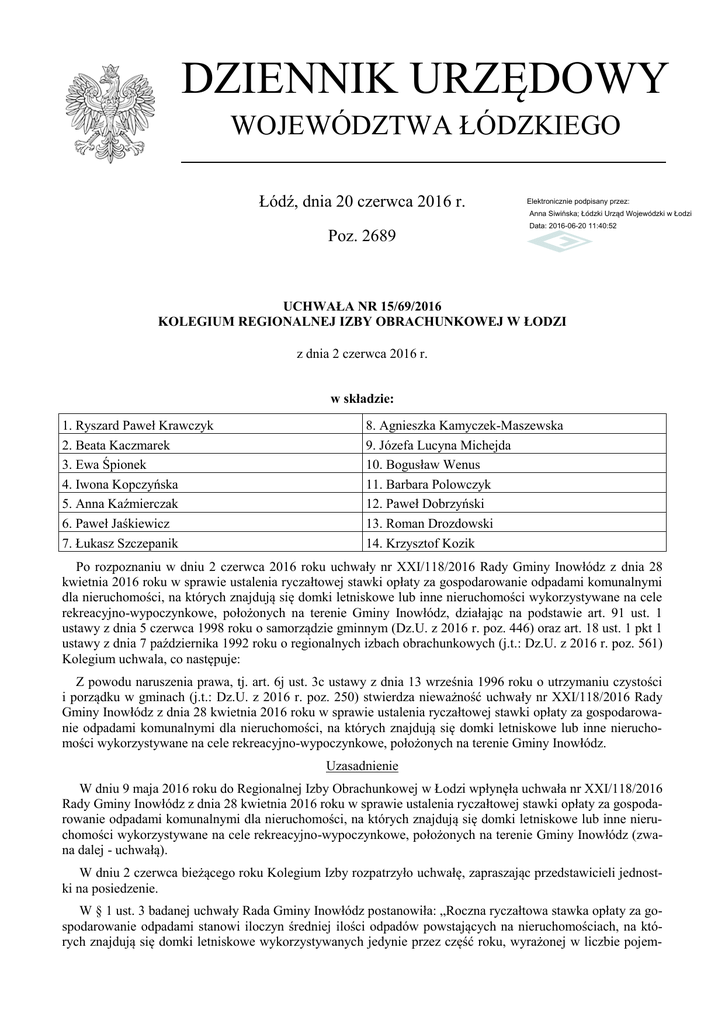 DZIENNIK URZĘDOWY WOJEWÓDZTWA ŁÓDZKIEGO Łódź, dnia 20 czerwca 2016 r. Elektronicznie podpisany przez: Anna Siwińska; Łódzki Urząd Wojewódzki w Łodzi Poz. 2689 Data: 2016-06-20 11:40:52 UCHWAŁA NR 15/69/2016 KOLEGIUM REGIONALNEJ IZBY OBRACHUNKOWEJ W ŁODZI z dnia 2 czerwca 2016 r. w składzie: 1. Ryszard Paweł Krawczyk 2. Beata Kaczmarek 3. Ewa Śpionek 4. Iwona Kopczyńska 5. Anna Kaźmierczak 6. Paweł Jaśkiewicz 7. Łukasz Szczepanik 8. Agnieszka Kamyczek-Maszewska 9. Józefa Lucyna Michejda 10. Bogusław Wenus 11. Barbara Polowczyk 12. Paweł Dobrzyński 13. Roman Drozdowski 14. Krzysztof Kozik Po rozpoznaniu w dniu 2 czerwca 2016 roku uchwały nr XXI/118/2016 Rady Gminy Inowłódz z dnia 28 kwietnia 2016 roku w sprawie ustalenia ryczałtowej stawki opłaty za gospodarowanie odpadami komunalnymi dla nieruchomości, na których znajdują się domki letniskowe lub inne nieruchomości wykorzystywane na cele rekreacyjno-wypoczynkowe, położonych na terenie Gminy Inowłódz, działając na podstawie art. 91 ust. 1 ustawy z dnia 5 czerwca 1998 roku o samorządzie gminnym (Dz.U. z 2016 r. poz. 446) oraz art. 18 ust. 1 pkt 1 ustawy z dnia 7 października 1992 roku o regionalnych izbach obrachunkowych (j.t.: Dz.U. z 2016 r. poz. 561) Kolegium uchwala, co następuje: Z powodu naruszenia prawa, tj. art. 6j ust. 3c ustawy z dnia 13 września 1996 roku o utrzymaniu czystości i porządku w gminach (j.t.: Dz.U. z 2016 r. poz. 250) stwierdza nieważność uchwały nr XXI/118/2016 Rady Gminy Inowłódz z dnia 28 kwietnia 2016 roku w sprawie ustalenia ryczałtowej stawki opłaty za gospodarowanie odpadami komunalnymi dla nieruchomości, na których znajdują się domki letniskowe lub inne nieruchomości wykorzystywane na cele rekreacyjno-wypoczynkowe, położonych na terenie Gminy Inowłódz. Uzasadnienie W dniu 9 maja 2016 roku do Regionalnej Izby Obrachunkowej w Łodzi wpłynęła uchwała nr XXI/118/2016 Rady Gminy Inowłódz z dnia 28 kwietnia 2016 roku w sprawie ustalenia ryczałtowej stawki opłaty za gospodarowanie odpadami komunalnymi dla nieruchomości, na których znajdują się domki letniskowe lub inne nieruchomości wykorzystywane na cele rekreacyjno-wypoczynkowe, położonych na terenie Gminy Inowłódz (zwana dalej - uchwałą). W dniu 2 czerwca bieżącego roku Kolegium Izby rozpatrzyło uchwałę, zapraszając przedstawicieli jednostki na posiedzenie. W § 1 ust. 3 badanej uchwały Rada Gminy Inowłódz postanowiła: „Roczna ryczałtowa stawka opłaty za gospodarowanie odpadami stanowi iloczyn średniej ilości odpadów powstających na nieruchomościach, na których znajdują się domki letniskowe wykorzystywanych jedynie przez część roku, wyrażonej w liczbie pojem- Dziennik Urzędowy Województwa Łódzkiego –2– Poz. 2689 ników oraz stawki opłaty za pojemnik”. W ust. 4 § 1 uchwały ustalono, że średnią roczną ilość odpadów powstających na nieruchomościach, o których mowa w ust. 3, ustala się na 8 pojemników o pojemności 120 litrów. W § 1 ust. 5 postanowiono, że stawka opłaty za pojemnik, o którym mowa w ust. 4 § 1, wynosi: 1) 13 zł - jeżeli odpady komunalne są zbierane i odbierane w sposób selektywny; 2) 18 zł - jeżeli odpady komunalne są zbierane i odbierane jako odpady zmieszane. W podstawie prawnej uchwały powołano m.in. art. 6j ust. 1 pkt 1, ust. 3, ust. 3b i 3c, art. 6k ust. 1 pkt 2 i ust. 2 i 3 ustawy z dnia 13 września 1996 roku o utrzymaniu czystości i porządku w gminach (j.t.: Dz.U. z 2016 r. poz. 250). Kolegium Izby zważyło, co następuje: Stosownie do art. 6j ust. 3b ustawy o utrzymaniu czystości i porządku w gminach w przypadku nieruchomości, na których znajdują się domki letniskowe, lub innych nieruchomości wykorzystywanych na cele rekreacyjno-wypoczynkowe, wykorzystywanych jedynie przez część roku, rada gminy uchwala ryczałtową stawkę opłaty za gospodarowanie odpadami komunalnymi za rok od domku letniskowego lub od innej nieruchomości wykorzystywanej na cele rekreacyjno-wypoczynkowe. Zgodnie z art. 6j ust. 3c tej ustawy ryczałtowa stawka opłaty jest ustalana jako iloczyn średniej ilości odpadów powstających na nieruchomościach, o których mowa w ust. 3b (a zatem na nieruchomościach, na których znajdują się domki letniskowe lub inne nieruchomości wykorzystywane na cele rekreacyjno-wypoczynkowe, wykorzystywane jedynie przez część roku) na obszarze gminy, wyrażonej w liczbie pojemników oraz stawki opłaty za gospodarowanie odpadami komunalnymi, o której mowa w art. 6k ust. 1 pkt 2 (stawka opłaty za pojemnik o określonej pojemności). Analiza treści § 1 ust. 3 badanej uchwały prowadzi do wniosku, że Rada Gminy Inowłódz ustalając średnią ilość odpadów, o której mowa w art. 6j ust. 3c ustawy o utrzymaniu czystości i porządku w gminach wzięła pod uwagę średnią ilość odpadów powstających na nieruchomościach, na których znajdują się domki letniskowe, pomijając inne nieruchomości wykorzystywane na cele rekreacyjno-wypoczynkowe, wykorzystywane jedynie przez część roku i powstające na nich odpady. Zdaniem Kolegium Izby, powyższe stanowi istotne naruszenie art. 6j ust. 3c ustawy o utrzymaniu czystości i porządku w gminach, poprzez jego nieuprawnioną modyfikację. Przepis ten jednoznacznie stanowi, jak należy ustalić średnią ilość odpadów. Wskutek niezgodnego z powołanym przepisem ustalenia średniej ilości odpadów - służącej wyliczeniu stawki ryczałtowej - w ocenie Kolegium Izby, nie można uznać, że prawidłowo obliczono wysokość stawki ryczałtowej określoną w § 1 ust. 1 i 2 uchwały. W związku z tym Kolegium Izby postanowiło o stwierdzeniu nieważności całej uchwały. Mając powyższe na uwadze, Kolegium orzekło, jak w sentencji. Od uchwały Kolegium Regionalnej Izby Obrachunkowej w Łodzi służy skarga do Wojewódzkiego Sądu Administracyjnego w Łodzi. Skargę wnosi się do Sądu za pośrednictwem Regionalnej Izby 