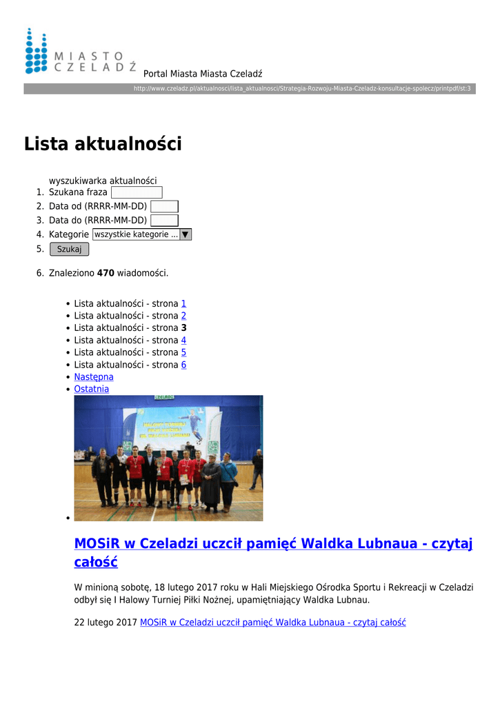 Portal Miasta Miasta Czeladź http://www.czeladz.pl/aktualnosci/lista_aktualnosci/Strategia-Rozwoju-Miasta-Czeladz-konsultacje-spolecz/printpdf/st:3 Lista aktualności wyszukiwarka aktualności 1. Szukana fraza 2. Data od (RRRR-MM-DD) 3. Data do (RRRR-MM-DD) 4. Kategorie wszystkie kategorie ... ▼ 5. Szukaj 6. Znaleziono 470 wiadomości. Lista aktualności - strona 1 Lista aktualności - strona 2 Lista aktualności - strona 3 Lista aktualności - strona 4 Lista aktualności - strona 5 Lista aktualności - strona 6 Następna Ostatnia MOSiR w Czeladzi uczcił pamięć Waldka Lubnaua - czytaj całość W minioną sobotę, 18 lutego 2017 roku w Hali Miejskiego Ośrodka Sportu i Rekreacji w Czeladzi odbył się I Halowy Turniej Piłki Nożnej, upamiętniający Waldka Lubnau. 22 lutego 2017 MOSiR w Czeladzi uczcił pamięć Waldka Lubnaua - czytaj całość Informacja o niebezpiecznym zjawisku - wezbranie rzek czytaj całość IMGW-PIB informuje: Wezbranie z przekroczeniem stanów ostrzegawczych/2 zlewnie: Malej Wisły, Przemszy, Brynicy, Soły (śląskie) 22 lutego 2017 Informacja o niebezpiecznym zjawisku - wezbranie rzek - czytaj całość Studia podyplomowe i szkolenia za darmo? - czytaj całość Podnieś kwalifikacje swoich pracowników. Pokaż pracodawcy, że warto inwestować w rozwój kadr. Teraz możesz liczyć nawet na 100% dofinansowania studiów podyplomowych i szkoleń z Krajowego Funduszu Szkoleniowego. 21 lutego 2017 Studia podyplomowe i szkolenia za darmo? - czytaj całość Komunikat dotyczący jakości powietrza - czytaj całość Komunikat dotyczący jakości powietrza w województwie śląskim 21 lutego 2017 Komunikat dotyczący jakości powietrza - czytaj całość Prognoza niebezpiecznych zjawisk meteorologicznych roztopy - czytaj całość Komunikat dotyczący niebezpiecznych zjawisk meteorologicznych 21 lutego 2017 Prognoza niebezpiecznych zjawisk meteorologicznych - roztopy - czytaj całość Konsultacje społeczne: wdrożenie platformy aplikacji cyfrowych - czytaj całość Konsultacje społeczne dotyczące złożenia wniosku o dofinansowanie w ramach Regionalnego Programu Operacyjnego Województwa Śląskiego na lata 2014-2020, który obejmować będzie wdrożenie platformy aplikacji cyfrowych i e-usług w zakresie zarządzania rozwojem przestrzennym i środowiskiem w mieście Czeladź. 21 lutego 2017 Konsultacje społeczne: wdrożenie platformy aplikacji cyfrowych - czytaj całość Wspomnienie "Dzieci Potulic" - czytaj całość 20 lutego 2017 roku pod obeliskiem upamiętniającym powrót 54 czeladzkich dzieci z obozu w Potulicach, odbyły się obchody 72. rocznicy tego wydarzenia. 20 lutego 2017 Wspomnienie "Dzieci Potulic" - czytaj całość III Turniej Grand Prix Czeladzi w Badmintonie - czytaj całość 19 lutego 2017 r. w hali MOSiR w Czeladzi odbył się trzeci z pięciu turniejów Grand Prix Czeladzi w badmintonie 2016/2017. 20 lutego 2017 III Turniej Grand Prix Czeladzi w Badmintonie - czytaj całość Powiadomienie o jakości powietrza w województwie śląskim - czytaj całość Wojewódzki Inspektorat Ochrony Środowiska w Katowicach informuje o jakości powietrza w województwie śląskim w dniach 19-21.02.2017 r. 20 lutego 2017 Powiadomienie o jakości powietrza w województwie śląskim - czytaj całość Zmarł Daniel Normand - czytaj całość Z wielkim smutkiem zawiadamiamy, że po długiej i ciężkiej chorobie zmarł Daniel Normand Honorowy Obywatel Naszego Miasta 18 lutego 2017 Zmarł Daniel Normand - czytaj całość Lista aktualności - strona 1 Lista aktualności - strona 2 Lista aktualności - strona 3 Lista aktualności - strona 4 Lista aktualności - strona 5 Lista aktualności - strona 6 Następna Ostatnia