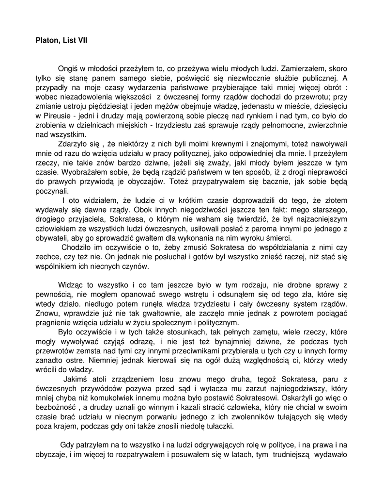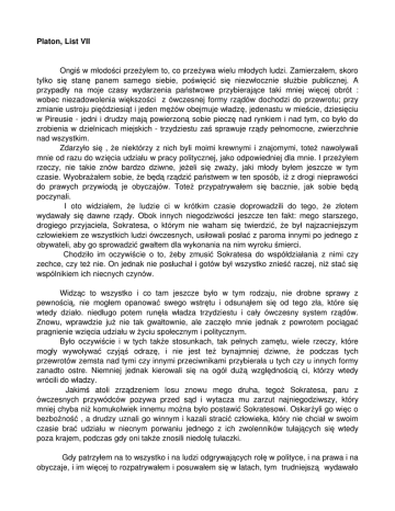 Platon, List VII Ongiś w młodości przeżyłem to, co przeżywa wielu młodych ludzi. Zamierzałem, skoro tylko się stanę panem samego siebie, poświęcić się niezwłocznie służbie publicznej. A przypadły na moje czasy wydarzenia państwowe przybierające taki mniej więcej obrót : wobec niezadowolenia większości z ówczesnej formy rządów dochodzi do przewrotu; przy zmianie ustroju pięćdziesiąt i jeden mężów obejmuje władzę, jedenastu w mieście, dziesięciu w Pireusie jedni i drudzy mają powierzoną sobie pieczę nad rynkiem i nad tym, co było do zrobienia w dzielnicach miejskich trzydziestu zaś sprawuje rządy pełnomocne, zwierzchnie nad wszystkim. Zdarzyło się , że niektórzy z nich byli moimi krewnymi i znajomymi, toteż nawoływali mnie od razu do wzięcia udziału w pracy politycznej, jako odpowiedniej dla mnie. I przeżyłem rzeczy, nie takie znów bardzo dziwne, jeżeli się zważy, jaki młody byłem jeszcze w tym czasie. Wyobrażałem sobie, że będą rządzić państwem w ten sposób, iż z drogi nieprawości do prawych przywiodą je obyczajów. Toteż przypatrywałem się bacznie, jak sobie będą poczynali. I oto widziałem, że ludzie ci w krótkim czasie doprowadzili do tego, że złotem wydawały się dawne rządy. Obok innych niegodziwości jeszcze ten fakt: mego starszego, drogiego przyjaciela, Sokratesa, o którym nie waham się twierdzić, że był najzacniejszym człowiekiem ze wszystkich ludzi ówczesnych, usiłowali posłać z paroma innymi po jednego z obywateli, aby go sprowadzić gwałtem dla wykonania na nim wyroku śmierci. Chodziło im oczywiście o to, żeby zmusić Sokratesa do współdziałania z nimi czy zechce, czy też nie. On jednak nie posłuchał i gotów był wszystko znieść raczej, niż stać się wspólnikiem ich niecnych czynów. Widząc to wszystko i co tam jeszcze było w tym rodzaju, nie drobne sprawy z pewnością, nie mogłem opanować swego wstrętu i odsunąłem się od tego zła, które się wtedy działo. niedługo potem runęła władza trzydziestu i cały ówczesny system rządów. Znowu, wprawdzie już nie tak gwałtownie, ale zaczęło mnie jednak z powrotem pociągać pragnienie wzięcia udziału w życiu społecznym i politycznym. Było oczywiście i w tych także stosunkach, tak pełnych zamętu, wiele rzeczy, które mogły wywoływać czyjąś odrazę, i nie jest też bynajmniej dziwne, że podczas tych przewrotów zemsta nad tymi czy innymi przeciwnikami przybierała u tych czy u innych formy zanadto ostre. Niemniej jednak kierowali się na ogół dużą względnością ci, którzy wtedy wrócili do władzy. Jakimś atoli zrządzeniem losu znowu mego druha, tegoż Sokratesa, paru z ówczesnych przywódców pozywa przed sąd i wytacza mu zarzut najniegodziwszy, który mniej chyba niż komukolwiek innemu można było postawić Sokratesowi. Oskarżyli go więc o bezbożność , a drudzy uznali go winnym i kazali stracić człowieka, który nie chciał w swoim czasie brać udziału w niecnym porwaniu jednego z ich zwolenników tułających się wtedy poza krajem, podczas gdy oni także znosili niedolę tułaczki. Gdy patrzyłem na to wszystko i na ludzi odgrywających rolę w polityce, i na prawa i na obyczaje, i im więcej to rozpatrywałem i posuwałem się w latach, tym trudniejszą wydawało mi się rzeczą, abym mógł we właściwy sposób zająć się polityką. Niepodobna przecież działać bez ludzi życzliwych i wiernie oddanych, a odnaleźć dawnych przyjaciół nie było znów tak łatwo nie uznawano już w naszym mieście zwyczajów i urządzeń ustanowionych przez ojców nowe zaś zdobywać stosunki z dnia na dzień niemożliwe było bez większego wysiłku. Psuło się ustawodawstwo i obyczajność publiczna, i to z siłą wzmagającą się w sposób wprost zdumiewający, tak, iż ja, pełen będąc z początku wielkiego zapału do działalności publicznej, patrząc na to i widząc jak wszystko wszędzie gna i pędzi na zatracenie, zacząłem wreszcie odczuwać, że mnie już ogarnia zawrót głowy. Nie przestałem wprawdzie patrzeć i zastanawiać się, czy nie mogłaby przyjść skąd poprawa w tych stosunkach i w ogóle w całokształcie życia państwowego, ale żeby czynnie wystąpić czekałem wciąż znowu na odpowiednie czasy. Wreszcie zrozumiałem, że wszystkie państwa obecne, wszystkie razem wzięte, ile ich jest, źle się rządzą. Prawa ich mianowicie, jeśli nie zastosować tu jakichś wprost nadzwyczajnych zabiegów i jeżeli los nie przyjdzie z pomocą, są już nieomal w beznadziejnym wstanie. Widziałem się zmuszony hołd złożyć prawdziwej filozofii i znać , że z jej wyżyn dopiero można zobaczyć, jak wygląda wszelka sprawiedliwość w polityce i w życiu jednostek; od nieszczęść nie wyzwoli się wcześniej ród ludzi, zanim albo ludzie należycie i prawdziwie miłujący mądrość nie przyjdą do władzy, albo ci, którzy rządzą w państwach, jakimś bożym ulegając wyrokom, nie umiłują istotnie mądrości.