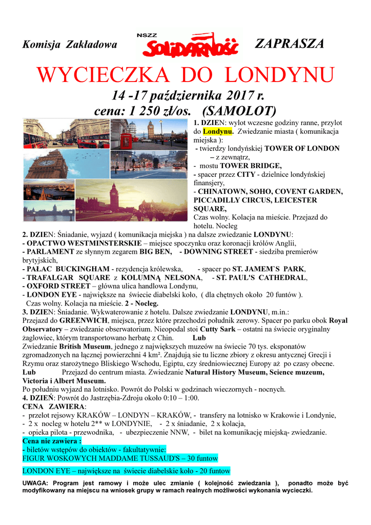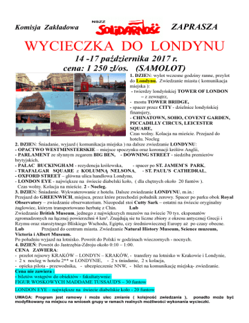 Komisja Zakładowa ZAPRASZA WYCIECZKA DO LONDYNU 14 -17 października 2017 r. cena: 1 250 zł/os. (SAMOLOT) 1. DZIEN: wylot wczesne godziny ranne, przylot do Londynu. Zwiedzanie miasta ( komunikacja miejska ): - twierdzy londyńskiej TOWER OF LONDON – z zewnątrz, - mostu TOWER BRIDGE, - spacer przez CITY - dzielnice londyńskiej finansjery, - CHINATOWN, SOHO, COVENT GARDEN, PICCADILLY CIRCUS, LEICESTER SQUARE, Czas wolny. Kolacja na mieście. Przejazd do hotelu. Nocleg 2. DZIEN: Śniadanie, wyjazd ( komunikacja miejska ) na dalsze zwiedzanie LONDYNU: - OPACTWO WESTMINSTERSKIE – miejsce spoczynku oraz koronacji królów Anglii, - PARLAMENT ze słynnym zegarem BIG BEN, - DOWNING STREET - siedziba premierów brytyjskich, - PAŁAC BUCKINGHAM - rezydencja królewska, - spacer po ST. JAMEM`S PARK, - TRAFALGAR SQUARE z KOLUMNĄ NELSONA, - ST. PAUL'S CATHEDRAL, - OXFORD STREET – główna ulica handlowa Londynu, - LONDON EYE - największe na świecie diabelski koło, ( dla chętnych około 20 funtów ). Czas wolny. Kolacja na mieście. 2 - Nocleg. 3. DZIEN: Śniadanie. Wykwaterowanie z hotelu. Dalsze zwiedzanie LONDYNU, m.in.: Przejazd do GREENWICH, miejsca, przez które przechodzi południk zerowy. Spacer po parku obok Royal Observatory – zwiedzanie obserwatorium. Nieopodal stoi Cutty Sark – ostatni na świecie oryginalny żaglowiec, którym transportowano herbatę z Chin. Lub Zwiedzanie British Museum, jednego z największych muzeów na świecie 70 tys. eksponatów zgromadzonych na łącznej powierzchni 4 km². Znajdują sie tu liczne zbiory z okresu antycznej Grecji i Rzymu oraz starożytnego Bliskiego Wschodu, Egiptu, czy średniowiecznej Europy aż po czasy obecne. Lub Przejazd do centrum miasta. Zwiedzanie Natural History Museum, Science muzeum, Victoria i Albert Museum. Po południu wyjazd na lotnisko. Powrót do Polski w godzinach wieczornych - nocnych. 4. DZIEŃ: Powrót do Jastrzębia-Zdroju około 0:10 – 1:00. CENA ZAWIERA: - przelot rejsowy KRAKÓW – LONDYN – KRAKÓW, - transfery na lotnisko w Krakowie i Londynie, - 2 x nocleg w hotelu 2** w LONDYNIE, - 2 x śniadanie, 2 x kolacja, - opieka pilota - przewodnika, - ubezpieczenie NNW, - bilet na komunikację miejską- zwiedzanie. Cena nie zawiera : - biletów wstępów do obiektów - fakultatywnie: FIGUR WOSKOWYCH MADDAME TUSSAUD'S – 30 funtow LONDON EYE – największe na świecie diabelskie koło - 20 funtow UWAGA: Program jest ramowy i może ulec zmianie ( kolejność zwiedzania ), ponadto może być modyfikowany na miejscu na wniosek grupy w ramach realnych możliwości wykonania wycieczki.