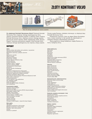 Z¸OTY KONTRAKT VOLVO Niebieski Srebrny Z∏oty: Na obs∏ug´ zapobiegawczà i naprawy pojazdów Co obejmuje Kontrakt Serwisowy Volvo? Niebieski Kontrakt Serwisowy Volvo obejmuje obs∏ug´ zapobiegawczà, która zapewni utrzymanie Paƒstwa pojazdu w idealnym stanie. Srebrny Kontrakt Serwisowy Volvo, obejmuje zarówno obs∏ug´ zapobiegawczà jak równie˝ naprawy uk∏adu nap´dowego (silnik, skrzynia biegów i elementy przeniesienia nap´du). Z∏oty Kontrakt Volvo obejmuje obs∏ug´ zapobiegawczà oraz naprawy ca∏ego pojazdu. Poni˝ej znajdà Paƒstwo, dok∏adne informacje, co obejmuje dany Kontrakt Serwisowy Volvo. Podstawowe czynnoÊci, które sà obj´te Z∏otym Kontraktem Volvo, mo˝na rozszerzyç w taki sposób, by odpowiada∏ on dok∏adnie Paƒstwa indywidualnym potrzebom. Wyszczególnione us∏ugi dodatkowe, znajdà Paƒstwo na koƒcu nast´pnej strony. NAPRAWY Silnik G∏owica silnika, blok silnika, tulei cylindrów i uszczelnieƒ Obudowa ko∏a zamachowego Mechanizm zaworowy i pokrywa zaworów T∏oki Mechanizm rozrzàdu Wa∏ek rozrzàdu Mechanizm korbowy Korbowody i ∏o˝yska Pompa olejowa i ch∏odnica oleju Pompa paliwowa Pompa wtryskowa Kolektory ssania i wydechu Hamulec silnikowy (VEB) Turbospr´˝arka do∏adowujàca Ch∏odnica Pompa czynnika ch∏odzàcego Wentylator Ch∏odnica mi´dzystopniowa (intercooler) Elektroniczny uk∏ad sterowania (ECU)silnikiem Elektryczna nagrzewnica wst´pna powietrza Obudowa przystawki odbioru mocy Automatyczna skrzynia biegów Powertonic/Geatronic/l-shift Uk∏ad „turbo compound” Pompowtryskiwacze T∏umik wydechu i rura wydechowa Filtr odpylajàcy (CRT) Pasek wentylatora Przewody gi´tkie uk∏adu ch∏odzenia Ko∏o zamachowe Przeniesienie nap´du Obudowa skrzyni biegów Obudowa sprz´g∏a Elektroniczny uk∏ad sterowania (ECU) skrzynià biegów Ko∏a z´bate, ∏o˝yska, wa∏y Wide∏ki zmiany biegów Elementy synchronizujàce Pompa olejowa i ch∏odnica oleju Tarcza dociskowa sprz´g∏a Tarcza sprz´g∏a ¸o˝ysko oporowe Si∏ownik sprz´g∏a Dêwignia zmiany biegów i wspornik skrzyni biegów Blok p´dny Wa∏ p´dny Obudowa mechanizmu ró˝nicowego Blokada mechanizmu ró˝nicowego Przednia i tylna os∏ona pó∏osi Pó∏osie Zwolnice w piastach Uk∏ad elektryczny Akumulator Alternator Rozrusznik Tachograf Infosystem Przekaêniki Elektroniczne uk∏ady sterowania (ECU) Wiàzki przewodów Przyrzàdy tablicy rozdzielczej Silnik wycieraczek szyb G∏ówna skrzynia rozdzielcza Hamulce Tarcze hamulcowe B´bny hamulcowe Zawory hamulcowe Przewody hamulcowe Zawór czujnika hamulca Spr´˝arka Osuszacz powietrza Uk∏ad sterowania ABS Zawory hamulcowe ABS Czujnik uk∏adu ABS Zawieszenie kó∏ i uk∏ad kierowniczy Zwrotnica uk∏adu kierowniczego Âruby kó∏ Tuleje stabilizatora Tuleje drà˝ka „V” Przek∏adnia kierownicza Ci´g∏o i drà˝ek kierowniczy wzd∏u˝ny Podnoszenie osi wleczonej i pompa Wspornik tylnych osi Pompa uk∏adu wspomagania kierowania Volvo immobilizer Podwozie, spr´˝yny, amortyzator i ko∏a Poduszki powietrzne Elektrozawory i zawory regulacji poziomu Przewody powietrzne Amortyzatory Mieszki powietrza Piasty i ∏o˝yska kó∏ Centralne smarowanie Kabina i wn´trze Klimatyzacja Spr´˝arka uk∏adu klimatyzacji Wymiennik kabiny Fotel kierowcy Szyberdach Lusterka wsteczne i ogrzewanie Mechanizm okna Regulacja ogrzewania OBS¸UGA ZAPOBIEGAWCZA Smarowanie, sprawdzenie poziomu oleju i p∏ynu Smarowanie podwozia Smarowanie kabiny Sprawdzenie poziomu oleju w poszczególnych komorach i wymiana filtrów Wymiana oleju silnikowego i filtra Wymiana oleju przek∏adniowego i filtra Wymiana oleju w tylnym moÊcie wymiana filtra w uk∏adzie wspomagania uk∏adu kierowniczego Sprawdzenie poziomu p∏ynów w poszczególnych komorach Sprawdzenie osuszacza powietrza Kabina kierowcy Sprawdzenie wskaêników Êwietlnych, informacyjnych i ostrzegawczych Sprawdzenie kodów b∏´du poszczególnych urzàdzeƒ Sprawdzenie dzia∏ania ogrzewacza parkingowego Sprawdzenie sterowania silnikiem z kabiny Sprawdzenie dêwigni zwalniacza Uruchomienie silnika i sprawdzenie elementu rozruchowego Sprawdzenie ciÊnienia roz∏àczenia i po∏àczenia w regulatorze ciÊnienia Sprawdzenie dzia∏ania i stanu spr´˝arki Sprawdzenie uk∏adu hamulcowego Sprawdzenie hamulca r´cznego i zaworu odcinajàcego Sprawdzenie uk∏adu dêwigni zmiany biegów i peda∏u sprz´g∏a Sprawdzenie podnoszenia osi wleczonej Sprawdzenie zawiasów, ograniczników otwarcia drzwi, zamków i uszczelek Sprawdzenie spr´˝arki uk∏adu wentylacji Sprawdzenie wentylatora sch∏adzacza Próba ciÊnieniowa uk∏adu ch∏odzenia Sprawdzenie sch∏adzacza czynnika ch∏odzàcego Sprawdzenie ch∏odnicy i wentylatora ch∏odnicy Sprawdzenie ch∏odnicy mi´dzystopniowej (intercooler) Sprawdzenie uszczelnieƒ, w´˝y, przewodów sztywnych i linii Sprawdzenie szczelnoÊci uk∏adu wydechowego Sprawdzenie uk∏adu wspomagania kierownicy Sprawdzenie uk∏adu powietrza mi´dzy wlotem powietrza i uk∏adem turbospr´˝arki Sprawdzenie turbospr´˝arki i regulatora EP Sprawdzenie sprz´gu pompy wtryskowej Sprawdzenie szczelnoÊci pompy serwomechanizmu, przewdów olejowych i mechanizmu kierowniczego Sprawdzenie ekranów akustycznych silnika Sprawdzenie luzów zaworowych Sprawdzenie luzu pompowtryskiwaczy Zawieszenie przednie, mechanizm kierowniczy Sprawdzenie mieszków ochronnych i luzu przegubów kulistych Sprawdzenie drà˝ków kierowniczych Sprawdzenie przednich amortyzatorów Sprawdzenie ∏o˝yska zwrotnicy uk∏adu kierowniczego Sprawdzenie ∏o˝ysk kó∏ przednich Sprawdzenie kó∏ przednich Elementy zewn´trzne Sprawdzenie lamp, wycieraczek, i spryskiwaczy Sprawdzenie lusterek wstecznych i reflektorów Wymiana filtra powietrza uk∏adu wentylacji kabiny Sprawdzenie zbiornika czynnika ch∏odzàcego, skraplacza przewodów sztywnych i w´˝y Sprawdzenie wlotu powietrza i przegrody kierujàcej Sprawdzenie mocowania kabiny, uk∏adu hydraulicz