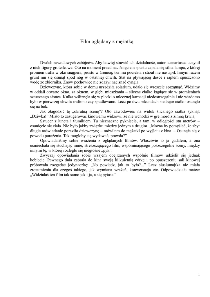 Film oglądany z mężatką Dwóch zawodowych zabójców. Aby łatwiej strawić ich działalność, autor scenariusza uczynił z nich figury groteskowe. Oto na moment przed naciśnięciem spustu zapala się silna lampa, z której promień trafia w oko snajpera, prosto w źrenicę; łza mu pociekła i strzał nie nastąpił. Innym razem grunt mu się osunął spod nóg w ostatniej chwili. Stał na pływającej desce i raptem spuszczono wodę ze zbiornika. Znów pechowiec nie zdążył nacisnąć cyngla. Dziewczynę, która sobie w domu urządziła solarium, udało się wreszcie sprzątnąć. Widzimy w oddali otwarte okno, za oknem, w głębi mieszkania – śliczne ciałko kąpiące się w promieniach sztucznego słońca. Kulka wśliznęła się w plecki o mlecznej karnacji niedostrzegalnie i nie wiadomo było w pierwszej chwili: trafiono czy spudłowano. Lecz po dwu sekundach siedzące ciałko osunęło się na bok. Jak złagodzić tę „okrutną scenę”? Oto zawodowiec na widok ślicznego ciałka syknął: „Dziwka!” Miało to zasugerować kinowemu widzowi, że nie wchodzi w grę mord z zimną krwią. Sztucer z lunetą i tłumikiem. Tu nieznaczne pyknięcie, a tam, w odległości stu metrów – osunięcie się ciała. Nie było jakby związku między jednym a drugim. „Można by pomyśleć, że zbyt długie naświetlanie poraziło dziewczynę – mówiłem do mężatki po wyjściu z kina. – Osunęła się z powodu porażenia. Tak mogłoby się wydawać, prawda?” Opowiadaliśmy sobie wrażenia z oglądanych filmów. Właściwie to ja gadałem, a ona uśmiechała się słuchając mnie, streszczającego film, wspominającego poszczególne sceny, między innymi tę, w której rozległo się niegłośne „pyk”. Zwyczaj opowiadania sobie wzajem obejrzanych wspólnie filmów udzielił się jednak kobiecie. Pewnego dnia zabrała do kina swoją kilkuletnią córkę i po opuszczeniu sali kinowej próbowała rozgadać jedynaczkę: „No powiedz, jak to było?...” Lecz siusiumajtka nie miała zrozumienia dla czegoś takiego, jak wymiana wrażeń, konwersacja etc. Odpowiedziała matce: „Widziałaś ten film tak samo jak i ja, a się pytasz.” 1
