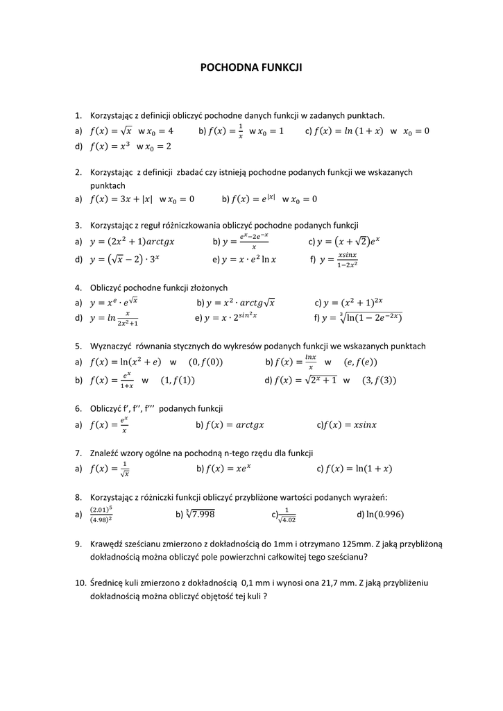 POCHODNA FUNKCJI 1. Korzystając z definicji obliczyć pochodne danych funkcji w zadanych punktach. a) ( ) d) ( ) √ b) ( ) w c) ( ) w ( ) w w 2. Korzystając z definicji zbadać czy istnieją pochodne podanych funkcji we wskazanych punktach a) ( ) w b) ( ) w 3. Korzystając z reguł różniczkowania obliczyć pochodne podanych funkcji a) ( d) (√ ) ) b) c) e) f) ( √ ) 4. Obliczyć pochodne funkcji złożonych √ a) √ b) d) e) c) ( ) f) √ ( ) 5. Wyznaczyć równania stycznych do wykresów podanych funkcji we wskazanych punktach a) ( ) b) ( ) ( ) w w ( ( ( )) ( )) b) ( ) d) ( ) w √ ( ( )) w ( ( )) ( ) 6. Obliczyć f’, f’’, f’’’ podanych funkcji ( ) a) b) ( ) c) ( ) 7. Znaleźć wzory ogólne na pochodną n-tego rzędu dla funkcji ( ) a) b) ( ) √ c) ( ) 8. Korzystając z różniczki funkcji obliczyć przybliżone wartości podanych wyrażeń: a) ( ( ) ) b) √ c) √ d) ( ) 9. Krawędź sześcianu zmierzono z dokładnością do 1mm i otrzymano 125mm. Z jaką przybliżoną dokładnością można obliczyć pole powierzchni całkowitej tego sześcianu? 10. Średnicę kuli zmierzono z dokładnością 0,1 mm i wynosi ona 21,7 mm. Z jaką przybliżeniu dokładnością można obliczyć objętość tej kuli ?