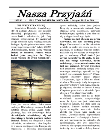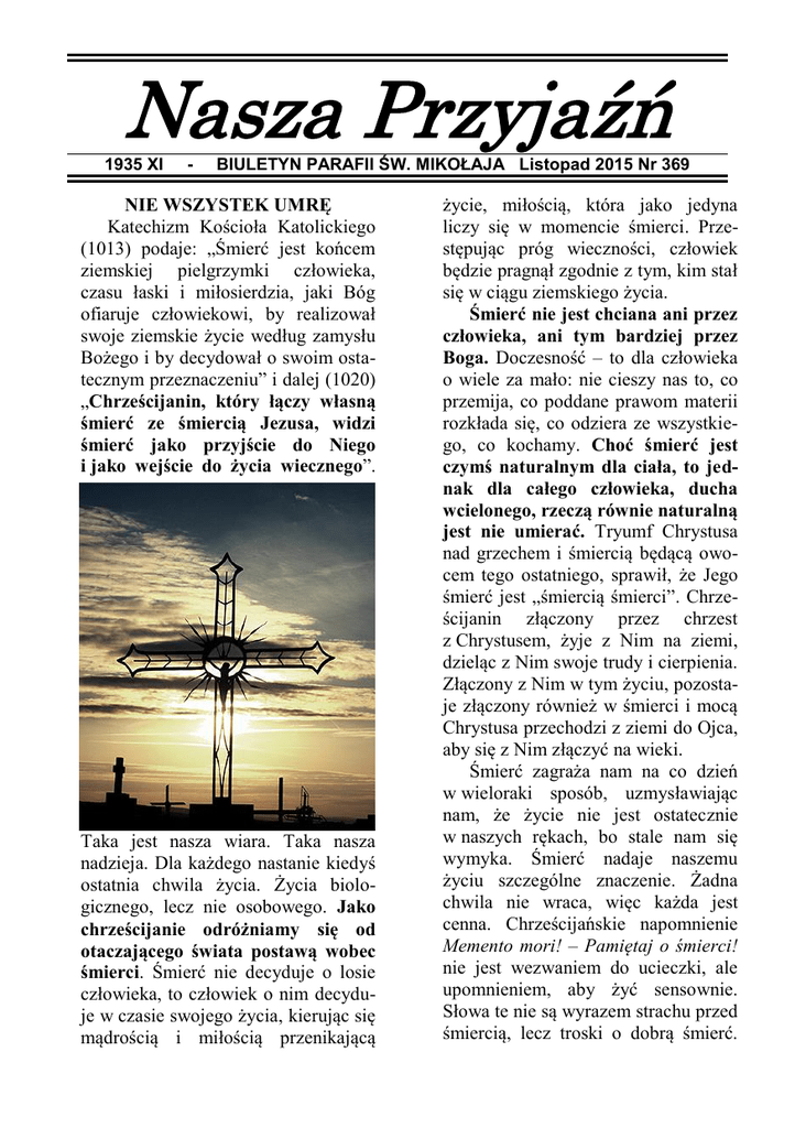 Nasza Przyjaźń 1935 XI - BIULETYN PARAFII ŚW. MIKOŁAJA Listopad 2015 Nr 369 NIE WSZYSTEK UMRĘ Katechizm Kościoła Katolickiego (1013) podaje: „Śmierć jest końcem ziemskiej pielgrzymki człowieka, czasu łaski i miłosierdzia, jaki Bóg ofiaruje człowiekowi, by realizował swoje ziemskie życie według zamysłu Bożego i by decydował o swoim ostatecznym przeznaczeniu” i dalej (1020) „Chrześcijanin, który łączy własną śmierć ze śmiercią Jezusa, widzi śmierć jako przyjście do Niego i jako wejście do życia wiecznego”. Taka jest nasza wiara. Taka nasza nadzieja. Dla każdego nastanie kiedyś ostatnia chwila życia. Życia biologicznego, lecz nie osobowego. Jako chrześcijanie odróżniamy się od otaczającego świata postawą wobec śmierci. Śmierć nie decyduje o losie człowieka, to człowiek o nim decyduje w czasie swojego życia, kierując się mądrością i miłością przenikającą życie, miłością, która jako jedyna liczy się w momencie śmierci. Przestępując próg wieczności, człowiek będzie pragnął zgodnie z tym, kim stał się w ciągu ziemskiego życia. Śmierć nie jest chciana ani przez człowieka, ani tym bardziej przez Boga. Doczesność – to dla człowieka o wiele za mało: nie cieszy nas to, co przemija, co poddane prawom materii rozkłada się, co odziera ze wszystkiego, co kochamy. Choć śmierć jest czymś naturalnym dla ciała, to jednak dla całego człowieka, ducha wcielonego, rzeczą równie naturalną jest nie umierać. Tryumf Chrystusa nad grzechem i śmiercią będącą owocem tego ostatniego, sprawił, że Jego śmierć jest „śmiercią śmierci”. Chrześcijanin złączony przez chrzest z Chrystusem, żyje z Nim na ziemi, dzieląc z Nim swoje trudy i cierpienia. Złączony z Nim w tym życiu, pozostaje złączony również w śmierci i mocą Chrystusa przechodzi z ziemi do Ojca, aby się z Nim złączyć na wieki. Śmierć zagraża nam na co dzień w wieloraki sposób, uzmysławiając nam, że życie nie jest ostatecznie w naszych rękach, bo stale nam się wymyka. Śmierć nadaje naszemu życiu szczególne znaczenie. Żadna chwila nie wraca, więc każda jest cenna. Chrześcijańskie napomnienie Memento mori! – Pamiętaj o śmierci! nie jest wezwaniem do ucieczki, ale upomnieniem, aby żyć sensownie. Słowa te nie są wyrazem strachu przed śmiercią, lecz troski o dobrą śmierć. „Od nagłej i niespodziewanej śmierci wybaw nas Panie” błagamy Boga w starożytnej litanii do Wszystkich Świętych. Jest w tej prośbie przekonanie, że człowiek powinien być na swoją śmierć przygotowany, powinien przyjmować ją świadomie. I jak całym życiem może wielbić Boga, tak i swoją śmiercią powinien Go uwielbić, pozostawiając jednocześnie świadectwo swoim braciom. Chociaż wiara w Zmartwychwstanie Chrystusa i nasze wraz z Nim, jest nam bliska, to jednak fakt śmierci pozostaje dla każdego z nas dramatycznie trudnym doświadczeniem. Nie możemy przewidzieć czasu, miejsca ani sposobu umierania, jednak – jak Jezus w Ogrójcu - możemy się modlić o dobrą śmierć. Święta Barbara, święty Józef a zwłaszcza Najświętsza Maryja Panna są uważani w Kościele za szczególnych patronów dobrej i pięknej śmierci, która może stać się cudem utrwalającym na wieki owoce całego naszego życia, czyniąc nas dziećmi Ojca Niebieskiego i braćmi Jezusa Chrystusa. Prośmy, abyśmy mogli doświadczyć w chwili śmierci pomocy miłości braterskiej, abyśmy nie umierali samotni i opuszczeni, abyśmy tęsknotę naszych bliskich wsparli nadzieją na spotkanie. Śmierć nie zrywa więzi miłości i przyjaźni pozostajemy ze sobą związani i pozostajemy w rękach Boga. Dla chrześcijanina, należącego do Chrystusa, który powiedział „Ja żyję, więc i wy żyć będziecie” (J 14,19), grób staje się błogosławionym miejscem oczekiwania na Zmartwychwstanie. W tym oczekiwaniu ofiarujmy za naszych zmarłych Msze św., wypo- minki, modlitwy, różaniec. Byli nam bliscy i pozostają tacy nadal. Pięknie na ten temat powiedział kiedyś kardynał J. Ratzinger: „Jest to świadectwo naszej z nimi solidarności, miłości, pomocy, które przenikają przez bariery śmierci. Od naszej pamięci o zmarłych, czy też zapomnienia, nie zależy wprawdzie ich szczęście wieczne czy też ich potępienie, ale nigdy nie przestają oni potrzebować naszej miłości”. Grażyna Kich *** ODPUSTY ZA ZMARŁYCH 1. ) Wierni, którzy nawiedzą kościół lub kaplicę publiczną 1 lub 2 listopada mogą dostąpić odpustu zupełnego, który może być ofiarowany tylko za zmarłych. Według obowiązujących przepisów mogą uzyskać ten odpust tylko raz w ciągu dnia. W czasie nawiedzenia świątyni należy odmówić Ojcze nasz i Wierzę oraz trzeba wypełnić inne warunki, jak spowiedź sakramentalna, Komunia św. i modlitwa według intencji Ojca Świętego. 2.) Wierni, którzy pobożnie nawiedzą cmentarz i przynajmniej w myśli pomodlą się za zmarłych, zyskują odpust, który może być ofiarowany za dusze w czyśćcu cierpiące; odpust ten w dniach 1 do 8 listopada (włącznie) jest zupełny, w inne dni roku tylko cząstkowy. *** WYPOMINKI JEDNORAZOWE Imiona zmarłych poleconych w wypominkach jednorazowych są wyczytywane w naszym kościele parafialnym w listopadzie. Zachęcamy do wspólnej modlitwy w ich intencji. 2 1 listopada Uroczystość Wszystkich Świętych 1800 procesja 1900 Msza św. Św. Leonard z Porto Maurizio OFM, włoski kaznodzieja z przełomu XVII i XVIII w., napominał, żeby wierni zamawiali Msze święte i to nie tylko w intencji bliskich zmarłych, ale też za samych siebie. Przekonywał, podobnie jak wielu innych świętych, że nie ma skuteczniejszego środka otrzymania łaski dobrej śmierci, czy też skrócenia czasu pokuty w czyśćcu, nad Msze święte i odpusty. Pisał: „O jakże nieszczęśliwi ci, którzy nie umieją cenić wartości Mszy Świętej, lub zmniejszają jej skuteczno
