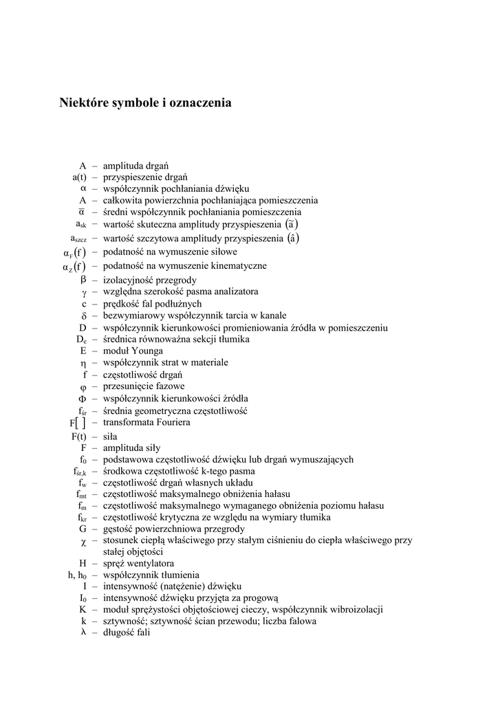 Niektóre symbole i oznaczenia A a(t) α A α ask aszcz α F (f ) α Z (f ) β γ c δ D De E η f ϕ Φ fśr F[ ] F(t) F f0 fśr,k fw fmt fm fkr G χ – – – – – – – – – – – – – – – – – – – – – – – – – – – – – – – – H h, h0 I I0 K k λ – – – – – – – amplituda drgań przyspieszenie drgań współczynnik pochłaniania dźwięku całkowita powierzchnia pochłaniająca pomieszczenia średni współczynnik pochłaniania pomieszczenia a) wartość skuteczna amplitudy przyspieszenia (~ wartość szczytowa amplitudy przyspieszenia (â ) podatność na wymuszenie siłowe podatność na wymuszenie kinematyczne izolacyjność przegrody względna szerokość pasma analizatora prędkość fal podłużnych bezwymiarowy współczynnik tarcia w kanale współczynnik kierunkowości promieniowania źródła w pomieszczeniu średnica równoważna sekcji tłumika moduł Younga współczynnik strat w materiale częstotliwość drgań przesunięcie fazowe współczynnik kierunkowości źródła średnia geometryczna częstotliwość transformata Fouriera siła amplituda siły podstawowa częstotliwość dźwięku lub drgań wymuszających środkowa częstotliwość k-tego pasma częstotliwość drgań własnych układu częstotliwość maksymalnego obniżenia hałasu częstotliwość maksymalnego wymaganego obniżenia poziomu hałasu częstotliwość krytyczna ze względu na wymiary tłumika gęstość powierzchniowa przegrody stosunek ciepłą właściwego przy stałym ciśnieniu do ciepła właściwego przy stałej objętości spręż wentylatora współczynnik tłumienia intensywność (natężenie) dźwięku intensywność dźwięku przyjęta za progową moduł sprężystości objętościowej cieczy, współczynnik wibroizolacji sztywność; sztywność ścian przewodu; liczba falowa długość fali Λ Lp LI LN Lv Lw Lwk Lpk µ µ0 m n N N0 M ω Ω p0 p p(t) psk pu ∆pl ∆pt ∆pc Q Q0 Re Rp Rk ρ0 σ t T Θ τ u Usk Uśr Uszcz v v(t) Vu V w Z ξ – – – – – – – – – – – – – – – – – – – – – – – – – – – – – – – – – – – – – – – – – – – – – – – współczynnik efektywności promieniowania poziom ciśnienia dźwiękowego lub poziom w paśmie poziom intensywności hałasu poziom mocy akustycznej poziom prędkości drgań poziom widmowy poziom widmowy hałasu w k-tym paśmie poziom pasmowy hałasu w k-tym paśmie współczynnik Poissona współczynnik tarcia suchego masa liczba naturalna moc; wskaźnik oceny hałasu moc przyjęta za progową moc na wale maszyny częstość kątowa kąt bryłowy średnie ciśnienie w stanie równowagi ośrodka amplituda ciśnienia fali dźwiękowej ciśnienie fali dźwiękowej wartość skuteczna amplitudy ciśnienia ciśnienie przyjęte za progowe lokalne straty ciśnienia straty ciśnienia spowodowane oporami tarcia o ścianki całkowita strata ciśnienia wydatek amplituda wydatku źródła liczba Reynoldsa; część rzeczywista wyrażenia zespolonego stała przemieszczenia izolacyjność przegrody izolacyjność kożucha naprężenie w ośrodku lub elemencie czas okres drgań; czas uśredniania; temperatura czas życia maszyny; temperatura współczynnik przenikalności przegrody przemieszczenie drgań wartość skuteczna mierzonego procesu wartość średnia mierzonego procesu wartość szczytowa mierzonego procesu amplituda prędkości drgań wartość chwilowa prędkości drgań progowa amplituda prędkości drgań prędkość strumienia gazu lub cieczy grubość warstwy oporność falowa ośrodka współczynnik oporów miejscowych