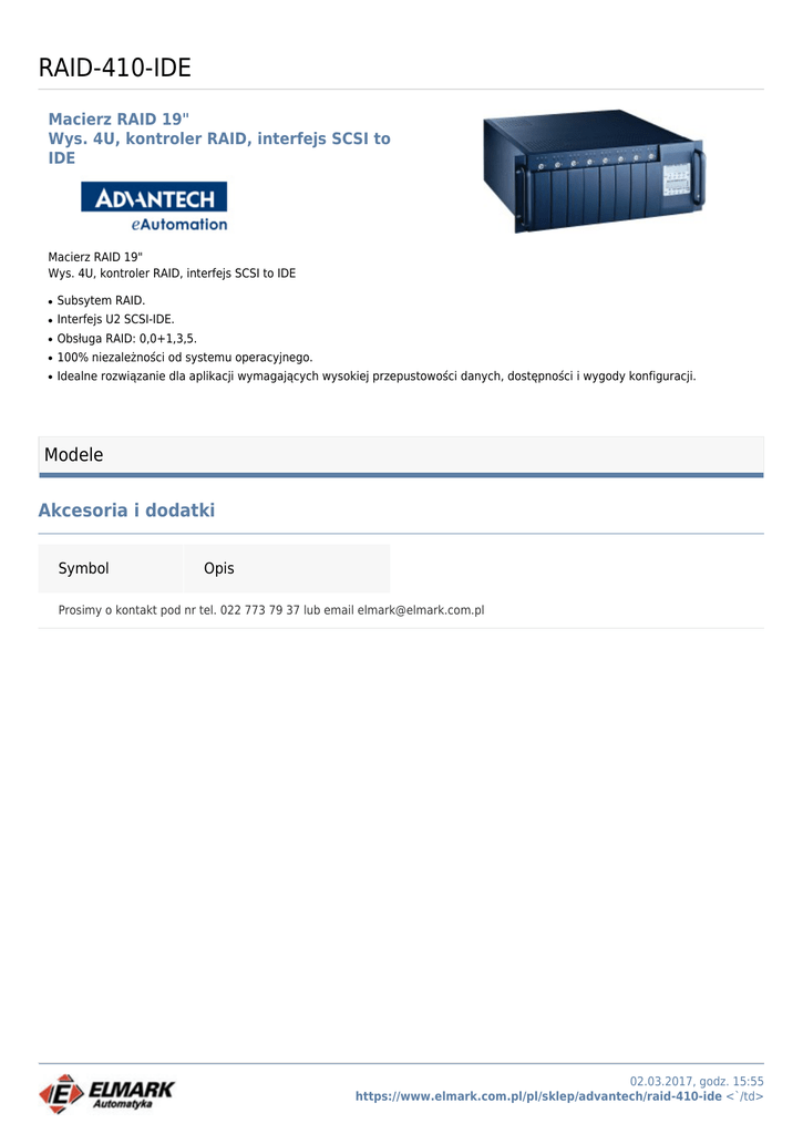 RAID-410-IDE Macierz RAID 19" Wys. 4U, kontroler RAID, interfejs SCSI to IDE Macierz RAID 19" Wys. 4U, kontroler RAID, interfejs SCSI to IDE ● Subsytem RAID. ● Interfejs U2 SCSI-IDE. ● Obsługa RAID: 0,0+1,3,5. ● 100% niezależności od systemu operacyjnego. ● Idealne rozwiązanie dla aplikacji wymagających wysokiej przepustowości danych, dostępności i wygody konfiguracji. Modele Akcesoria i dodatki Symbol Opis Prosimy o kontakt pod nr tel. 022 773 79 37 lub email [email protected] 02.03.2017, godz. 15:55 https://www.elmark.com.pl/pl/sklep/advantech/raid-410-ide <`/td>