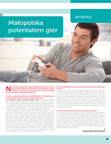 Projekt współfinansowany ze środków Unii Europejskiej w ramach Europejskiego Funduszu Społecznego Małopolska potentatem gier wywiad Fot. 123rf N a światowej mapie gier wideo Małopolska zaczyna się liczyć coraz bardziej. Mamy wykształconych informatyków najwyższej klasy, możemy ich wykorzystać do budowania naszej pozycji w branży – twierdzi Piotr Babieno*. Do celu.eu: Jak ma się branża gier w Małopolsce? Funkcjonuje już i nas Europejskie Centrum Gier – z jakimi sukcesami? Piotr Babieno, prezes zarządu Bloober Team: Europejskie Centrum Gier to klaster, który powstał prawie sześć lat temu. Na początku jego istnienia próbowaliśmy zainteresować władze regionu branżą, co udało się z powodzeniem. Okazuje się bowiem, że to właśnie gry wideo są jednym z najbardziej rozpoznawalnych na świecie towarów eksportowych Polski. To branża, w której polscy twórcy odnoszą coraz większe sukcesy. Obecnie klaster gier zrzesza około dwudziestu podmiotów z branży gier wideo z Małopolski. Pierwszym projektem realizowanym przez klaster było stworzenie Europejskiej Akademii Gier (European Academy of Games), programu studiów podyplomowych i magisterskich uzupełniających w kierunkach, takich jak scenopisarstwo, reżyseria, projektowanie produkcji i mechaniki gier wideo, modelowanie 3D, animacja, a nawet realizacja dźwięku. Wraz z Uniwersytetem Jagiellońskim i z Akademią Górniczo-Hutniczą oraz firmą Nibris Sp. z o.o., która pełni funkcję koordynatora klastra, powołaliśmy do życia Europejską Akademię Gier. Wykładowcy to nie tylko kadra akademicka, ale także praktycy, specjaliści z polskich firm branży gier wideo, którzy dotychczas pracowali przy takich projektach, jak Wiedźmin, Earth 2160, Two Worlds czy Sadness. Można powiedzieć, że jesteśmy już w branży traktowani bardzo poważnie? Jak najbardziej. I cały czas się rozwijamy! Ostatnio krakowska firma Realisty Pump wypuściła na rynek grę, która sprzedała się w 3 mln egzemplarzy. To duży sukces. Bloober Team rozwija współpracę z Sony. Kilka miesięcy temu wydaliśmy tytuł startowy na konsolę PlayStation Vita marki Sony, grę o nazwie A-men, produkcja ukazała się również w wersji na PlayStation 3. Jest jednym z pierwszych na świecie tytułów pozwalających na rozgrywkę między platformami PlayStation 3 i PlayStation Vita. To kolejny sukces. Obecnie, jako Europejskie Centrum Gier pracujemy nieustannie nad badaniami i rozwojem, te prace pozwolą nam w przyszłości umocnić swoją pozycję na rynku. A czy mamy w regionie ludzi, którzy umieją tworzyć gry? Tak. Mamy przecież w Krakowie UJ, AGH, Politechnikę, które każdego roku wypuszczają na rynek świetnych informatyków. Aby tworzyć gry wideo, trzeba mieć specjalistyczne umiejętności i w tym zakresie szkolimy również potrzebnych specjalistów. Bloober Team ma silne zaplecze naukowe, współpracuje z krakowskimi ośrodkami akademickimi – Uniwersytetem Jagiellońskim oraz Akademią Górniczo-Hutniczą. Nasi pracownicy są wykładowcami Europejskiej Akademii Gier, pierwszej w Polsce profesjonalnej szkoły wyższej sprofilowanej pod kątem kompleksowego kształcenia twórców gier wideo. Rozmawiała: Joanna Jałowiec 5