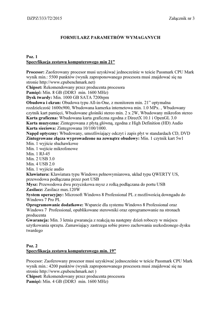 DZPZ/333/72/2015 Załącznik nr 3 FORMULARZ PARAMETRÓW WYMAGANYCH Poz. 1 Specyfikacja zestawu komputerowego min 21” Procesor: Zaoferowany procesor musi uzyskiwać jednocześnie w teście Passmark CPU Mark wynik min.: 5500 punktów (wynik zaproponowanego procesora musi znajdować się na stronie http://www.cpubenchmark.net) Chipset: Rekomendowany przez producenta procesora Pamięć: Min. 8 GB (DDR3 min. 1600 MHz) Dysk twardy: Min. 1000 GB SATA 7200rpm Obudowa i ekran: Obudowa typu All-in-One, z monitorem min. 21” optymalna rozdzielczość 1600x900, Wbudowana kamerka internetowa min. 1.0 MPx. , Wbudowany czytnik kart pamięci, Wbudowane głośniki stereo min. 2 x 2W, Wbudowany mikrofon stereo Karta graficzna: Wbudowana karta graficzna zgodna z DirectX 10.1 i OpenGL 3.0 Karta muzyczna: Zintegrowana z płytą główną, zgodna z High Definition (HD) Audio Karta sieciowa: Zintegrowana 10/100/1000. Napęd optyczny: Wbudowany, umożliwiający odczyt i zapis płyt w standardach CD, DVD Zintegrowane złącza wyprowadzone na zewnątrz obudowy: Min. 1 czytnik kart 5w1 Min. 1 wyjście słuchawkowe Min. 1 wejście mikrofonowe Min. 1 RJ-45 Min. 2 USB 3.0 Min. 4 USB 2.0 Min. 1 wyjście audio Klawiatura: Klawiatura typu Windows pełnowymiarowa, układ typu QWERTY US, przewodowa podłączana przez port USB Mysz: Przewodowa dwu przyciskowa mysz z rolką podłączana do portu USB Zasilacz: Zasilacz max.120W System operacyjny: Microsoft Windows 8 Professional PL z możliwością downgadu do Windows 7 Pro PL Oprogramowanie dodatkowe: Wsparcie dla systemu Windows 8 Professional oraz Windows 7 Professional, opublikowane sterowniki oraz oprogramowanie na stronach producenta Gwarancja: Min. 3 letnia gwarancja z reakcją na następny dzień roboczy w miejscu użytkowania sprzętu. Zamawiający zastrzega sobie prawo zachowania uszkodzonego dysku twardego Poz. 2 Specyfikacja zestawu komputerowego min. 19” Procesor: Zaoferowany procesor musi uzyskiwać jednocześnie w teście Passmark CPU Mark wynik min.: 4200 punktów (wynik zaproponowanego procesora musi znajdować się na stronie http://www.cpubenchmark.net ) Chipset: Rekomendowany przez producenta procesora Pamięć: Min. 4 GB (DDR3 min. 1600 MHz) Dysk twardy: Min. 500 GB SATA 7200rpm Obudowa i ekran: Obudowa typu All-in-One, z monitorem min. 19,5” optymalna rozdzielczość 1600x900, Wbudowana kamerka internetowa min. 1.0 MPx., Wbudowany czytnik kart pamięci, Wbudowane głośniki stereo min. 2 x 2W, Wbudowany mikrofon stereo Karta graficzna: Wbudowana karta graficzna zgodna z DirectX 10.1 i OpenGL 3.0 Karta muzyczna: Zintegrowana z płytą główną, zgodna z High Definition (HD) Audio Karta sieciowa: Zintegrowana 10/100/1000 Napęd optyczny: Wbudowany, umożliwiający odczyt i zapis płyt w standardach CD, DVD Zintegrowane złącza wyprowadzone na zewnątrz obudowy: Min. 1 czytnik kart 5w1 Min. 1 wyjście słuchawkowe Min. 1 wejście mikrofonowe Min. 1 DisplayPort Min. 1 RJ-45 Min. 2 USB 3.0 Min. 4 USB 2.0 Min. 1 wyjście audio Min. 1 port szeregowy Klawiatura: Klawiatura typu Windows pełnowymiarowa, układ typu QWERTY US, przewodowa podłączana przez port USB Mysz: Przewodowa dwu przyciskowa mysz z rolką podłączana do portu USB Zasilacz: Zasilacz max.120W System operacyjny: Microsoft Windows 8 Professional PL z możliwością downgadu do Windows 7 Pro PL Oprogramowanie dodatkowe: Wsparcie dla systemu Windows 8 Professional oraz Windows 7 Professional, opublikowane sterowniki oraz oprogramowanie na stronach producenta. Gwarancja: Min. 3 letnia gwarancja z reakcją na następny dzień roboczy w miejscu użytkowania sprzętu. Zamawiający zastrzega sobie prawo zachowania uszkodzonego dysku twardego. Poz. 3 Specyfikacja drukarki laserowej Prędkość druku w czerni A4: Do 18 str./min Rozdzielczość druku w czerni (najwyższa): Do 600 x 600 dpi Drukowanie dwustronne: Ręczny Liczba wkładów drukujących: 1 (czarny) Technologia druku: Druk laserowy Języki drukowania: Drukowanie z komputera Normatywny cykl pracy (miesięcznie, format A4): Do 5000 stron Zalecana ilość stron drukowanych miesięcznie: 250 – 1500 Podajnik papieru: podajnik na min. 150 arkuszy Standardowa pojemność odbiornika papieru: Odbiornik papieru na min. 100 arkuszy Nośniki: Papier (do druku laserowego, zwykły, fotograficzny, szorstki, welinowy), koperty, etykiety, kartony, folie, pocztówki Obsługiwane formaty nośników: A4; A5; A6; B5; Pocztówki; Koperty (C5, DL, B5) Porty: port USB 2.0 Hi-Speed Szybkość procesora: Min. 266 MHz Standardowa pojemność pamięci: Min. 2 MB Obsługiwane systemy operacyjne: Windows 8, Windows 7 (32-bit/64-bit), Windows Vista (32-bit/64-bit), Windows XP (32-bit/64-bit), Windows Server 2008 (32-bit/64-bit), Windows Server 2003 (32-bit/64-bit); Mac OS X v10.4, v10.5, v10.6; Gwarancja: Min. 1 rok Dodatkowo: Kabel USB,Oryginalny zapasowy toner tego samego producenta, co drukarka Poz. 4 Funkcje i specyfikacje drukarki atramentowej kolorowej Typ drukarki: Kolor Funkcje: Drukowanie, Kopiowanie i skanowanie, Faksowanie Wyświetlacz: LCD Maksymalny rozmiar papieru: A4 Pamięć: min. 64MB Technologia: Atramentowa Połączenie: Sieć bezprzewodowa Interfejs USB: High Speed USB 2.0 Interfejs sieci bezprzewodowej 802.11b/g/n Kopiowanie Rozdzielczość: Do 1200 x 2400dpi (kolor i mono) Wymiary: max. 435 x 375 x 200 mm (szer. x gł. x wys.) Faksowanie: Faks-modem 14.4 kb/s Specyfikacje nośników Typy i gramatury: A4, A5, A6, LTR, EXE, LGR, LGL, Folio, Photo 10cm x 15cm, Envelope, Indexcard. Sieć: Sieć bezprzewodowa: 802.11b/g/n Systemy operacyjne i oprogramowanie: Obsługiwane Windows® 8/8.1 (32bit(x86) & 64bit(x64) editions), Windows® 7 (32bit(x86) & 64bit(x64) editions), Windows Vista® (32bit(x86) & 64bit(x64) editions), Windows® XP Professional (32bit(x86) & 64bit(x64) editions), Windows® XP Home, Windows Server® 2003, 2003 R2 & 2008 (32bit(x86) & 64bit(x64) editions), Windows Server® 2008 R2 & 2012 (64bit(x64) edition) Mac OS X v10.6.8, 10