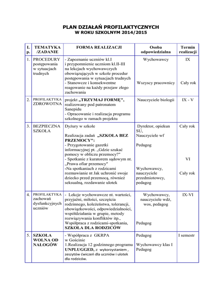 PLAN DZIAŁAŃ PROFILAKTYCZNYCH W ROKU SZKOLNYM 2014/2015 L TEMATYKA p. /ZADANIE FORMA REALIZACJI Osoba odpowiedzialna Termin realizacji 1. PROCEDURY postępowania w sytuacjach trudnych - Zapoznanie uczniów kl.I i przypomnienie uczniom kl.II-III na lekcjach wychowawczych obowiązujących w szkole procedur postępowania w sytuacjach trudnych - Stanowcze i konsekwentne reagowanie na każdy przejaw złego zachowania Wychowawcy IX Wszyscy pracownicy Cały rok 2. PROFILAKTYKA projekt „TRZYMAJ FORMĘ", ZDROWOTNA realizowany pod patronatem Sanepidu - Opracowanie i realizacja programu szkolnego w ramach projektu Nauczyciele biologii IX - V 3. BEZPIECZNA Dyżury w szkole SZKOŁA Realizacja zadań „SZKOŁA BEZ PRZEMOCY": - Przygotowanie gazetki informacyjnej pt. „Gdzie szukać pomocy w obliczu przemocy?" - Spotkanie z kuratorem sądowym nt. „Prawa ofiar przemocy" -Na spotkaniach z rodzicami rozmawianie nt Jak uchronić swoje dziecko przed przemocą, również seksualną, rozdawanie ulotek Dyrektor, opiekun SU, Nauczyciele wf Pedagog VI Wychowawcy, nauczyciele przedmiotowcy, pedagog 4. PROFILAKTYKA zachowań dysfunkcyjnych uczniów - Lekcje wychowawcze nt. wartości, Wychowawcy, przyjaźni, miłości, szczęścia nauczyciele wdż, rodzinnego, koleżeństwa, tolerancji, wos, pedagog obowiązkowości, odpowiedzialności, współdziałania w grupie, metody rozwiązywania konfliktów itp., Współpraca z rodzicami-spotkania, Pedagog SZKOŁA DLA RODZICÓW 5. SZKOŁA WOLNA OD NAŁOGÓW - Współpraca z GKRPA Pedagog w Gościnie 1.Realizacja 12 godzinnego programu Wychowawcy klas I Pedagog UNPLUGGED, z wykorzystaniem , zeszytów dwiczeo dla uczniów i ulotek dla rodziców. Cały rok Cały rok IX-VI I semestr 2.Młodzi- alkohol- ryzyko i co z tym można zrobić?. Pedagog II semestr „Mity alkoholowe”. Dlaczego dzieci i młodzież sięgają po substancje zmieniające świadomośd. Spotkania z pedagogiem szkolnym 3.Kampania -NARKOTYKI, TO MNIE NIE KRĘCI 4. Współpraca z Sanepidemprezentacja nt DOPALACZE Pedagog Pedagog 5.Realizacja programu ZNAJDZ Wychowawcy WŁAŚCIWE ROZWIĄZANIE -Określenie rzeczywistych powodów palenia papierosów. Szukanie argumentów przeciw paleniu. Informacje na tablicy pedagoga, PCK 6 Światowy Dzień bez Papierosa -20 XI - Wykonanie gazetki tematycznej na korytarzu szkolnym - Na lekcjach wychowawczych przeprowadzenie debaty nt. „Za i przeciw paleniu" Pedagog XI Wychowawcy 7. PRAWA - Zajęcia w klasach I-III I OBOWIĄZKI UCZNIA wychowawcy I semestr 8. Obchody Światowego Dnia Walki z AIDS - Wykonanie gazetki tematycznej - Wykonanie klasowych plakatów pt. „Nie daj szansy AIDS"- wystawa prac na korytarzu szkolnym - Projekcja filmu ŻYJĘ BEZ RYZYKA AIDS Opiekun PCK 1.XII - Wykonanie gazetki tematycznej - Wykonanie plakatów klasowych nt. „Zdrowa żywność - zdrowe życie"wystawa prac na korytarzu szkolnym -Ogólnopolski Festiwal Piosenki o zdrowiu Opiekun PCK, nauczyciel biologii 9. Obchody Światowego Dnia Zdrowia7.IV we współpracy z PCK i Sanepidu We współpracy z nauczycielami Koordynator- Barbara Kwiatkowska N-le WDŻ n-l muzyki IV-V