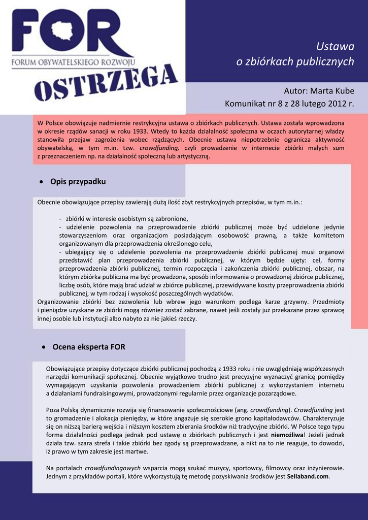 Ustawa o zbiórkach publicznych Autor: Marta Kube Komunikat nr 8 z 28 lutego 2012 r. W Polsce obowiązuje nadmiernie restrykcyjna ustawa o zbiórkach publicznych. Ustawa została wprowadzona w okresie rządów sanacji w roku 1933. Wtedy to każda działalność społeczna w oczach autorytarnej władzy stanowiła przejaw zagrożenia wobec rządzących. Obecnie ustawa niepotrzebnie ogranicza aktywność obywatelską, w tym m.in. tzw. crowdfunding, czyli prowadzenie w internecie zbiórki małych sum z przeznaczeniem np. na działalność społeczną lub artystyczną. Opis przypadku Obecnie obowiązujące przepisy zawierają dużą ilość zbyt restrykcyjnych przepisów, w tym m.in.: - zbiórki w interesie osobistym są zabronione, - udzielenie pozwolenia na przeprowadzenie zbiórki publicznej może być udzielone jedynie stowarzyszeniom oraz organizacjom posiadającym osobowość prawną, a także komitetom organizowanym dla przeprowadzenia określonego celu, - ubiegający się o udzielenie pozwolenia na przeprowadzenie zbiórki publicznej musi organowi przedstawić plan przeprowadzenia zbiórki publicznej, w którym będzie ujęty: cel, formy przeprowadzenia zbiórki publicznej, termin rozpoczęcia i zakończenia zbiórki publicznej, obszar, na którym zbiórka publiczna ma być prowadzona, sposób informowania o prowadzonej zbiórce publicznej, liczbę osób, które mają brać udział w zbiórce publicznej, przewidywane koszty przeprowadzenia zbiórki publicznej, w tym rodzaj i wysokość poszczególnych wydatków. Organizowanie zbiórki bez zezwolenia lub wbrew jego warunkom podlega karze grzywny. Przedmioty i pieniądze uzyskane ze zbiórki mogą również zostać zabrane, nawet jeśli zostały już przekazane przez sprawcę innej osobie lub instytucji albo nabyto za nie jakieś rzeczy. Ocena eksperta FOR Obowiązujące przepisy dotyczące zbiórki publicznej pochodzą z 1933 roku i nie uwzględniają współczesnych narzędzi komunikacji społecznej. Obecnie wyjątkowo trudno jest precyzyjne wyznaczyć granicę pomiędzy wymagającym uzyskania pozwolenia prowadzeniem zbiórki publicznej z wykorzystaniem internetu a działaniami fundraisingowymi, prowadzonymi regularnie przez organizacje pozarządowe. Poza Polską dynamicznie rozwija się finansowanie społecznościowe (ang. crowdfunding). Crowdfunding jest to gromadzenie i alokacja pieniędzy, w które angażuje się szerokie grono kapitałodawców. Charakteryzuje się on niższą barierą wejścia i niższym kosztem zbierania środków niż tradycyjne zbiórki. W Polsce tego typu forma działalności podlega jednak pod ustawę o zbiórkach publicznych i jest niemożliwa! Jeżeli jednak działa tzw. szara strefa i takie zbiórki bez zgody są przeprowadzane, a nikt na to nie reaguje, to dowodzi, iż prawo w tym zakresie jest martwe. Na portalach crowdfundingowych wsparcia mogą szukać muzycy, sportowcy, filmowcy oraz inżynierowie. Jednym z przykładów portali, które wykorzystują tę metodę pozyskiwania środków jest Sellaband.com. Między innymi dzięki tej platformie internetowej sukces odniosła mieszkająca w Niemczech polska piosenkarka Julia Marcell. Wydała ona swoją debiutancką płytę dzięki temu, że internauci, którym podobała się jej muzyka, kupowali internetowe cegiełki. Artystka w trzy miesiące zebrała 50 tys. dolarów. W Polsce, ze względu na ustawę o zbiórkach publicznych, wydanie w ten sposób albumu jest niemożliwe. W maju 2011 roku planowano uruchomić w Polsce portal projektstarter.org, dzięki któremu internauci mieli wspierać projekty związane z tańcem, filmem, muzyką, fotografią, designem czy modą. Projekt finansowany był z Programu Narodów Zjednoczonych ds. Rozwoju, ponadto twórcy otrzymali finansowanie z Europejskiego Funduszu Społecznego. Działalność portalu została jednak zawieszona z uwagi na problemy związane z zamknięciem procesu rejestracji zbiórki publicznej w Ministerstwie Spraw Wewnętrznych. Istnieje więc obawa, że przy obecnym kształcie ustawy innowacyjne narzędzie pozyskiwania funduszy na działalność dla młodych twórców będzie niewykorzystywane. Zgodnie z art. 2 ust. 2 ustawy o zbiórkach publicznych, jeżeli zebrane środki mają być zużyte za granicą państwa, pozwolenia na zbiórkę udziela minister właściwy dla spraw wewnętrznych za zgodą Ministra Spraw Zagranicznych oraz Ministra Finansów. Zgodnie z rozporządzeniem Ministra Spraw Wewnętrznych i Administracji z dnia 6 listopada 2003 r. w sprawie sposobów prowadzenia zbiórek publicznych oraz zakresu kontroli nad tymi zbiórkami za zbiórkę publiczną uważa się również zbiórki w formie dobrowolnych wpłat na konto. Tym samym Ministerstwo Spraw Wewnętrznych nałożyło na organizatorów zbiórki dodatkowe obowiązki. Celem formalnym ustawodawcy wprowadzającego ustawę o zbiórkach publicznych była ochrona interesu społecznego rozumianego jako ochrona woli ofiarodawców oraz odbiorców ofiarności publicznej. To paternalistyczne uzasadnienie w istocie maskowało cel polityczny ustawy, którym było ograniczenie działań obywatelskich przez autorytarne władze sanacji. Obecnie ustawa szkodzi adresatom akcji charytatywnych i tworzeniu społeczeństwa obywatelskiego. Konieczne jest więc jej całkowite uchylenie. Regulacje bowiem nie mogą ograniczać nowatorskich form pozyskiwania środków na działalność społeczną, artystyczną i naukową itp., które w Stanach Zjednoczonych oraz w Europie Zachodniej są już standardem. Bibliografia Ustawa z dnia 15 marca 1933 r. o zbiórkach publicznych, Dz. U. z dnia 31 marca 1933 r. Rozporządzenie Ministra Spraw Wewnętrznych i Administracji z dnia 6 listopada 2003 r. w sprawie sposobów przeprowadzania zbiórek publicznych oraz zakresu kontroli nad tymi zbiórkami, Dz. U. z dnia 24 listopada 2003 r. http://crowdfunding.pl/2011/01/03/definicja-finansow-spolecznosciowych-definicjacrowdfunding/#.TzJsg10n2So P. Trudnowski, Kac po WOŚP, cz