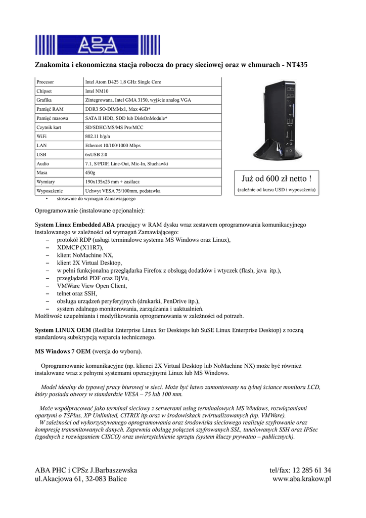 Znakomita i ekonomiczna stacja robocza do pracy sieciowej oraz w chmurach - NT435 Procesor Intel Atom D425 1,8 GHz Single Core Chipset Intel NM10 Grafika Zintegrowana, Intel GMA 3150, wyjście analog VGA Pamięć RAM DDR3 SO-DIMMx1, Max 4GB* Pamięć masowa SATA II HDD, SDD lub DiskOnModule* Czytnik kart SD/SDHC/MS/MS Pro/MCC WiFi 802.11 b/g/n LAN Ethernet 10/100/1000 Mbps USB 6xUSB 2.0 Audio 7.1, S/PDIF, Line-Out, Mic-In, Słuchawki Masa 450g Wymiary 190x135x25 mm + zasilacz Wyposażenie Uchwyt VESA 75/100mm, podstawka • Już od 600 zł netto ! (zależnie od kursu USD i wyposażenia) stosownie do wymagań Zamawiającego Oprogramowanie (instalowane opcjonalnie): System Linux Embedded ABA pracujący w RAM dysku wraz zestawem oprogramowania komunikacyjnego instalowanego w zależności od wymagań Zamawiającego: – protokół RDP (usługi terminalowe systemu MS Windows oraz Linux), – XDMCP (X11R7), – klient NoMachine NX, – klient 2X Virtual Desktop, – w pełni funkcjonalna przeglądarka Firefox z obsługą dodatków i wtyczek (flash, java itp.), – przeglądarki PDF oraz DjVu, – VMWare View Open Client, – telnet oraz SSH, – obsługa urządzeń peryferyjnych (drukarki, PenDrive itp.), – system zdalnego monitorowania, zarządzania i uaktualnień. Możliwość uzupełniania i modyfikowania oprogramowania w zależności od potrzeb. System LINUX OEM (RedHat Enterprise Linux for Desktops lub SuSE Linux Enterprise Desktop) z roczną standardową subskrypcją wsparcia technicznego. MS Windows 7 OEM (wersja do wyboru). Oprogramowanie komunikacyjne (np. klienci 2X Virtual Desktop lub NoMachine NX) może być również instalowane wraz z pełnymi systemami operacyjnymi Linux lub MS Windows. Model idealny do typowej pracy biurowej w sieci. Może być łatwo zamontowany na tylnej ściance monitora LCD, który posiada otwory w standardzie VESA – 75 lub 100 mm. Może współpracować jako terminal sieciowy z serwerami usług terminalowych MS Windows, rozwiązaniami opartymi o TSPlus, XP Unlimited, CITRIX itp.oraz w środowiskach zwirtualizowanych (np. VMWare). W zależności od wykorzystywanego oprogramowania oraz środowiska sieciowego realizuje szyfrowanie oraz kompresję transmitowanych danych. Zapewnia obsługę połączeń szyfrowanych SSL, tunelowanych SSH oraz IPSec (zgodnych z rozwiązaniem CISCO) oraz uwierzytelnienie sprzętu (system kluczy prywatno – publicznych). ABA PHC i CPSz J.Barbaszewska ul.Akacjowa 61, 32-083 Balice tel/fax: 12 285 61 34 www.aba.krakow.pl