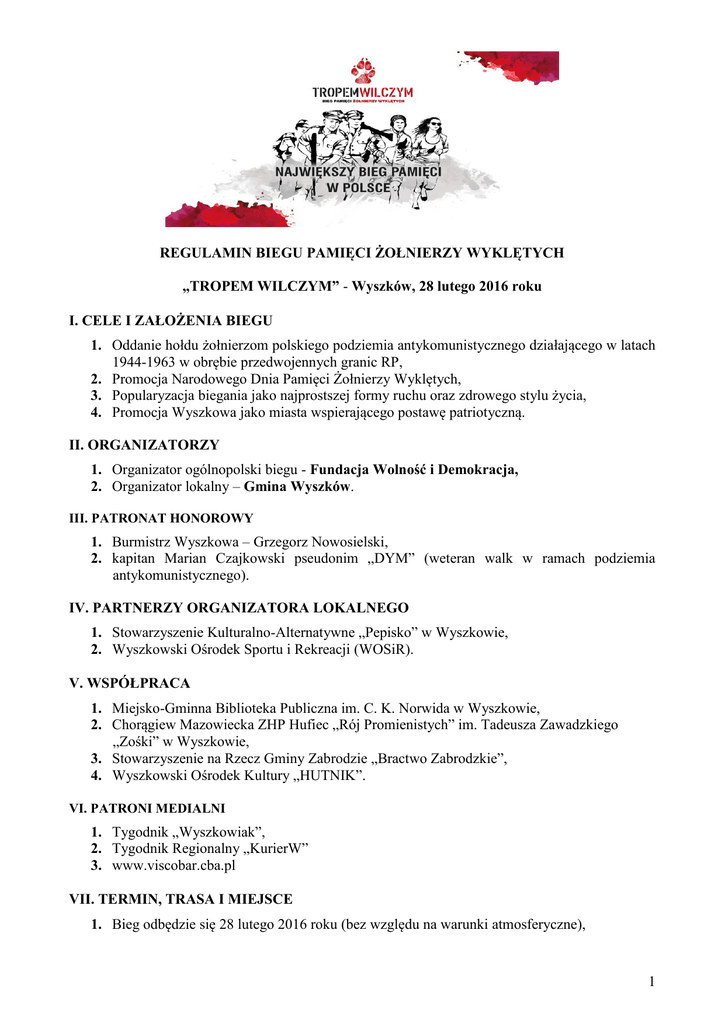 REGULAMIN BIEGU PAMIĘCI ŻOŁNIERZY WYKLĘTYCH „TROPEM WILCZYM” - Wyszków, 28 lutego 2016 roku I. CELE I ZAŁOŻENIA BIEGU 1. Oddanie hołdu żołnierzom polskiego podziemia antykomunistycznego działającego w latach 1944-1963 w obrębie przedwojennych granic RP, 2. Promocja Narodowego Dnia Pamięci Żołnierzy Wyklętych, 3. Popularyzacja biegania jako najprostszej formy ruchu oraz zdrowego stylu życia, 4. Promocja Wyszkowa jako miasta wspierającego postawę patriotyczną. II. ORGANIZATORZY 1. Organizator ogólnopolski biegu - Fundacja Wolność i Demokracja, 2. Organizator lokalny – Gmina Wyszków. III. PATRONAT HONOROWY 1. Burmistrz Wyszkowa – Grzegorz Nowosielski, 2. kapitan Marian Czajkowski pseudonim „DYM” (weteran walk w ramach podziemia antykomunistycznego). IV. PARTNERZY ORGANIZATORA LOKALNEGO 1. Stowarzyszenie Kulturalno-Alternatywne „Pepisko” w Wyszkowie, 2. Wyszkowski Ośrodek Sportu i Rekreacji (WOSiR). V. WSPÓŁPRACA 1. Miejsko-Gminna Biblioteka Publiczna im. C. K. Norwida w Wyszkowie, 2. Chorągiew Mazowiecka ZHP Hufiec „Rój Promienistych” im. Tadeusza Zawadzkiego „Zośki” w Wyszkowie, 3. Stowarzyszenie na Rzecz Gminy Zabrodzie „Bractwo Zabrodzkie”, 4. Wyszkowski Ośrodek Kultury „HUTNIK”. VI. PATRONI MEDIALNI 1. Tygodnik „Wyszkowiak”, 2. Tygodnik Regionalny „KurierW” 3. www.viscobar.cba.pl VII. TERMIN, TRASA I MIEJSCE 1. Bieg odbędzie się 28 lutego 2016 roku (bez względu na warunki atmosferyczne), 1 2. Długość trasy wynosi 1963 metry, co symbolizuje rok śmierci ostatniego żołnierza wyklętego sierż. Józefa Franczaka ps. „Lalek”, 3. START i META zlokalizowane będą przy pomniku „Żołnierzy Wyklętych”, ul. Ignacego Daszyńskiego (przy moście drogowym), 4. Trasa przebiegać będzie: od pomnika ulicą Kościelną w dół, przez Skwer Jana Pawła II, pod tunelem, ul. Strumykową do ul. Browarnej (nawrót), powrót tą samą trasą. VIII. ZASADY UCZESTNICTWA 1. W biegu Pamięci Żołnierzy Wyklętych mogą wziąć udział wszyscy chętni nie mający przeciwwskazań zdrowotnych do udziału w dyscyplinach sportowych typu wytrzymałościowego. 2. Limit uczestników Organizatorzy ustalają na 150 osób. 3. Każdy uczestnik biegu zobowiązany jest do zarejestrowania się w Biurze Zawodów przed rozpoczęciem biegu. Osoby niepełnoletnie podczas rejestracji w Biurze Zawodów przekazują osobom funkcyjnym pisemną zgodę rodziców lub prawnych opiekunów na udział w biegu. 4. Ubezpieczenie od nieszczęśliwych wypadków w czasie dojazdu na i z biegu oraz podczas trwania biegu pozostaje w gestii uczestników lub jednostek zgłaszających zawodników do uczestnictwa w imprezie. Organizatorzy nie ponoszą odpowiedzialności za szkody wynikłe z tego tytułu. 5. Zawodnicy, którzy otrzymali promocyjny pakiet startowy, proszeni są o wystartowanie w biegu w okolicznościowej koszulce (wierzchnia warstwa). 6. Organizator zapewnia ubezpieczenie OC i NNW uczestników biegu. IX. ZGŁOSZENIA 1. Rejestracja zgłoszeń odbywać się będzie w dniu biegów w biurze organizacyjnym, zlokalizowanym w miejscu biegów od godziny 10.00. 2. Druk zgłoszeniowy – deklaracje do udziału w biegu dostępne są do pobrania ze stron internetowych: www.wosir.pl, www.wyszkow.pl, www.turystyka.wyszkow.pl, wokhutnik.pl, www.biblioteka.org.pl lub osobiście w biurze zawodów w dniu 28 lutego 2016 roku. 3. Zawodnik po dokonanej weryfikacji otrzymuje pakiet startowy w którego skład wchodzą: medal, koszulka, opaska, materiały promocyjne, torba. X. PROGRAM IMPREZY godz. 10.00-11.30 rejestracja zgłoszeń, wydawanie pakietów (150 szt.) i numerów startowych godz. 11.35 Powitanie uczestników, złożenie kwiatów i zapalenie zniczy pod pomnikiem żołnierzy wyklętych godz. 12.00 Start biegu 1963 m godz. 13.30 wręczenie pamiątkowych trofeów, zakończenie imprezy Bieg odbędzie się z podziałem na kategorie: dziewczęta/chłopcy (do lat 16-tu) oraz kobiety/mężczyźni (powyżej 16 lat). XI. KLASYFIKACJE I NAGRODY 1. Bieg „Pamięci Żołnierzy Wyklętych „jest biegiem symbolicznym” (bez pomiaru czasu) 2 2. Dla zwycięzców za miejsca 1-3 (w kategoriach wiekowych) przewidziane są nagrody rzeczowe. 3. Organizatorzy zastrzegają sobie prawo dodatkowego nagradzania zawodników w zależności od pozyskania sponsorów. 4. Wśród wszystkich uczestników biegu (zarejestrowanych) zostaną rozlosowane pamiątkowe nagrody rzeczowe. XII. POSTANOWIENIA KOŃCOWE 1. Niniejszy regulamin obowiązuje wszystkich uczestników biegu. 2. Zawodnicy biegną wyłącznie oznakowaną trasą, dostosowując się do poleceń sędziów oraz służb zabezpieczających bieg. 3. Organizatorzy nie odpowiadają za rzeczy pozostawione bez opieki oraz zaginione w trakcie imprezy. 4. Zabrania się wnoszenia i spożywania napojów alkoholowych oraz środków prawnie zakazanych. 5. Osoby nietrzeźwe będą usuwane przez służby porządkowe z miejsca imprezy. 6. W sprawach spornych i nie ujętych w niniejszym regulaminie decydujący „głos” ma sędzia główny zawodów wyznaczony przez organizatora lokalnego. 7. Organizatorzy zapewniają opiekę medyczną (lekarz dyżurny + karetka pogotowia). Zgłaszający się do biegu, akceptują niniejszy regulamin oraz świadomie i na własne ryzyko decydują się na udział. W czasie trwania imprezy prowadzona będzie zbiórka publiczna na budowę pomnika Polaków zmarłych w Związku Sowieckim w czasie Wielkiego Głodu. 3