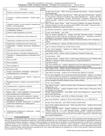 L.p. 1. 2. 3. 4. Szkoła Główna Handlowa w Warszawie – Kolegium Gospodarki Światowej Podyplomowe Studia Transportu i Spedycji – VII edycja (29 października 2016 r. – wrzesień 2017 r.) pod patronatem Głównego Inspektoratu Transportu Drogowego oraz Polskiej Izby Spedycji i Logistyki Liczba Tytuł zajęć Wykładowca godzin dr hab. Paweł Lesiak – SGH; dr Krystyna Bentkowska-Senator – Instytut Transportu Podstawy ekonomiki transportu i spedycji 6 Samochodowego prof. dr hab. Włodzimierz Januszkiewicz – SGH; mgr Janusz Piechociński – praktyk, b. Wicepremier i Minister Gospodarki; mgr Andrzej Bogdanowicz – praktyk, Dyrektor Transport w polskiej gospodarce i handlu zagra10 Generalny Ogólnopolskiego Związku Pracodawców Transportu Drogowego; mgr nicznym Adrian Furgalski – praktyk, Członek Zarządu Zespołu Doradców Gospodarczych TOR Sp. z o.o. 4 (+2 prof. dr hab. Janusz Neider – SGH, Uniwersytet Gdański; mgr Robert Przybylski – Aktualne kierunki rozwoju polityki transportowej praktyk, Redaktor naczelny dwumiesięcznika ZMPD „Przewoźnik”, dziennik „RzeczboPolski i Unii Europejskiej nus) pospolita” (dodatkowo 2 godz. bonusowe) Organizacje krajowe i międzynarodowe 2 dr Mirosław Kaczmarek – praktyk, Polska Izba Spedycji i Logistyki w transporcie i spedycji 5. Główne szlaki transportowe na świecie 6 6. Organizacja i technika przewozów kolejowych 8 7. Organizacja i technika przewozów morskich 8 8. Organizacja i technika przewozów lotniczych 8 mgr Ewa Włodarczyk – praktyk, Szef Biura Frachtu Lotniczego w Schenker Sp. z o.o. Organizacja i technika przewozów kombinowa9. nych 8 mgr inż. Henryk Zielaskiewicz; dr hab. Paweł Lesiak 10. Specjalne przewozy drogowe ładunków 4 dr inż. Alvin Gajadhur – praktyk, p.o. Główny Inspektor Transportu Drogowego, Politechnika Warszawska 11. Przewozy drogowe materiałów niebezpiecznych 8 mgr Mariusz Klink – praktyk, Główny Inspektorat Transportu Drogowego Transport w międzynarodowych klauzulach han12. dlowych 6 dr Lidia Danik – SGH 13. Prawo cywilne 8 mgr Beata Janicka – praktyk, Prezes i Arbiter Sądu Arbitrażowego przy Polskiej Izbie Spedycji i Logistyki w Gdyni, radca prawny w C. Hartwig Gdynia SA 14. Prawo handlowe 7 mgr Beata Janicka 15. Prawo podatkowe 6 16. Dostęp do rynku 6 dr hab. Jacek Brdulak – prof. SGH mgr inż. Henryk Zielaskiewicz – praktyk, Naczelnik Wydziału Centrów i Terminali Logistycznych w PKP Cargo SA; dr Mirosław Antonowicz – Akademia Leona Koźmińskiego, b. Wiceprezes Urzędu Transportu Kolejowego mgr Maciej Brzozowski – praktyk, Dyrektor Przedstawicielstwa Port of Hamburg w Polsce mgr Anna Piotrkiewicz – praktyk, długoletni pracownik Ministerstwa Infrastruktury i Rozwoju (wcześniej Ministerstwa Transportu), obecnie doradca ZMPD mgr Tadeusz Wilk – praktyk, Dyrektor Departamentu Transportu w Zrzeszeniu Międzynarodowych Przewoźników Drogowych w Polsce 17. Zasady prowadzenia działalności spedycyjnej – wykład połączony z warsztatami 8 mgr Marek Tarczyński – praktyk, Prezes Polskiej Izby Spedycji i Logistyki 18. System administracyjnych kontroli drogowych przewozów ładunków 12 dr inż. Alvin Gajadhur; dr inż. Katarzyna Piechowska-Strumik – praktyk, z-ca Dyrektora Gabinetu Głównego Inspektora w Głównym Inspektoracie Transportu Drogowego oraz Przewodnicząca grupy roboczej HARMONIE w ramach organizacji międzynarodowej Europejska Kontrola Drogowa (Euro Contrôle Route) 19. Regulacje prawne w zakresie czasu pracy kierowców 6 dr inż. Alvin Gajadhur 20. Ubezpieczenia w transporcie i spedycji 8 21. Cło w transporcie i spedycji 8 22. Biznes plan i ocena projektów inwestycyjnych firm transportowych i spedycyjnych 23. Finansowanie inwestycji w transporcie i spedycji Specyfika zarządzania przedsiębiorstwem trans24. portowym i spedycyjnym Zarządzanie ryzykiem finansowym w przedsię25. biorstwach transportowych i spedycyjnych 12 mgr Marek Izraelski – praktyk, Dyrektor Biura Ubezpieczeń Transportowych w Alfa Strategy Sp. z o.o. dr Marzena Walczak – praktyk, Inspektor Celny w Izbie Celnej w Warszawie, Wyższa Szkoła Cła i Logistyki dr hab. Alicja Ryszkiewicz – prof. SGH; dr inż. Jerzy Waśkiewicz – Instytut Transportu Samochodowego 8 dr hab. Jana Pieriegud – prof. SGH; dr Marcin Liberadzki – SGH 8 mgr Jacek Machocki – praktyk, b. Prezes firm Schenker Sp. z o.o. i PEKAES SA 6 dr hab. Zenon Marciniak – prof. SGH, Narodowy Bank Polski prof. dr hab. Elżbieta Marciszewska – SGH; mgr Piotr Szreter – praktyk, Prezes Data Group Consulting mgr inż. Bogusław Danel – praktyk, Dyrektor ds. Transportu w firmie Dobroplast Fabryka Okien Sp. z o.o.; mgr Katarzyna Kopeć – praktyk, Hellmann Worldwide Dokumentacja transportowa i spedycyjna – wykład 27. 14 Logistics Polska Sp. z o.o. Sp. k.; mgr Sławomir Wasilewski – praktyk, radca prawny, połączony z warsztatami Prezes Świętokrzyskiego Stowarzyszenia Przewoźników Drogowych w Kielcach; mgr inż. Henryk Zielaskiewicz --Liczba godzin łącznie 200 Cel Studiów: Zaznajomienie kadry kierowniczej, zarządzającej i operacyjnej w przedsiębiorstwach TSL oraz przedsiębiorstwach produkcyjnych i handlowych, przedstawicieli administracji publicznej i samorządu gospodarczego oraz osób pragnących zmienić profil działalności gospodarczej lub pracy z problematyką transportu ładunków i spedycji. Studia pomagają w przygotowaniu do egzaminu na certyfikat kompetencji zawodowych w transporcie drogowym (CPC). Cztery przedmioty wykładane na Studiach (Prawo cywilne, Prawo handlowe, Prawo podatkowe i Dostęp do rynku) dają ponadto możliwość ubiegania się o zwolnienie z części testu pisemnego na CPC. Świadectwo ukończenia studiów umożliwia również udokumentowanie kwalifikacji w zakresie obsługi celnej podmiotów gospodarczych i tym samym daje podstawę do ubiegania się o wpis na listę agentów celnych prowadzoną przez Dyrektora Izby Celnej w Warszawie. Dr hab. Paw