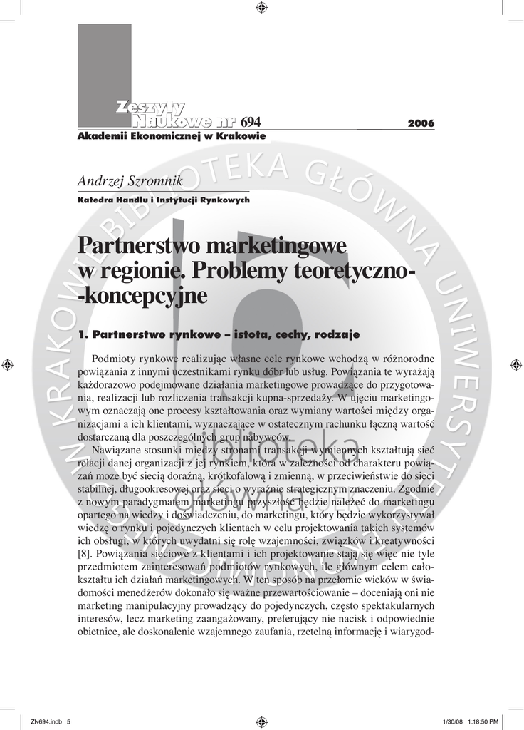 Zeszyty Naukowe nr 694 Akademii Ekonomicznej w Krakowie 2006 Andrzej Szromnik Katedra Handlu i Instytucji Rynkowych Partnerstwo marketingowe w regionie. Problemy teoretyczno-koncepcyjne 1. Partnerstwo rynkowe – istota, cechy, rodzaje Podmioty rynkowe realizując własne cele rynkowe wchodzą w różnorodne powiązania z innymi uczestnikami rynku dóbr lub usług. Powiązania te wyrażają każdorazowo podejmowane działania marketingowe prowadzące do przygotowania, realizacji lub rozliczenia transakcji kupna-sprzedaży. W ujęciu marketingowym oznaczają one procesy kształtowania oraz wymiany wartości między organizacjami a ich klientami, wyznaczające w ostatecznym rachunku łączną wartość dostarczaną dla poszczególnych grup nabywców. Nawiązane stosunki między stronami transakcji wymiennych kształtują sieć relacji danej organizacji z jej rynkiem, która w zależności od charakteru powiązań może być siecią doraźną, krótkofalową i zmienną, w przeciwieństwie do sieci stabilnej, długookresowej oraz sieci o wyraźnie strategicznym znaczeniu. Zgodnie z nowym paradygmatem marketingu przyszłość będzie należeć do marketingu opartego na wiedzy i doświadczeniu, do marketingu, który będzie wykorzystywał wiedzę o rynku i pojedynczych klientach w celu projektowania takich systemów ich obsługi, w których uwydatni się rolę wzajemności, związków i kreatywności [8]. Powiązania sieciowe z klientami i ich projektowanie stają się więc nie tyle przedmiotem zainteresowań podmiotów rynkowych, ile głównym celem całokształtu ich działań marketingowych. W ten sposób na przełomie wieków w świadomości menedżerów dokonało się ważne przewartościowanie – doceniają oni nie marketing manipulacyjny prowadzący do pojedynczych, często spektakularnych interesów, lecz marketing zaangażowany, preferujący nie nacisk i odpowiednie obietnice, ale doskonalenie wzajemnego zaufania, rzetelną informację i wiarygod- ZN694.indb 5 1/30/08 1:18:50 PM Andrzej Szromnik ność organizacji. Odpowiednikiem nowego przesłania marketingu jest koncentracja zainteresowań na rozwoju więzi między podmiotami rynkowymi, oznaczająca równocześnie odejście od orientacji transakcyjnej na rzecz orientacji relacyjnej marketingu. Rozpatrując całokształt stosunków łączących uczestników transakcji wymiennych na współczesnym rynku oraz pojedyncze relacje między nimi można zauważyć olbrzymią ich różnorodność, zdeterminowaną wielością czynników i kształtujących je okoliczności. Ogólnie rzecz biorąc, powiązania między stronami transakcji kupna-sprzedaży można podzielić na następujące rodzaje, zróżnicowane przede wszystkim pod względem charakteru, rodzaju, przejawów czy procedur oraz warunków generowania. I tak wyróżnić można powiązania: – formalne i nieformalne, – ekonomiczne i pozaekonomiczne, – handlowe i pozahandlowe, – informacyjne i zasileniowe, – dobrowolne i wymuszone, – indywidualne i instytucjonalne, – bieżące i historyczne, – jednorazowe i wielokrotne, – zaplanowane i spontaniczne, – stałe i przypadkowe, – racjonalne i emocjonalne. Wymienione typy relacji łączących organizacje, instytucje i osoby odzwierciedlają złożoność problemu ich analiz, porównań oraz mechanizmów kształtowania. Poznanie tych zagadnień jest jednak nieodzowne dla podejmowania świadomych i celowych działań związanych z budowaniem sieci więzi łączących daną organizację z jej rynkiem. Szczególnym typem relacji między dostawcą i odbiorcą jest tzw. partnerski styl relacji jako przeciwieństwo stylu transakcyjnego. Partnerstwo pomiędzy organizacjami lub osobami – uczestnikami rynku oznacza taki układ wzajemnych relacji, który prowadzi do równoczesnego zrealizowania celów biznesowych obu stron. Organizacje te, współpracując ze sobą, opierają swoje działania na podziale ryzyka i zysków, na koordynacji działań, wspólnym monitorowaniu rynku oraz wymianie informacji [5]. Partnerstwo rynkowe jako przedmiot zainteresowania tzw. marketingu partnerskiego jest szczególną formą rozwoju wzajemnych więzi kształtowanych i utrwalanych przez pojedyncze transakcje kupna-sprzedaży. Jest ono kategorią dynamiczną, gdyż wynika z rozwoju, różnicowania się i modyfikacji form współdziałania podmiotów – od form wstępnych do właściwego, rozwiniętego i dojrzałego partnerstwa. ZN694.indb 6 1/30/08 1:18:50 PM Partnerstwo marketingowe w regionie… Według P. Chevertona więzi organizacji z klientami (w tym przypadku z klientami kluczowymi) przedstawić można jako zaawansowany, chociaż nie najwyższy etap rozwoju wzajemnych więzi przedstawiony na skali ciągłej, uwzględniającej pięć progów – etapów rozwojowych, a więc: etap wstępny, etap wczesny, etap pośredni, właściwe partnerstwo oraz synergię (por. rys. 1). Etapy te wyznaczają dwie wielkości – chęć współpracy nabywcy oraz chęć współpracy dostawcy (sprzedawcy). Chęć współpracy sprzedawcy Duża Synergia Partnerstwo Etap pośredni Etap wczesny Etap wstępny Mała Mała Chęć współpracy dostawcy Duża Rys. 1. Model kształtowania i rozwoju więzi podmiotów rynkowych Źródło: [2]. Partnerstwo w relacjach wzajemnych podmiotów rynkowych jako szczególna forma współdziałania oraz powiązań interesów oznacza w praktyce [9]: – utrzymywanie nieformalnych relacji między firmami, personelem kierowniczym oraz poszczególnymi osobami, – konsultowanie ważnych decyzji rynkowych oraz programów rozwojowych, – stałą wymianę informacji technologicznych, handlowych i marketingowych, – cykliczne spotkania, narady i konferencje z udziałem pracowników obu podmiotów, – pełne respektowanie etycznych norm postępowania w procesie przygotowywania i realizacji transakcji kupna-sprzedaży, – ekwiwalentność zawieranych transakcji w długim horyzoncie czasowym, – uproszczone procedury negocjacyjne, rozl