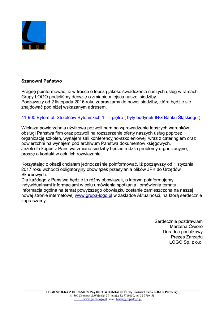 Szanowni Państwo Pragnę poinformować, iż w trosce o lepszą jakość świadczenia naszych usług w ramach Grupy LOGO podjęliśmy decyzję o zmianie miejsca naszej siedziby. Począwszy od 2 listopada 2016 roku zapraszamy do nowej siedziby, która będzie się znajdować pod niżej wskazanym adresem. 41-900 Bytom ul. Strzelców Bytomskich 1 – I piętro ( były budynek ING Banku Śląskiego ). Większa powierzchnia użytkowa pozwoli nam na wprowadzenie lepszych warunków obsługi Państwa firm oraz pozwoli na rozszerzenie oferty naszych usług poprzez organizację szkoleń, wynajem sali konferencyjno-szkoleniowej wraz z cateringiem oraz powierzchni na wynajem pod archiwum Państwa dokumentów księgowych. Jeżeli dla kogoś z Państwa zmiana siedziby będzie rodziła problemy organizacyjne, proszę o kontakt w celu ich rozwiązania. Korzystając z okazji chciałam jednocześnie poinformować, iż począwszy od 1 stycznia 2017 roku wchodzi obligatoryjny obowiązek przesyłania plików JPK do Urzędów Skarbowych. Dla każdego z Państwa będzie to różny obowiązek, o którym poinformujemy indywidualnymi informacjami w celu umówienia spotkania i omówienia tematu. Informacja ogólna na temat powyższego obowiązku zostanie zamieszczona na naszej nowej stronie internetowej www.grupa-logo.pl w zakładce Aktualności, na którą serdecznie zapraszamy. Serdecznie pozdrawiam Marzena Ćwioro Doradca podatkowy Prezes Zarządu LOGO Sp. z o.o. _____________________________________________________________________________________________________________________ LOGO SPÓŁKA Z OGRANICZONĄ ODPOWIEDZIALNOŚCIĄ Partner Grupa LOGO i Partnerzy 41-500 Chorzów ul.Wolności 39 tel./fax 32 7719450, tel. 32 7719451 www.grupa-logo.pl mail: [email protected]
