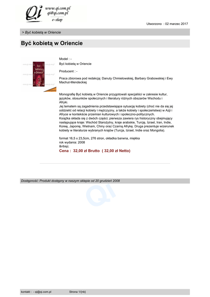 Utworzono : 02 marzec 2017 > Być kobietą w Oriencie Być kobietą w Oriencie Model : Być kobietą w Oriencie Producent : Praca zbiorowa pod redakcją: Danuty Chmielowskiej, Barbary Grabowskiej i Ewy Machut-Mendeckiej Monografię Być kobietą w Oriencie przygotowali specjaliści w zakresie kultur, języków, stosunków społecznych i literatury różnych obszarów Wschodu i Afryki. Jej tematem są zagadnienia przedstawiające sytuację kobiety (choć nie da się jej oddzielić od relacji kobiety i mężczyzny, a także kobiety i społeczeństwa) w Azji i Afryce w kontekście przemian kulturowych i społeczno-politycznych. Książka składa się z dwóch części; pierwsza zawiera rys historyczny obejmujący następujące kraje: Wschód Starożytny, kraje arabskie, Turcję, Izrael, Iran, Indie, Koreę, Japonię, Wietnam, Chiny oraz Czarną Afrykę. Druga prezentuje wizerunek kobiety w literaturze wybranych krajów (Turcja, Izrael, Indie oraz Mongolia). format 16,5 x 23,5cm, 276 stron, okładka barwna, miękka rok wydania: 2008 Cena : 32,00 zł Brutto ( 32,00 zł Netto) i Q Dostępność: Produkt dostępny w naszym sklepie od 20 grudzień 2008 kontakt : - [email protected] Strona 1/{nb}