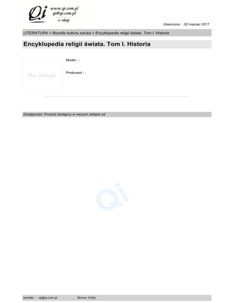 Utworzono : 02 marzec 2017 LITERATURA > filozofie kultura sztuka > Encyklopedia religii świata. Tom I. Historia Encyklopedia religii świata. Tom I. Historia Model : - No image Producent : - Dostępność: Produkt dostępny w naszym sklepie od i Q kontakt : - [email protected] Strona 1/{nb}