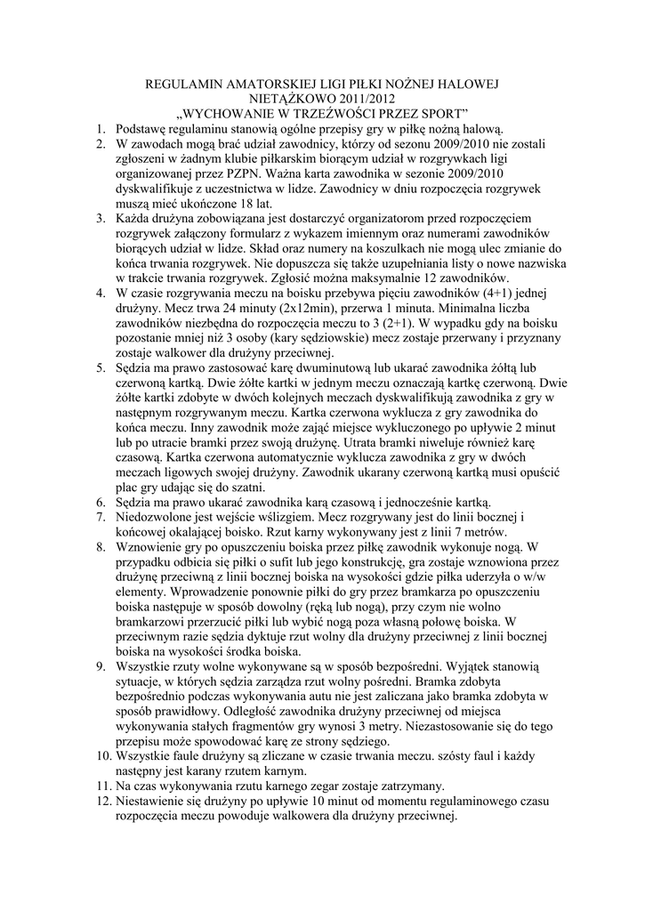 REGULAMIN AMATORSKIEJ LIGI PIŁKI NOŻNEJ HALOWEJ NIETĄŻKOWO 2011/2012 „WYCHOWANIE W TRZEŹWOŚCI PRZEZ SPORT” 1. Podstawę regulaminu stanowią ogólne przepisy gry w piłkę nożną halową. 2. W zawodach mogą brać udział zawodnicy, którzy od sezonu 2009/2010 nie zostali zgłoszeni w żadnym klubie piłkarskim biorącym udział w rozgrywkach ligi organizowanej przez PZPN. Ważna karta zawodnika w sezonie 2009/2010 dyskwalifikuje z uczestnictwa w lidze. Zawodnicy w dniu rozpoczęcia rozgrywek muszą mieć ukończone 18 lat. 3. Każda drużyna zobowiązana jest dostarczyć organizatorom przed rozpoczęciem rozgrywek załączony formularz z wykazem imiennym oraz numerami zawodników biorących udział w lidze. Skład oraz numery na koszulkach nie mogą ulec zmianie do końca trwania rozgrywek. Nie dopuszcza się także uzupełniania listy o nowe nazwiska w trakcie trwania rozgrywek. Zgłosić można maksymalnie 12 zawodników. 4. W czasie rozgrywania meczu na boisku przebywa pięciu zawodników (4+1) jednej drużyny. Mecz trwa 24 minuty (2x12min), przerwa 1 minuta. Minimalna liczba zawodników niezbędna do rozpoczęcia meczu to 3 (2+1). W wypadku gdy na boisku pozostanie mniej niż 3 osoby (kary sędziowskie) mecz zostaje przerwany i przyznany zostaje walkower dla drużyny przeciwnej. 5. Sędzia ma prawo zastosować karę dwuminutową lub ukarać zawodnika żółtą lub czerwoną kartką. Dwie żółte kartki w jednym meczu oznaczają kartkę czerwoną. Dwie żółte kartki zdobyte w dwóch kolejnych meczach dyskwalifikują zawodnika z gry w następnym rozgrywanym meczu. Kartka czerwona wyklucza z gry zawodnika do końca meczu. Inny zawodnik może zająć miejsce wykluczonego po upływie 2 minut lub po utracie bramki przez swoją drużynę. Utrata bramki niweluje również karę czasową. Kartka czerwona automatycznie wyklucza zawodnika z gry w dwóch meczach ligowych swojej drużyny. Zawodnik ukarany czerwoną kartką musi opuścić plac gry udając się do szatni. 6. Sędzia ma prawo ukarać zawodnika karą czasową i jednocześnie kartką. 7. Niedozwolone jest wejście wślizgiem. Mecz rozgrywany jest do linii bocznej i końcowej okalającej boisko. Rzut karny wykonywany jest z linii 7 metrów. 8. Wznowienie gry po opuszczeniu boiska przez piłkę zawodnik wykonuje nogą. W przypadku odbicia się piłki o sufit lub jego konstrukcję, gra zostaje wznowiona przez drużynę przeciwną z linii bocznej boiska na wysokości gdzie piłka uderzyła o w/w elementy. Wprowadzenie ponownie piłki do gry przez bramkarza po opuszczeniu boiska następuje w sposób dowolny (ręką lub nogą), przy czym nie wolno bramkarzowi przerzucić piłki lub wybić nogą poza własną połowę boiska. W przeciwnym razie sędzia dyktuje rzut wolny dla drużyny przeciwnej z linii bocznej boiska na wysokości środka boiska. 9. Wszystkie rzuty wolne wykonywane są w sposób bezpośredni. Wyjątek stanowią sytuacje, w których sędzia zarządza rzut wolny pośredni. Bramka zdobyta bezpośrednio podczas wykonywania autu nie jest zaliczana jako bramka zdobyta w sposób prawidłowy. Odległość zawodnika drużyny przeciwnej od miejsca wykonywania stałych fragmentów gry wynosi 3 metry. Niezastosowanie się do tego przepisu może spowodować karę ze strony sędziego. 10. Wszystkie faule drużyny są zliczane w czasie trwania meczu. szósty faul i każdy następny jest karany rzutem karnym. 11. Na czas wykonywania rzutu karnego zegar zostaje zatrzymany. 12. Niestawienie się drużyny po upływie 10 minut od momentu regulaminowego czasu rozpoczęcia meczu powoduje walkowera dla drużyny przeciwnej. 13. Sygnałem kończącym spotkanie jest gwizdek sędziego lub sygnał syreny z zegara mierzącego czas. 14. W przypadku szczególnie nie sportowego zachowania organizatorzy mogą wykluczyć zawodnika lub całą drużynę z rozgrywek bez zwrotu wpisowego. Za otrzymanie czerwonej kartki organizatorzy mogą odsunąć zawodnika od większej ilości spotkań. 15. Za nie sportowe zachowanie zawodników rezerwowych oraz osób nie będących zawodnikami a znajdującymi się wśród zespołu ukarani zostają zawodnicy zespołu, począwszy od kapitana, karą czasową, kartką żółtą do kartki czerwonej włącznie. 16. Niesportowe zachowanie zawodników w stosunku do sędziego protokolanta oraz obsługującego zegar powoduje karę czasową, kartkę żółtą do kartki czerwonej włącznie. 17. Wszystkie niesportowe zachowania wymienione w punktach 14, 15,16,17 mogą skutkować karami finansowymi dla zespołu w wysokości, którą ustali organizator ligi. 18. W wypadku wyjątkowo agresywnego zachowania zawodnika w stosunku do sędziego, organizatorzy zastrzegają sobie prawo do odsunięcia zawodnika od gry w aktualnym sezonie oraz odsunięcia od rozgrywek w kolejnych edycjach ALPNH przez najbliższe trzy lata. 19. W przypadku trzeciego walkowera, organizatorzy dyskwalifikują drużynę z dalszych rozgrywek, przyznając pozostałym drużynom walkowery (za mecze rozegrane i nie rozegrane). Taka sama decyzja dotyczy zespołu odsuniętego od rozgrywek. 20. Mecze rozgrywane są według ustalonego kalendarza i regulaminu, który drużyny akceptują przystępując do rozgrywek, a w przypadkach szczególnych organizatorzy mogą przystać na inny termin rozegrania spotkania. 21. Punktacja: - za wygrany mecz – 3 pkt - za remis – 1 pkt - za przegrany mecz – 0 pkt - walkower – 3 pkt, bramki 3:0, 0:3 dla zespołu oddającego walkower. 22. W przypadku równej ilości punktów decyduje pojedynek bezpośredni zainteresowanych zespołów, następnie różnica między bramkami zdobytymi a straconymi, w dalszej kolejności ilość strzelonych bramek. W ostateczności o kolejności zdecyduje seria rzutów karnych, po pięć na każdą drużynę. Przy remisie po karnych, po jednym rzucie karnym do rozstrzygnięcia. 23. Wszelkie kwestie sporne rozstrzygają organizatorzy. Organizator zastrzega sobie prawo interpretacji regulaminu. 24. 