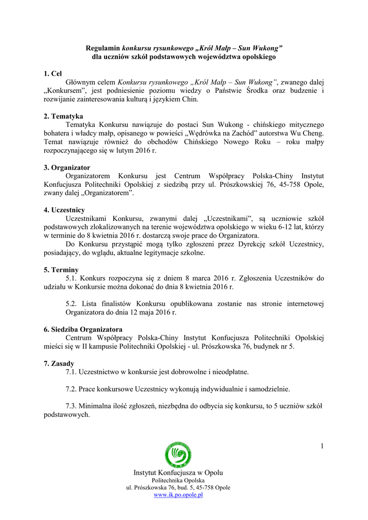 Regulamin konkursu rysunkowego „Król Małp – Sun Wukong” dla uczniów szkół podstawowych województwa opolskiego 1. Cel Głównym celem Konkursu rysunkowego „Król Małp – Sun Wukong”, zwanego dalej „Konkursem”, jest podniesienie poziomu wiedzy o Państwie Środka oraz budzenie i rozwijanie zainteresowania kulturą i językiem Chin. 2. Tematyka Tematyka Konkursu nawiązuje do postaci Sun Wukong - chińskiego mitycznego bohatera i władcy małp, opisanego w powieści „Wędrówka na Zachód” autorstwa Wu Cheng. Temat nawiązuje również do obchodów Chińskiego Nowego Roku – roku małpy rozpoczynającego się w lutym 2016 r. 3. Organizator Organizatorem Konkursu jest Centrum Współpracy Polska-Chiny Instytut Konfucjusza Politechniki Opolskiej z siedzibą przy ul. Prószkowskiej 76, 45-758 Opole, zwany dalej „Organizatorem”. 4. Uczestnicy Uczestnikami Konkursu, zwanymi dalej „Uczestnikami”, są uczniowie szkół podstawowych zlokalizowanych na terenie województwa opolskiego w wieku 6-12 lat, którzy w terminie do 8 kwietnia 2016 r. dostarczą swoje prace do Organizatora. Do Konkursu przystąpić mogą tylko zgłoszeni przez Dyrekcję szkół Uczestnicy, posiadający, do wglądu, aktualne legitymacje szkolne. 5. Terminy 5.1. Konkurs rozpoczyna się z dniem 8 marca 2016 r. Zgłoszenia Uczestników do udziału w Konkursie można dokonać do dnia 8 kwietnia 2016 r. 5.2. Lista finalistów Konkursu opublikowana zostanie nas stronie internetowej Organizatora do dnia 12 maja 2016 r. 6. Siedziba Organizatora Centrum Współpracy Polska-Chiny Instytut Konfucjusza Politechniki Opolskiej mieści się w II kampusie Politechniki Opolskiej - ul. Prószkowska 76, budynek nr 5. 7. Zasady 7.1. Uczestnictwo w konkursie jest dobrowolne i nieodpłatne. 7.2. Prace konkursowe Uczestnicy wykonują indywidualnie i samodzielnie. 7.3. Minimalna ilość zgłoszeń, niezbędna do odbycia się konkursu, to 5 uczniów szkół podstawowych. 1 Instytut Konfucjusza w Opolu Politechnika Opolska ul. Prószkowska 76, bud. 5, 45-758 Opole www.ik.po.opole.pl 7.4. Uczestnicy Konkursu z dniem 8 kwietnia 2016 r. winni mieć nie mniej niż 6 lat i nie więcej niż 12 lat. 7.5. Jeden uczeń może złożyć do Konkursu tylko jedną swoją pracę. 7.6. Prace winny być wykonane na papierze formatu A3 lub A4, techniką dowolną. 7.7. Prace oceniane będą głównie ze względu na: oryginalność podejścia do tematu oraz staranność wykonania. 7.8. Zwycięzcami konkursu zostaną uczniowie, których prace zostaną najwyżej ocenione przez Komisję Konkursową w skład której wchodzą: a) Przewodniczący Komisji: dr hab. Maria Bernat, prof. PO, b) Członkowie Komisji: - mgr Jiang Huijuan, - dr inż. Katarzyna Mazur-Kajta, - mgr inż. Yingnan Sun, - Maria Jolanta Hęciak-Morzyk. 7.9. Przewidywane są trzy rodzaje nagród w grupach wiekowych 6-9 lat i 10-12 lat, w każdej z grup odpowiednio: - za zajęcie I miejsca, - za zajęcie II miejsca, - za zajęcie III miejsca. 7.10. Organizator nie będzie podejmował działań mających na celu zwrot nadesłanych prac Uczestnikom Konkursu; nie będzie ich również przechowywał po upływie terminu, o którym mowa w pkt. 4. 7.11. Przesłanie pracy konkursowej do Organizatora traktowane jest jako deklaracja udziału w Konkursie, oznacza też wyrażenie przez Uczestnika, a gdy jest to wymagane również przez jego opiekuna prawnego, zgody na jej nieodpłatną anonimową publikację. 7.12. Uczestnik Konkursu, a gdy to jest wymagane jego opiekun prawny, może wyrazić zgodę na publikację pracy konkursowej pod imieniem i nazwiskiem autora (załącznik 2). 8. Zgłoszenia 8.1. Informacja o Konkursie zostanie listownie przesłana do Opolskiego Kuratora Oświaty, opublikowana w prasie regionalnej oraz na stronie internetowej Organizatora. 8.2. Dyrektorzy szkół zobowiązani są dostarczyć do Organizatora wybrane prace uczniów wraz z następującymi danymi osobowymi (załącznik 1 i 2): - imię i nazwisko Uczestnika 2 Instytut Konfucjusza w Opolu Politechnika Opolska ul. Prószkowska 76, bud. 5, 45-758 Opole www.ik.po.opole.pl datę i miejsce urodzenia Uczestnika adres zamieszkania Uczestnika szkołę podstawową, w której Uczestnik się kształci telefon kontaktowy i adres e-mail szkoły zgodę opiekuna na przetwarzanie ww. danych dla potrzeb Organizatora oświadczenie Uczestnika i jego opiekuna prawnego o zapoznaniu się z regulaminem konkursu i zgodzie na udział w konkursie na zasadach określonych w tym regulaminie Maksymalna ilość zgłoszeń z jednej szkoły - 5 uczniów. - 8.3. Dane osobowe uczestników Konkursu będą przetwarzane tylko dla potrzeb Konkursu, imiennego wyłonienia i zatwierdzania Laureatów, oraz rozliczania nagród. 8.4. Dyrekcja szkół i Uczestnicy mają prawo wglądu do swoich danych. 9. Nagrody 9.1. Nagrody w Konkursie, w poniższej postaci, ufundowane są przez Organizatora oraz sponsorów: - pamiątkowe dyplomy dla Laureatów, - zestawy do nauki języka chińskiego dla Laureatów, - profesjonalne akcesoria dla plastyków i rysowników dla Laureatów, - dziesięć zestawów do nauki języka chińskiego dla szkół, w których uczą się Laureaci I miejsca, - mały upominek dla wszystkich uczestników Konkursu. 9.2. Lista Laureatów opublikowana zostanie na stronie internetowej Instytutu Konfucjusza, a Dyrektorzy szkół Laureatów zostaną powiadomieni listownie. 9.3. Informacje o terminie oraz miejscu wręczenia nagród finalistom zostaną przekazane przez Organizatora Dyrektorom szkół. 9.4. Nagrody konkursowe będą wydawane wyłącznie w postaci określonej niniejszym Regulaminem, bez możliwości wypłaty ich równowartości w gotówce lub zamiany na inną nagrodę rzeczową. 9.5. Organizator nie ponosi odpowiedzialności za nieprawidłowości związane z opóźnieniem lub niedoręczeniem powiadomienia o zwycięstwie w Konkursie i wygranej wynikających z błędnego podania danych przez Zgłaszającego. 9.6. W celu dokonania id