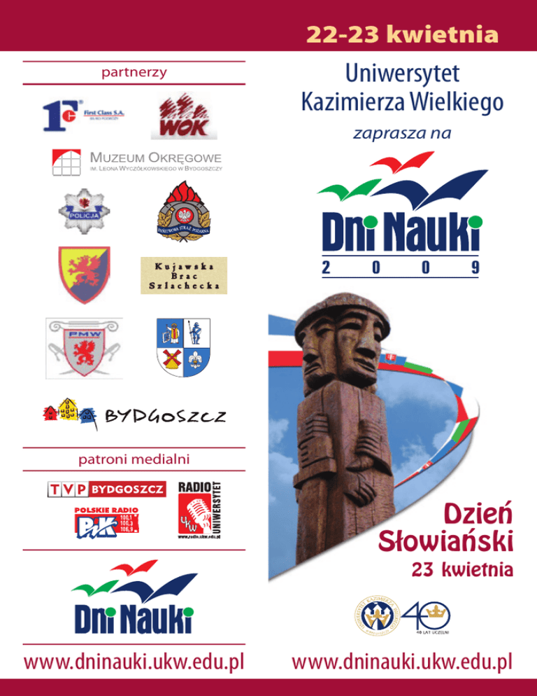 22-23 kwietnia partnerzy Uniwersytet Kazimierza Wielkiego zaprasza na patroni medialni Dzień Słowiański 23 kwietnia www.dninauki.ukw.edu.pl www.dninauki.ukw.edu.pl Wydział Matematyki, Fizyki i Techniki Wydział Matematyki, Fizyki i Techniki 22 k w i e t n i a 2 0 0 9 22 k wietnia 2009 ścieżk a i n fo r m at yc z n o - f i z yc z n a 10.40-11.10 s. 27, Budynek Główny, Chodkiewicza 30 dr Tomasz Weselak Życie gwiazd wykład 11.00-14.00 Boisko, Chodkiewicza 30 dr Krzysztof Tyszczuk 9.00-9.50 s. 27, Budynek Główny, Chodkiewicza 30 dr Piotr Prokopowicz Tańce robotów pokaz 9.00-11.00, 11.00-13.00 13.00-15.00 s. 101, Plac Weyssenhoffa dr Danuta Galanciak mgr Adam Szulc Koło Naukowe Fizyków Projektowanie, budowa i wyścigi zdalnie sterowanych modeli samochodów sportowych warsztaty z pokazem 11.00-12.00 12.00-13.00 13.00-14.00 s. 09, Budynek Główny, Chodkiewicza 30 dr Marek Macko dr Krzysztof Tyszczuk Eksperymentarium fizyczne czyli podróż w świat fizyki warsztaty 9.00-10.00, 10.00-11.00 11.00-12.00 s. 148, Budynek Główny, Chodkiewicza 30 dr Marek Macko Koło Naukowe Komputerowego Wspomagania Projektowania Nowoczesne techniki rozdrabniania materiałów warsztaty z pokazem 11.20-12.10 s. 27, Budynek Główny, Chodkiewicza 30 dr Zbigniew Dziamski Czas i zegary Wirtualne projektowanie obiektów warsztaty 10.00-10.30 s. 27, Budynek Główny, Chodkiewicza 30 prof. Wacław Bała wykład z pokazem 12.00-13.00 s. 148, Budynek Główny, Chodkiewicza 30 dr Katarzyna Chmielewska Kwadratowe kule Komputer zwijany w rulon warsztaty wykład 10.00-11.00 s. 038, Budynek Główny, Chodkiewicza 30 dr Piotr Rytlewski mgr Krzysztof Moraczewski mgr Magdalena Stepczyńska 12.20-13.10 s. 27, Budynek Główny, Chodkiewicza 30 prof. Krzysztof Misiewicz Jak pokazać niewidzialne? Metody nieinwazyjne w archeologii Gorące chwile w życiu polimerów, czyli o metodach analizy termicznej warsztaty 10.00-11.30 s. 018, Budynek Główny, Chodkiewicza 30 dr Tadeusz Z. Woźniak mgr Artur Kowalski wykład 13.00-14.00 s. 148, Budynek Główny, Chodkiewicza 30 Jarosław Karpiński Koło Naukowe OMEGA Matematyka w portfelu. Papiery wartościowe warsztaty Emisja ultradźwięków warsztaty 10.00-13.00 s. 08, Budynek Główny, Chodkiewicza 30 dr Jacek Czerniak dr Iwona Filipowicz mgr Wojciech Dobrosielski 13.20-14.10 s. 27, Budynek Główny, Chodkiewicza 30 prof. Mariusz Kaczmarek dr Radosław Drelich dr Michał Pakuła Pracowite ultradźwięki Warsztaty z programowania robotów wykład z pokazem warsztaty 2 3 Wydział Nauk Przyrodniczych Wydział Nauk Przyrodniczych 22 k w i e t n i a 2 0 0 9 22 k wietnia 2009 ście ż k a p r z y ro d n i c z a 10.45-11.30 Aula Mikotoksyn, Bud. F, Chodkiewicza 30 mgr Małgorzata Urbańska Jak komórki decydują o swojej śmierci wykład 11.00-12.00 s. 6, Bud. F, Chodkiewicza 30 dr Ewa Sokołowska dr Mirosława Cieślicka mgr Błażej Stankiewicz 9.00-9.45 Aula Mikotoksyn, Bud. F, Chodkiewicza 30 prof. Zygmunt Babiński mgr Michał Habel Wybrane próby oceniające wydolność układu krążenia i sprawność fizyczną Dolina dolnej Wisły z lotu ptaka wykład 9.00-9.45 s. 104, Bud. F, Chodkiewicza 30 dr Elżbieta Hartman Mięśnie pod mikroskopem pokaz 9.00-10.00 Ogród Botaniczny, Chodkiewicza 30 mgr Barbara Wilbrandt warsztaty 11.00-12.30 Bud. F (zbiórka przy wejściu), Chodkiewicza 30 dr Rafał Gotowski Spacerkiem wokół uczelni – turystyczny marsz na orientację warsztaty 11.45-12.15 Aula Mikotoksyn, Bud. F, Chodkiewicza 30 mgr Dawid Mikulski Tajemnice ogrodu 2 wycieczka 9.00-10.00 10.00-11.00 11.00-12.00 s. 12, Ossolińskich 12 dr Tomasz Marquardt Organizmy modyfikowane genetycznie (GMO) – perspektywy i zagrożenia wykład 12.00-14.20 Laboratorium Mikotoksyn, Bud. F, Chodkiewicza 30 mgr Anna Błajet-Kosicka Życie w mikroskali warsztaty 9.00-10.00 10.00-11.00 11.00-12.00 12.00-13.00 Ossolińskich 12 mgr Ewa Wachowiak Koło Naukowe Przyrodników Woda mineralna – analiza składu warsztaty 12.30-13.30, 13.30-14.30, 14.30-15.30 s. 12, Ossolińskich 12 mgr Małgorzata Chudaś dr Tomasz Marquadt mgr Katarzyna Faleńczyk-Koziróg Roztocze – wrogowie czy sprzymierzeńcy Mali botaniczni detektywi – zajęcia terenowe dla młodzieży szkolnej wycieczka 10.00-10.30 Aula Mikotoksyn, Bud. F, Chodkiewicza 30 dr Katarzyna Marcysiak warsztaty 13.00-15.00 s. 12, Instytut Geografii, Mińska 15 dr Kazimierz Harłoziński mgr Tomasz Giętkowski mgr Mirosław Rurek Od pomiarów w terenie do map Kwitnące góry wykład 10.00-12.00 s. 11, Bud. F, Chodkiewicza 30 mgr Marta Małecka-Adamowicz mgr Aneta Okoniewska Mikroorganizmy w XXI wieku warsztaty wykład, warsztaty z pokazem 13.00-14.00 Aula Atrium, Budynek Główny, Chodkiewicza 30 prof. dr hab. Andrzej Rychard Dwadzieścia lat później: Czy transformacja w Polsce się skończyła? wykład gościnny 4 5 Wydział Humanistyczny Wydział Humanistyczny 22 k w i e t n i a 2 0 0 9 22 k wietnia 2009 ścież k a h u m a n i s t yc z n a 10.35-11.05 Aula Nova, Bud. F, Chodkiewicza 30 mgr Arkadiusz Jasiński „Strich durch die Rechnung, Nagel auf den Kopf“ – między pułapką językową a trafną metaforą… wykład 11.10-11.40 s. 5, Biblioteka Główna, Chodkiewicza 30 mgr Friederike Partzsch 9.00-9.55 Aula Nova, Bud. F, Chodkiewicza 30 dr Anetta Głowacka W uścisku gorsetu. Rzecz nie tylko o modzie wykład z pokazem 9.00-10.00 Czytelnia, Biblioteka Główna, Chodkiewicza 30 dr Zbigniew Zyglewski Karmelici bydgoscy w topografii miasta. Jak archeologia zmienia dzieje. wykład z pokazem 9.00-11.00 s. 3, Biblioteka Główna, Chodkiewicza 30 dr Paweł Schreiber Biblioteczka pod telewizor wykład 11.10-12.10 s. 11, Bud. E, Chodkiewicza 30 dr Katarzyna Domańska Wyszukiwarki zasobów multimedialnych, audiowizualnych warsztaty 11.15-12.30 s. 3, Biblioteka Główna, Chodkiewicza 30 dr Artur Laska warsztaty 10.00-10.30 Aula Nova, Bud. F, Chodkiewicza 30 dr Roman Godlewski Debata oxfordzka na temat: Wspólna polityka zagraniczna i bezpieczeństwa U