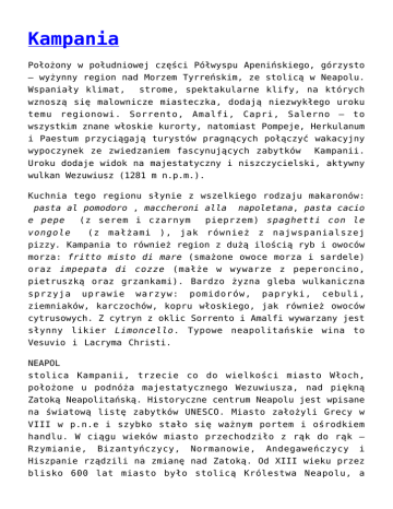 Kampania Położony w południowej części Półwyspu Apenińskiego, górzysto – wyżynny region nad Morzem Tyrreńskim, ze stolicą w Neapolu. Wspaniały klimat, strome, spektakularne klify, na których wznoszą się malownicze miasteczka, dodają niezwykłego uroku temu regionowi. Sorrento, Amalfi, Capri, Salerno – to wszystkim znane włoskie kurorty, natomiast Pompeje, Herkulanum i Paestum przyciągają turystów pragnących połączyć wakacyjny wypoczynek ze zwiedzaniem fascynujących zabytków Kampanii. Uroku dodaje widok na majestatyczny i niszczycielski, aktywny wulkan Wezuwiusz (1281 m n.p.m.). Kuchnia tego regionu słynie z wszelkiego rodzaju makaronów: pasta al pomodoro , maccheroni alla napoletana, pasta cacio e pepe (z serem i czarnym pieprzem) spaghetti con le vongole (z małżami ), jak również z najwspanialszej pizzy. Kampania to również region z dużą ilością ryb i owoców morza: fritto misto di mare (smażone owoce morza i sardele) oraz impepata di cozze (małże w wywarze z peperoncino, pietruszką oraz grzankami). Bardzo żyzna gleba wulkaniczna sprzyja uprawie warzyw: pomidorów, papryki, cebuli, ziemniaków, karczochów, kopru włoskiego, jak również owoców cytrusowych. Z cytryn z oklic Sorrento i Amalfi wywarzany jest słynny likier Limoncello. Typowe neapolitańskie wina to Vesuvio i Lacryma Christi. NEAPOL stolica Kampanii, trzecie co do wielkości miasto Włoch, położone u podnóża majestatycznego Wezuwiusza, nad piękną Zatoką Neapolitańską. Historyczne centrum Neapolu jest wpisane na światową listę zabytków UNESCO. Miasto założyli Grecy w VIII w p.n.e i szybko stało się ważnym portem i ośrodkiem handlu. W ciągu wieków miasto przechodziło z rąk do rąk – Rzymianie, Bizantyńczycy, Normanowie, Andegaweńczycy i Hiszpanie rządzili na zmianę nad Zatoką. Od XIII wieku przez blisko 600 lat miasto było stolicą Królestwa Neapolu, a następnie pod władzą Burbonów – stolicą Królestw Obojga Sycylii. Okres ten przyczynił się do długotrwałego rozwoju ekonomicznego oraz społecznego miasta. Najważniejsze zabytki Neapolu to: Palazzo Reale (Pałac Królewski), Castel Nuovo – andegaweński dwór królewski , Katedra Św. Januarego, Klasztor Kartuzów. Warto wybrać się kolejką linową Montesanto do Zamku Sant’Elmo i Opactwa Św. Marcina. Niezwykle ciekawe jest również Muzeum Archeologiczne. SORRENTO Miejscowość położona nad Zatoką Neapolitańską (Morze Tyrreńskie) naprzeciw Wezuwiusza, słynie z przepięknych widoków. Nazwa ‚Sorrento’ pochodzi od mitycznych Syren – ‚Surrentum’. Sorrento założone zostało najprawdopodobniej przez Greków i funkcjonowało jako grecka kolonia. W późniejszych wiekach przechodziło we władanie kolejno – Etrusków, Syrakuzan i Samnitów, póki nie zostało podbite przez Rzymian. W czasach imperialnej okupacji miasteczko stanowiło popularne miejsce wypoczynku dla rzymskich dostojników. W mieście urodził się Torquato Tasso, XVI wieczny poeta, twórca słynnej Jerozolimy wyzwolonej. W centrum miasteczka znajduje się plac z pomnikiem poety – Piazza Tasso Baia Domizia, Hotel **** Marina Club Baia Domizia to urocza, popularna miejscowość, z widokiem na Zatokę Gaeta. Hotel położony jest 2 km od centrum miejscowości, przy szerokiej, piaszczystej plaży. Jest idealnym miejscem wypoczynku dla rodzin z dziećmi, jak również stwarza możliwość zaplanowania ciekawych wycieczek po okolicy: Pompeje (91 km), Monte Cassino (41 km), Caserta (46 km), Amalfi, Capri. Do dyspozycji gości: recepcja, 2 restauracje, 2 bary, prywatny parking, basen dla dorosłych i dla dzieci, siłownia, boisko do siatkówki plażowej, mini klub dla dzieci, wynajem rowerów wodnych, rowery, windsurfing i kajaki, punkt internetowy. Pokoje: 184 pokoje, wyposażone w telefon, internet (za opłatą), TV, lodówkę (na zapytanie), klimatyzację, suszarkę do włosów. Większość pokoi posiada patio lub balkon, niektóre pokoje położone są przy ogrodzie. Pokoje rodzinne: 2 sypialnie, 2 łazienki.(2 pokoje połączone wewnętrznymi drzwiami, maksymalnie 5 osób) Wyżywienie: bufet z wyborem dań kuchni włoskiej i śródziemnomorskiej. Restauracja położona w ogrodzie, serwuje pizzę i inne specjały kuchni regionalnej. Formuła All inclusive zawiera: napój, wodę mineralną, piwo i wino do posiłków. Open bar (od 10 rano do 24) napoje, woda mineralna, soki, piwo, kawa, herbata, lokalne likiery. 16/03 -17/05 19/05 -14/06 15/06 -19/07 07/09 -25/10 24/08 – 06/09 Osoba w pokoju 2 os, HB 236 Osoba w pokoju 2 os, widok na morze, HB 20/07 03/08 17/08 -23/08 -02/08 -16/08 265 282,5 380 437,5 275 300 317,5 415 472,5 Dopłata do pokoju 1 os xxx xxx 87,5 87,5 115 Dopłata do FB 52,5 52,5 52,50 52,50 52,50 Dopłata All Inclusive 92,5 92,5 92,50 92,50 92,50 Zniżka 3,4 dostawka dla os dorosłej 20% 20% 20% 20% 20% Cena w PLN obejmuje: nocleg osoby w pokoju 2 osobowym, śniadanie, kolacje. Cena nie obejmuje: taksy klimatycznej, opłat za garaż lub parking. Uwaga: Min pobytu: od 20/07-16/08 – min 7 dni, przyjazd i wyjazd możliwy każdego dnia. Capaccio, Paestum, Cristallo *** Hotel Hotel położony jest w spokojnej okolicy, ok 1 km od stanowiska archeologicznego, ok. 200 m od szerokiej, pięknej, piaszczystej plaży nad Morzem Tyrreńskim. Miasteczko jest świetnym punktem wypadowym do zwiedzania południowych Włoch, leży ok 100 km na południe od Neapolu. Znajdują się tu również największe w całych Włoszech wykopaliska archeologiczne z czasów greckich, między innymi doskonale zachowane ruiny trzech starożytnych świątyń: Hery, Posejdona i Neptuna. Park archeologiczny w Paestum został wpisany na Listę Światowego Dziedzictwa Kultury UNESCO. Hotel posiada bar, ogród, salę konferencyjną, basen, parking. Pokoje: 35 pokoi, z TV, klimatyzacją, łazienką, balkonem. Cena za osobę w pokoju 2 os, HB 29/03-31/05 1209 31/05-28/06 1357 06/09-27/09 28/06-12/07 1545 12/07-02/08 1693 