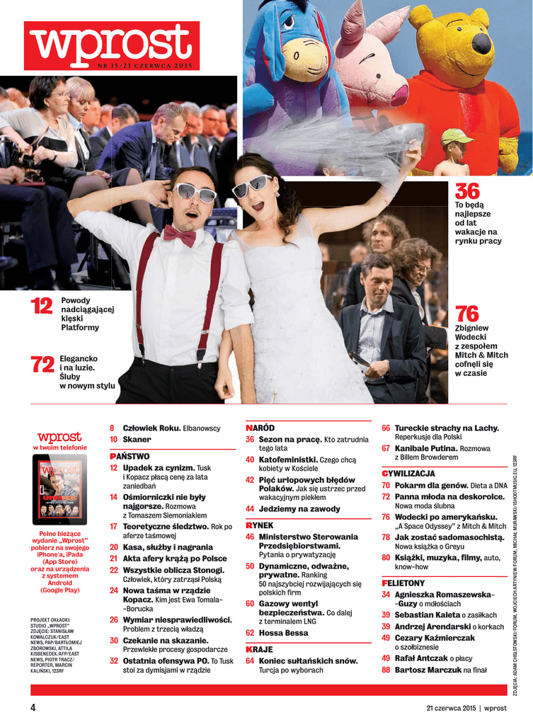 NR 15/21 CZERWCA 2015 36 To będą najlepsze od lat wakacje na rynku pracy 72 Powody nadciągającej klęski Platformy 76 Zbigniew Wodecki z zespołem Mitch & Mitch cofnęli się w czasie Elegancko i na luzie. Śluby w nowym stylu 8 Człowiek Roku. Elbanowscy 10 Skaner PRACA NA WAKACJE DIETA RZĄDZI GENAMI KATOFEMINISTKI IDĄ PO SWOJE NOWE IGRASZKI GREYA NAKŁAD 114 000 15-21 czerwca 2015 PAŃSTWO 12 Upadek za cynizm. Tusk i Kopacz płacą cenę za lata zaniedbań NR INDEKSU 38190X CANADA – CAD 5,25 EUGIW – EUR 2,95 UK – £ 2,83 USA – $ 5,25 NR 25 CENA 5,90 ZŁ (w tym 8% VAT) w twoim telefonie UPADEK GENEZA DEMORALIZACJI JAK CYNIZM ZABIŁ MARZENIA POLAKÓW www.wprost.pl Pełne bieżące wydanie „Wprost” pobierz na swojego iPhone’a, iPada (App Store) oraz na urządzenia z systemem Android (Google Play) 14 Ośmiorniczki nie były najgorsze. Rozmowa z Tomaszem Siemoniakiem 17 Teoretyczne śledztwo. Rok po aferze taśmowej 20 Kasa, służby i nagrania 21 Akta afery krążą po Polsce 22 Wszystkie oblicza Stonogi. Człowiek, który zatrząsł Polską 24 Nowa taśma w rządzie Kopacz. Kim jest Ewa Tomala-Borucka PROJEKT OKŁADKI: STUDIO „WPROST” ZDJĘCIE: STANISŁAW KOWALCZUK/EAST NEWS, PAP/BARTŁOMIEJ ZBOROWSKI, ATTILA KISBENEDEK/AFP/EAST NEWS, PIOTR TRACZ/ REPORTER, MARCIN KALIŃSKI, 123RF 4 26 Wymiar niesprawiedliwości. Problem z trzecią władzą 30 Czekanie na skazanie. Przewlekłe procesy gospodarcze 32 Ostatnia ofensywa PO. To Tusk stoi za dymisjami w rządzie NARÓD 36 Sezon na pracę. Kto zatrudnia tego lata 40 Katofeministki. Czego chcą kobiety w Kościele 42 Pięć urlopowych błędów Polaków. Jak się ustrzec przed wakacyjnym piekłem 44 Jedziemy na zawody RYNEK 46 Ministerstwo Sterowania Przedsiębiorstwami. Pytania o prywatyzację 50 Dynamiczne, odważne, prywatne. Ranking 50 najszybciej rozwijających się polskich firm 60 Gazowy wentyl bezpieczeństwa. Co dalej z terminalem LNG 62 Hossa Bessa KRAJE 64 Koniec sułtańskich snów. Turcja po wyborach 66 Tureckie strachy na Lachy. Reperkusje dla Polski 67 Kanibale Putina. Rozmowa z Billem Browderem CYWILIZACJA 70 Pokarm dla genów. Dieta a DNA 72 Panna młoda na deskorolce. Nowa moda ślubna 76 Wodecki po amerykańsku. „A Space Odyssey” z Mitch & Mitch 78 Jak zostać sadomasochistą. Nowa książka o Greyu 80 Książki, muzyka, filmy, auto, know-how FELIETONY 34 Agnieszka Romaszewska-Guzy o mdłościach 39 Sebastian Kaleta o zasiłkach 39 Andrzej Arendarski o korkach 49 Cezary Kaźmierczak o szołbiznesie 49 Rafał Antczak o płacy 88 Bartosz Marczuk na finał 21 czerwca 2015 | wprost ZDJĘCIA: ADAM CHEŁSTOWSKI/FORUM, WOJCIECH ARTYNIEW/FORUM, MICHAŁ MURAWSKI/ISHOOTMUSIC.EU, 123RF 12