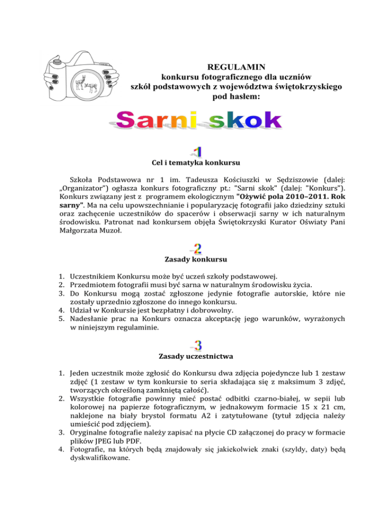 REGULAMIN konkursu fotograficznego dla uczniów szkół podstawowych z województwa świętokrzyskiego pod hasłem: Cel i tematyka konkursu Szkoła Podstawowa nr 1 im. Tadeusza Kościuszki w Sędziszowie (dalej: „Organizator”) ogłasza konkurs fotograficzny pt.: "Sarni skok" (dalej: "Konkurs"). Konkurs związany jest z programem ekologicznym "Ożywić pola 2010–2011. Rok sarny". Ma na celu upowszechnianie i popularyzację fotografii jako dziedziny sztuki oraz zachęcenie uczestników do spacerów i obserwacji sarny w ich naturalnym środowisku. Patronat nad konkursem objęła Świętokrzyski Kurator Oświaty Pani Małgorzata Muzoł. Zasady konkursu 1. Uczestnikiem Konkursu może być uczeń szkoły podstawowej. 2. Przedmiotem fotografii musi być sarna w naturalnym środowisku życia. 3. Do Konkursu mogą zostać zgłoszone jedynie fotografie autorskie, które nie zostały uprzednio zgłoszone do innego konkursu. 4. Udział w Konkursie jest bezpłatny i dobrowolny. 5. Nadesłanie prac na Konkurs oznacza akceptację jego warunków, wyrażonych w niniejszym regulaminie. Zasady uczestnictwa 1. Jeden uczestnik może zgłosić do Konkursu dwa zdjęcia pojedyncze lub 1 zestaw zdjęć (1 zestaw w tym konkursie to seria składająca się z maksimum 3 zdjęć, tworzących określoną zamkniętą całość). 2. Wszystkie fotografie powinny mieć postać odbitki czarno-białej, w sepii lub kolorowej na papierze fotograficznym, w jednakowym formacie 15 x 21 cm, naklejone na biały brystol formatu A2 i zatytułowane (tytuł zdjęcia należy umieścić pod zdjęciem). 3. Oryginalne fotografie należy zapisać na płycie CD załączonej do pracy w formacie plików JPEG lub PDF. 4. Fotografie, na których będą znajdowały się jakiekolwiek znaki (szyldy, daty) będą dyskwalifikowane. 5. Uczestnik zobowiązuje się do zachowania w oryginale fotografii zgłoszonej do Konkursu, jeżeli była ona poddana obróbce. 6. Organizator zastrzega sobie prawo do wyłączenia z udziału w Konkursie fotografii o niskiej jakości technicznej, przesłanych w złym formacie oraz fotografii, które w inny sposób naruszają niniejszy regulamin. 7. Prace nadesłane na konkurs nie będą zwracane autorom. 8. Fotografie należy nadsyłać na Konkurs jako przesyłkę pocztową lub przesyłkę kurierską (na koszt nadsyłającego) do siedziby Organizatora na adres: Szkoła Podstawowa nr 1 ul. Tadeusza Kościuszki 7 28-340 Sędziszów woj. świętokrzyskie „Konkurs fotograficzny – Sarni skok” lub dostarczyć w zaadresowanej kopercie (tak jak powyżej) do sekretariatu szkoły. 9. Prace konkursowe należy przesłać w nieprzekraczalnym terminie do dnia 31.03.2011r. (decyduje data stempla pocztowego). 10. Fotografie nadesłane po terminie nie będą brane pod uwagę w Konkursie. 11. Prace powinny być opatrzone na odwrocie metryczką zawierającą: tytuł zestawu, imię i nazwisko ucznia, klasa, adres e-mail, nazwa szkoły, do której uczęszcza autor fotografii z zaznaczeniem roku nauki oraz dane nauczyciela-opiekuna. 12. Ponadto każdy uczestnik konkursu obowiązany jest dołączyć oświadczenie, o następującej treści: Oświadczam, ze jestem autorem dostarczonego zdjęcia pod tytułem ................................................................................................................................................................................. Tytuł fotografii Wyrażam zgodę na nieodpłatne wykorzystywanie przez Organizatora nadesłanych zdjęć w dowolnym czasie i formie dla celów promocji Konkursu. Jednocześnie, w przypadku przyznania mojej pracy jednej z nagród w konkursie, wyrażam zgodę na nieodpłatne przekazanie autorskich praw do przedmiotowej fotografii w przesłanej rozdzielczości oraz w rozdzielczości umożliwiającej wydruk wysokiej jakości, zgodnie z ustawą z dn. 4 lutego 1994 r. o prawie autorskim i prawach pokrewnych (tj. Dz. U. z 2006 r. Nr 90, poz. 631 z późn. zm.) na wszelkich polach eksploatacji, o których mowa w art.50 tej ustawy, w szczególności: do druku w dowolnej liczbie egzemplarzy, zamieszczanie ich w Internecie oraz w innych formach utrwaleń nadających się do rozpowszechniania (np. nośniki magnetyczne, elektroniczne, optyczne, CD-ROM), wprowadzania do pamięci komputera, publiczne odtwarzanie (w tym poprzez prezentowanie na wystawach w celu upowszechniania wiedzy o programie ekologicznym „Ożywić pola 2010–2011. Rok sarny" Wyrażam zgodę na przetwarzanie swoich danych osobowych dla celów niniejszego Konkursu. zgodnie z art. 6 ustawy z dnia 29.08.97 r. o ochronie danych osobowych (Dz.U. Z 1997 r. Nr 133 poz. 883). ………………………………………………. Czytelny podpis 13. Ze względu na udział w Konkursie uczestników nieletnich należy załączyć pisemną zgodę rodziców na przetwarzanie danych osobowych w celach związanych z rozstrzygnięciem konkursu i wystawą o następującej treści: Wyrażam zgodę na udział mojego podopiecznego / dziecka …………………………………………………………………………………………………………………………………… imię i nazwisko oraz wiek dziecka w konkursie fotograficznym „Sarni skok” organizowanym przez Szkołę Podstawową nr 1 im. Tadeusza Kościuszki w Sędziszowie. Rozumiem i w pełni akceptuję regulamin. Oświadczam, że wyrażam zgodę na przetwarzanie i wykorzystanie danych osobowych dla celów niniejszego konkursu zgodnie z art. 6 ustawy z dnia 29.08.97 r. o ochronie danych osobowych (Dz. U. Z 1997 r. Nr 133 poz. 883).” ………………………………………………. czytelny podpis rodzica/opiekuna 14. Uczestnik Konkursu przyjmuje na siebie wszelkie roszczenia jakiejkolwiek natury, które osoby trzecie mogłyby kierować przeciwko organizatorom konkursu. Nagrody 1. Autorom najlepszych zdjęć zostaną przyznane atrakcyjne nagrody rzeczowe. 2. Wszyscy uczestnicy otrzymają dyplom za udział w Konkursie, a nauczyciel