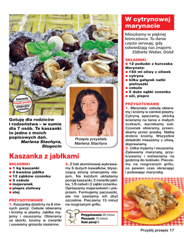 W cytrynowej marynacie Mieszkamy w pięknej leśniczówce. To danie często serwuję, gdy odwiedzają nas znajomi. Elżbieta Weber, Dolsk SKŁADNIKI ● 12 podudzi z kurczaka Marynata: ● 150 ml oliwy z oliwek ● cytryna ● kilka gałązek natki pietruszki ● cebula ● 2 duże ząbki czosnku ● sól, pieprz Testowała pis Przyślij prze redakcyjna kucharka Gotuję dla rodziców i rodzeństwa – w sumie dla 7 osób. Te T kaszanki to jedno z moich popisowych dań. Marlena Stachyra, Sługocin Przepis przysłała Marlena Stachyra Kaszanka z jabłkami 2. Z folii aluminiowej wykrawamy 6 dużych kawałków, błyszczącą stronę smarujemy olejem. Na każdym układamy porcję kaszanki, 2 ćwiartki jabłka, 1/6 cebuli i 2 ząbki czosnku. Oprószamy majerankiem i pieprzem. Formujemy paczuszki, ale nie zawijamy ich zbyt PRZYGOTOWANIE szczelnie. Pieczemy 15 minut 1. Kaszankę dzielimy na 6 rów- na rozgrzanym grillu. nych porcji. Cebule obieramy i kroimy w plastry. Jabłka myPrzygotowanie 20 minut jemy i osuszamy. Obieramy Pieczenie 15 minut ze skórki, kroimy w ćwiartki Ilość porcji 6 i usuwamy gniazda nasienne. SKŁADNIKI ● 1 kg kaszanki ● 3 kwaśne jabłka ● 12 ząbków czosnku ● 3 cebule ● majeranek ● pieprz ziołowy ● olej PRZYGOTOWANIE 1. Marynata: cebulę obieramy i kroimy w cienkie plastry. Cytrynę sparzamy, skórkę ścieramy na tarce o małych oczkach, wyciskamy sok. Czosnek obieramy, przeciskamy przez praskę. Natkę drobno kroimy. Wszystkie składniki mieszamy z oliwą, doprawiamy. 2. Udka myjemy i osuszamy. Zalewamy marynatą, przykrywamy i wstawiamy na godzinę do lodówki. Pieczemy na rozgrzanym grillu, co pewien czas obracając i polewając marynatą. Przyślij przepis 17