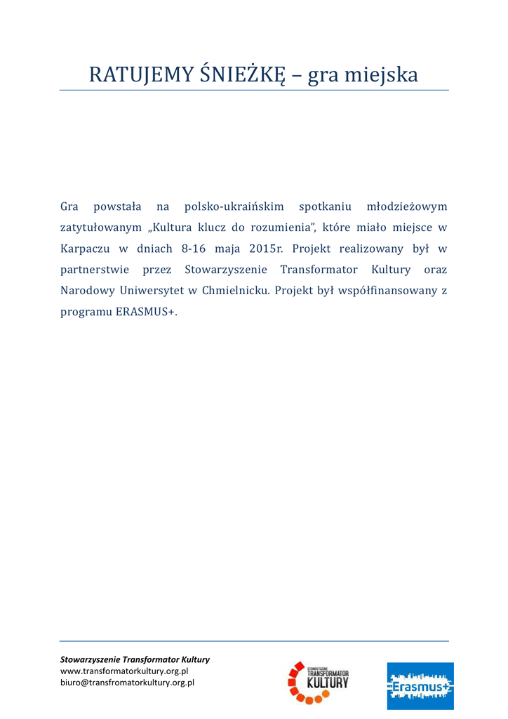 RATUJEMYSNIEZKĘ–gramiejska Gra powstała na polsko-ukraiń skim spotkaniu młodzież owym zatytułowanym „Kultura klucz do rozumienia”, któ re miało miejsce w Karpaczu w dniach 8-16 maja 2015r. Projekt realizowany był w partnerstwie przez Stowarzyszenie Transformator Kultury oraz Narodowy Uniwersytet w Chmielnicku. Projekt był wspó łfinansowany z programuERASMUS+. Stowarzyszenie Transformator Kultury www.transformatorkultury.org.pl [email protected] Ratujmy Snież kę! Śnieżka od tysięcy lat leży w krainie Lodołamaczy, niedaleko od miejscowości Karpacz. Ich sąsiadami jest śniegolubny lud zwany Śniegołapy. Pomiędzy ludami coraz częściej dochodzi do konfliktów. Śniegołapy domagają się oddania im Śnieżki. Ich postulaty pozostają bez odpowiedzi i Śniegołapy podczas ostatniej zimy zajęły Górę. Bogaty lud Śniegołapów przekupuje Lodołamaczy z Karpacza- dlatego część mieszkańców Karpacza godzi się na oddanie Śnieżki. W mieście zapada CHAOS. Potrzebujemy Was Turyści do przywrócenia ładu w naszym mieście! Weźcie udział w naszej grze i uratujcie Śnieżkę! Stowarzyszenie Transformator Kultury www.transformatorkultury.org.pl [email protected] Instrukcjadlaprowadzącego Dzielisz grupę na mniejsze grupy i każ dej z nich rozdajesz: regulamin, kartęstartowąorazponumerowanekopertyzposzczegó lnymiadresami, w któ rych są zadania. Ustalasz jeden punkt startowy i metę. Jeś li nie chceszbydruż ynyspotkałysięnaposzczegó lnychpunktachtokolejnoś ć punktó w od startu do mety, każ dej grupie ustalasz inny. Wpisując numerkiprzyadresachwkarciestartowej.Tesamenumerkiwypisujesz na kopertach do zadań dotyczących danego adresu. Zaplanuj grę w taki sposó babynamecieczekałanagraczynagrodalubniespodzianka.Jeś li graczenieznajądobrzetopografiimiastadobrzebyłobyrozdać immapy miejscowoś ci. Gra moż e być bezobsługowa jednak jeś li jesteś w stanie zorganizować w każ dym punkcie osobę, któ ra pomoż e uczestnikom rozwiązać zadaniei przyzna im punkty za dobrzewykonane zadanie na pewnobyłobytoatrakcyjniejsze.Jeś liniemoż esztegotakzorganizować to niech uczestnicy zapisują odpowiedzi na karcie startowej a na koń cu namecieopiekungrysprawdziimodpowiedziiprzyznapunkty.Każ daz druż yndostajetylekopertilejestpunktó wgry(adresó w).Przedkaż dym zadaniemjestinstrukcjadoprowadzącegojakmaprzygotować kopertęz danymadresem.Udanejzabawy! Stowarzyszenie Transformator Kultury www.transformatorkultury.org.pl [email protected] Regulamingrymiejskiej RatujmySnież kę! 1. W grze mogą wziąć udział 3 grupy. 2. Wszyscy uczestnicy muszą zarejestrować się przy starcie. Gra zaczyna się o godzinie ……. i trwa do ...................... 3. Każda drużyna otrzymuje kartę startową. 4. Drużyny powinny wymyśleć własną nazwę zespołu. 5. Panuje dowolność kolejności wykonania zadań, oprócz startu i mety, które są jednakowe dla wszystkich zespołów. 6. Docierając do kolejnego punktu w karcie startowej otwieracie kopertę z zadaniem przypisaną danemu adresowi. 7. Po ukończeniu każdego zadania drużyna zapisuje odpowiedzi otrzymuje i robi zdjęcie grupowe. 8. Po ukończeniu wszystkich zadań czeka na wszystkich niespodzianka. Stowarzyszenie Transformator Kultury www.transformatorkultury.org.pl [email protected] RatujmySnież kę! Gramiejska Karta startowa Zespołu: ................................................................................................................................ Członkowie zespołu: 1. ........................................................................................ 2. ......................................................................................... 3. ......................................................................................... 4. ......................................................................................... 5. ......................................................................................... 6. ......................................................................................... 7. ......................................................................................... 8. ......................................................................................... 9. ......................................................................................... 10. ....................................................................................... Lp. Numer koperty ADRES 1. Urząd Miasta Ul. Konstytucji 3 maja 54 Hotel CHROBRY Ul. Konstytucji 3 maja 78 Ul. Konstytucji 3 maja 26 Karkonoskie Tajemnice Ul. Adama Mickiewicza 1a Muzeum Zabawek Ul. Kolejowa 3 6. Ul. Konstytucji 3 maja 80 Stowarzyszenie Transformator Kultury www.transformatorkultury.org.pl [email protected] ODPOWIEDZI ZDOBYTE PUNKTY Urząd Miasta Ul. Konstytucji 3 maja 54 Zadanie Do prowadzącego: odetnij nazwy od rysunków do koperty z tym zadaniem wsadź treść zadania i zdjęcia. Zadanie: Przed Wami zagadka- jej rozwiązanie pomoże uratować Śnieżkę. Musicie pomóc skompletować sprzęt wspinaczkowy Lodołamaczom. Zastanówcie się, do czego służą te przedmioty. Wiedzy szukajcie u przechodniów i wszędzie gdzie to możliwe. Na metę musicie przynieś podpisane wizerunki przedmiotów. ♦♦♦ Raki Stowarzyszenie Transformator Kultury www.transformatorkultury.org.pl [email protected] Lonża Uprząż Ósemka Jumar Stowarzyszenie Transformator Kultury www.transformatorkultury.org.pl [email protected] Hotel CHROBRY Ul. Konstytucji 3 maja 78 Zadanie Do prowadzącego: do koperty z tym adresem wsadź jedynie treść zadania. Zadanie: Dotarliście do siedzimy strajkujących Tragarzy, którzy nie godzą się na oddanie Śnieżki. Dowiedzcie się, dlaczego? Na podstawie tablicy informacyjnej przy D.W. Chrobry dowiedzcie się: Kim i czym się zajmowali Tragarze w Karpaczu? Co to jest lettyka? Ile osób nosi jedną lektykę Tragarze………………………………………………