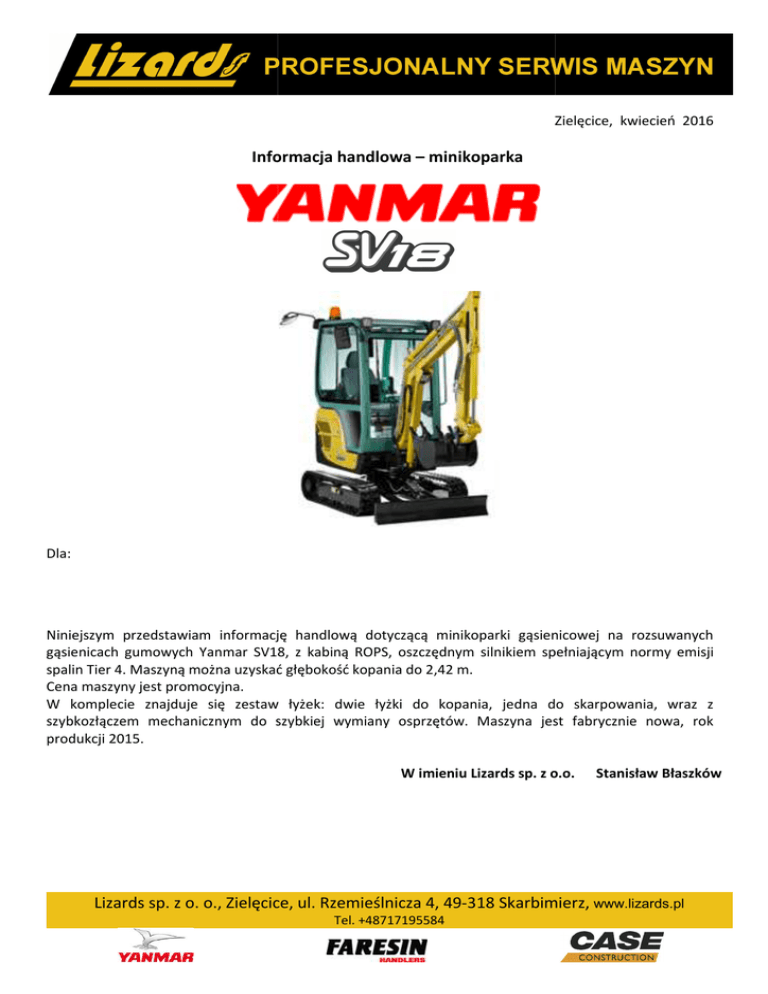 Zielęcice kwiecień 2016 Zielęcice, Informacja handlowa – minikoparka Dla: Niniejszym przedstawiam informację handlową dotyczącą minikoparki gąsienicowej na rozsuwanych gąsienicach gumowych Yanmar SV18, SV18, z kabiną ROPS, oszczędnym silnikiem spełniającym spełniaj normy emisji spalin Tier 4. Maszyną można uzyskać głębokość kopania do 2,42 m. Cena maszyny jest promocyjna. W komplecie znajduje się zestaw łyżek: dwie łyżki do kopania, jedna jedna do skarpowania, wraz z szybkozłączem mechanicznym do szybkiej wymiany osprzętów. osprzętów. Maszyna jest fabrycznie nowa, rok produkcji 2015. W imieniu Lizards sp. z o.o. Stanisław Błaszków Lizards sp. z o. o., Zielęcice, ul. Rzemieślnicza 4, 49-318 49 318 Skarbimierz, www.lizards.pl Tel. +48717195584 Specyfikacja Ciężar Silnik Układ hydrauliczny Osiągi Podwozie Płyny i smarowanie Kabina Pozostałe Osprzęt Minikoparka Yanmar SV18 VSI Maszyna na fabrycznie nowa, rocznik 2015 Ciężar roboczy 1975 kg / gumowe gąsienice, wersja z kabiną 2 Nacisk na podłoże 0,33 kg/cm Yanmar Diesel 3TNV70-VBVA2, 3TNV70 Tier 4, wtrysk bezpośredni Moc silnika 9,9 kW / 13,5 HP / 2100 obr/min 3 Pojemność skokowa 854 cm Max. moment 51,4 Nm / 1500 obr/min Chłodzenie cieczą Ciśnienie maksymalne 200 bar Pompa tłoczkowa o zmiennym przepływie, max 48,3 l/min LUDV (podział przepływu) Trzeci, proporcjonalny obwód hydrauliczny wyprowadzony na ramię wysięgnika Prędkość jazdy 2,2 / 4,1 km/h Prędkość obrotu kabiny 10 obr/min Siła kopania ramię 7,4 kN / 755 kgf Siła kopania łyżka 15,2 kN / 1550 kgf Siła uciągu 17 kN Kąt podjazdu 30° Poziom hałasu (2000/14/CE & 2005/88/CE) 91 dBA Poziom hałasu w kabinie 79 dBA Ilość rolek jezdnych 3 Napinanie gąsienicy siłownikiem smarowym Podwozie rozszerzane hydraulicznie Zbiornik paliwa 24,5 l Układ chłodzenia 3,2 l Olej silnikowy 2,8 l Olej hydrauliczny 20 l zbiornik / 28,5 l układ Wyświetlacz LCD Komfortowy fotel operatora obity tkaniną z wysokim oparciem,, zagłówkiem, podłokietnikami i wielozakresową regulacją oraz pasami; podnóżki Otwierane przez przesuwanie w górę, przednie okno, zdejmowana dolna część; część otwierane przez przesunięcie prawe okno; okno szyba zyba w przedniej, narożnej części dachu Wycieraczki szyb i spryskiwacze Oświetlenie kabiny, schowki, gniazdo prądowe 12 V Trzy lusterka wsteczne; lampa świateł roboczych na wysięgniku Osłony siłowników wysięgnika i lemiesza; lemiesza; rękawy osłaniające przewody hydrauliczne Lakier nanoszony metodą kationową Zamykane na klucz zbiorniki paliwa o oleju hydraulicznego Skrzynka narzędziowa z zawartością; zawartością smarownica Instrukcja operatora; operatora katalog części zamiennych Łyżka kopiąca podsiębierna 300 mm Łyżka kopiąca podsiębierna 600 mm Łyżka skarpowa uchylna hydraulicznie 1000 mm Szybkozłącze mechaniczne do mocowania łyżek / innych osprzętów, standard Lehnhoff Lizards sp. z o. o., Zielęcice, ul. Rzemieślnicza 4, 49-318 49 318 Skarbimierz, www.lizards.pl Tel. +48717195584 Wymiary (mm) A 3660 A’ 3775 B 2280 C 980 / 1320 D 1180 E 1560 F 750 / 1090 G 230 H 980 / 1320 I 230 J 1095 K 240 L 300 M 160 N 410 Zasięg roboczy (mm) A 2420 B 2580 C 3950 D 4040 E 2140 F 2740 G 3760 H o 40 I o 80 J 1160 K 1540 L 1340 Lizards sp. z o. o., Zielęcice, ul. Rzemieślnicza 4, 49-318 49 318 Skarbimierz, www.lizards.pl Tel. +48717195584 M 980 Gwarancja Gwarancja pokrywająca części zamienne, robociznę i dojazd na okres 12 miesięcy lub 1000 godzin pracy maszyny, w zależności od tego, który z warunków nastąpi pierwszy. Gwarancja pokrywająca części układu przeniesienia napędu (Power Train), adekwatną robociznę i dojazd na okres dodatkowych 12 miesięcy lub 1000 godzin pracy maszyny, w zależności od tego, który z warunków nastąpi pierwszy. Opcjonalna Gwaranca Plus - długoterminowa umowa zawierająca zestaw rozwiązań rozszerzających zakres ochrony. Warunki gwarancji opisują szczegółowo odpowiednie umowy gwarancji. Serwis Wyjazdowy i stacjonarny serwis gwarancyjny oraz pogwarancyjny maszyn Yanmar w punktach Lizards sp. z o. o. na terenie Polski w lokalizacjach dostępnych na stronie internetowej spółki. Prowadzenie przez Lizards sp. z o. o. dokumentacji obsługi serwisowej maszyny, w ramach wewnętrznych procedur, za pomocą zawansowanego Systemu Obsługi Serwisu, dającego możliwość raportowania zainteresowanym historii serwisowej maszyny. Szybki dostęp do części zamiennych, osprzętów i akcesoriów akcesoriów oraz doradztwa serwisowego ramach sieci dilerskiej Yanmar. Zamówienie Pisemne zamówienie klienta z podpisem osoby upoważnionej do reprezentowania przedsiębiorstwa. Płatność Przelew bankowy. Numer rachunku bankowego dostawcy, oraz przedmiot zamówienia wyszczególniony zostanie na fakturze proforma wystawionej na zamówienie klienta. Dla dokonanej wpłaty zostanie wystawiona odpowiednia faktura VAT. Dostawa Loco klient na terenie Polski. Do 2 tygodni od złożenia zamówienia i dokonania płatności. Cena Cena jednostkowa netto, należy doliczyć podatek VAT w wysokości 23%. Ceny w EUR zostaną przeliczone na PLN wg kursu średniego EUR w NBP obowiązującym w dniu wystawienia faktury VAT, tj. w dniu dostawy maszyny do klienta. Ważność oferty Dla zamówień złożonych i spełniających warunki płatności do tej daty. Opcje za dopłatą Kabina otwarta (daszek) ROPS / FOPS Zestaw dźwigowy (hak i zawory bezpieczeństwa na ramię, wysięgnik i pług) Siedzenie ze skaju (dla wersji kabina) Zabezpieczenie przeciw-kradzieżowe przeciw Olej hydrauliczny biodegradowalny Radio Dwa dodatkowe światła robocze na kabinie Obrotowe światło ostrzegawcze, pomarańczowe Specjalny jeden lub dwa kolory (wg RAL) Przedłużona gwarancja Łyżki, młoty wyburzeniowe i inne osprzęty Wygląd produktu może nieznacznie odbiegać od przedstawionego na rysunkach i zdjęciach, co nie ma wpływu na przedstawioną funkcjonalnoś
