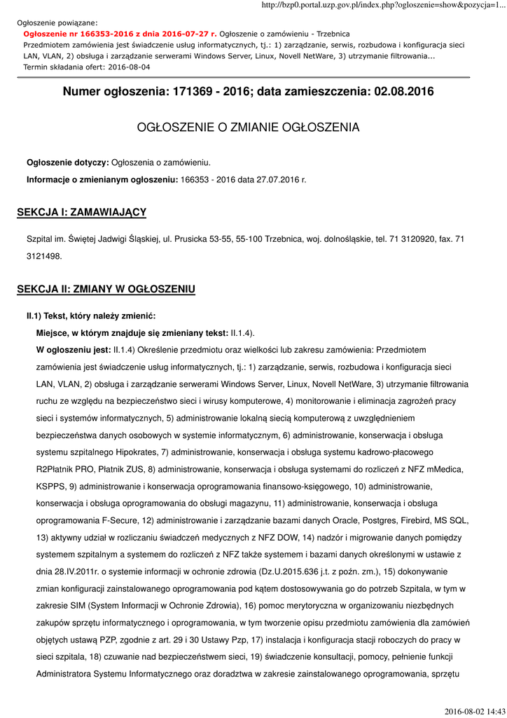 http://bzp0.portal.uzp.gov.pl/index.php?ogloszenie=show&pozycja=1... Ogłoszenie powiązane: Ogłoszenie nr 166353-2016 z dnia 2016-07-27 r. Ogłoszenie o zamówieniu - Trzebnica Przedmiotem zamówienia jest świadczenie usług informatycznych, tj.: 1) zarządzanie, serwis, rozbudowa i konfiguracja sieci LAN, VLAN, 2) obsługa i zarządzanie serwerami Windows Server, Linux, Novell NetWare, 3) utrzymanie filtrowania... Termin składania ofert: 2016-08-04 Numer ogłoszenia: 171369 - 2016; data zamieszczenia: 02.08.2016 OGŁOSZENIE O ZMIANIE OGŁOSZENIA Ogłoszenie dotyczy: Ogłoszenia o zamówieniu. Informacje o zmienianym ogłoszeniu: 166353 - 2016 data 27.07.2016 r. SEKCJA I: ZAMAWIAJĄCY Szpital im. Świętej Jadwigi Śląskiej, ul. Prusicka 53-55, 55-100 Trzebnica, woj. dolnośląskie, tel. 71 3120920, fax. 71 3121498. SEKCJA II: ZMIANY W OGŁOSZENIU II.1) Tekst, który należy zmienić: Miejsce, w którym znajduje się zmieniany tekst: II.1.4). W ogłoszeniu jest: II.1.4) Określenie przedmiotu oraz wielkości lub zakresu zamówienia: Przedmiotem zamówienia jest świadczenie usług informatycznych, tj.: 1) zarządzanie, serwis, rozbudowa i konfiguracja sieci LAN, VLAN, 2) obsługa i zarządzanie serwerami Windows Server, Linux, Novell NetWare, 3) utrzymanie filtrowania ruchu ze względu na bezpieczeństwo sieci i wirusy komputerowe, 4) monitorowanie i eliminacja zagrożeń pracy sieci i systemów informatycznych, 5) administrowanie lokalną siecią komputerową z uwzględnieniem bezpieczeństwa danych osobowych w systemie informatycznym, 6) administrowanie, konserwacja i obsługa systemu szpitalnego Hipokrates, 7) administrowanie, konserwacja i obsługa systemu kadrowo-płacowego R2Płatnik PRO, Płatnik ZUS, 8) administrowanie, konserwacja i obsługa systemami do rozliczeń z NFZ mMedica, KSPPS, 9) administrowanie i konserwacja oprogramowania finansowo-księgowego, 10) administrowanie, konserwacja i obsługa oprogramowania do obsługi magazynu, 11) administrowanie, konserwacja i obsługa oprogramowania F-Secure, 12) administrowanie i zarządzanie bazami danych Oracle, Postgres, Firebird, MS SQL, 13) aktywny udział w rozliczaniu świadczeń medycznych z NFZ DOW, 14) nadzór i migrowanie danych pomiędzy systemem szpitalnym a systemem do rozliczeń z NFZ także systemem i bazami danych określonymi w ustawie z dnia 28.IV.2011r. o systemie informacji w ochronie zdrowia (Dz.U.2015.636 j.t. z poźn. zm.), 15) dokonywanie zmian konfiguracji zainstalowanego oprogramowania pod kątem dostosowywania go do potrzeb Szpitala, w tym w zakresie SIM (System Informacji w Ochronie Zdrowia), 16) pomoc merytoryczna w organizowaniu niezbędnych zakupów sprzętu informatycznego i oprogramowania, w tym tworzenie opisu przedmiotu zamówienia dla zamówień objętych ustawą PZP, zgodnie z art. 29 i 30 Ustawy Pzp, 17) instalacja i konfiguracja stacji roboczych do pracy w sieci szpitala, 18) czuwanie nad bezpieczeństwem sieci, 19) świadczenie konsultacji, pomocy, pełnienie funkcji Administratora Systemu Informatycznego oraz doradztwa w zakresie zainstalowanego oprogramowania, sprzętu 2016-08-02 14:43 http://bzp0.portal.uzp.gov.pl/index.php?ogloszenie=show&pozycja=1... komputerowego, 20) konfiguracja oprogramowania według wytycznych użytkowników w zakresie możliwości systemu, 21) tworzenie i weryfikacja kopii zapasowych systemów używanych przez Zamawiającego, 22) określenie i konsultowanie działań mających na celu rozwój systemu informatycznego Szpitala, 23) administrowanie i obsługa serwera poczty elektronicznej (m.in. zakładanie i likwidowanie kont poczty elektronicznej), 24) rozwijanie i utrzymanie aktualnej strony internetowej Zamawiającego, 25) administrowanie i obsługa stron WWW, DNS, w tym m.in.: - aktualizowanie i modyfikowanie aktualnej strony internetowej Zamawiającego, 26) modyfikacje strony internetowej Szpitala pod kątem technologii flash (action script), java script, php, dom, xhtml, 27) archiwizacja danych na trwałych i nietrwałych nośnikach, 28) modyfikacje skryptów arkuszy kalkulacyjnych visual basic, 29) diagnoza i konserwacja sprzętu komputerowego, 30) serwis, naprawa sprzętu komputerowego (z wyłączeniem sprzętu peryferyjnego). W ogłoszeniu powinno być: II.1.4) Określenie przedmiotu oraz wielkości lub zakresu zamówienia: Przedmiotem zamówienia jest świadczenie usług informatycznych, tj.: 1) zarządzanie, serwis, rozbudowa i konfiguracja sieci LAN, VLAN, 2) obsługa i zarządzanie serwerami Windows Server, Linux, Novell NetWare, 3) utrzymanie filtrowania ruchu ze względu na bezpieczeństwo sieci i wirusy komputerowe, 4) monitorowanie i eliminacja zagrożeń pracy sieci i systemów informatycznych, 5) administrowanie lokalną siecią komputerową z uwzględnieniem bezpieczeństwa danych osobowych w systemie informatycznym, 6) administrowanie, konserwacja i obsługa systemu szpitalnego Hipokrates, 7) administrowanie, konserwacja i obsługa systemu kadrowo-płacowego R2Płatnik PRO, Płatnik ZUS, 8) administrowanie, konserwacja i obsługa systemami do rozliczeń z NFZ mMedica, KSPPS, 9) administrowanie i konserwacja oprogramowania finansowo-księgowego, 10) administrowanie, konserwacja i obsługa oprogramowania do obsługi magazynu, 11) administrowanie, konserwacja i obsługa oprogramowania F-Secure, 12) administrowanie i zarządzanie bazami danych Oracle, Postgres, Firebird, MS SQL, 13) aktywny udział w rozliczaniu świadczeń medycznych z NFZ DOW, 14) nadzór i migrowanie danych pomiędzy systemem szpitalnym a systemem do rozliczeń z NFZ także systemem i bazami danych określonymi w ustawie z dnia 28.IV.2011r. o systemie informacji w ochronie zdrowia (Dz.U.2015.636 j.t. z poźn. zm.), 15) dokonywanie zmian konfiguracji zainstalowanego oprogramowania pod kątem dostosowywania go do potrzeb Szpitala, w tym w zakresie SIM (System Informacji w Ochronie Zdrowia), 16) pomoc merytoryczna w organizowaniu niezbędnych zakupów sprzętu informatycznego i o