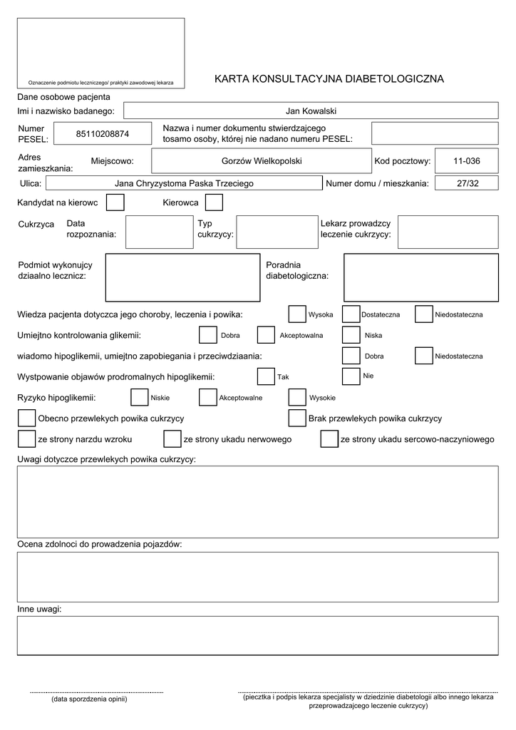 KARTA KONSULTACYJNA DIABETOLOGICZNA Oznaczenie podmiotu leczniczego/ praktyki zawodowej lekarza Dane osobowe pacjenta Imi i nazwisko badanego: Numer PESEL: Jan Kowalski 85110208874 Adres zamieszkania: Nazwa i numer dokumentu stwierdzajcego tosamo osoby, której nie nadano numeru PESEL: Miejscowo: Ulica: Gorzów Wielkopolski Jana Chryzystoma Paska Trzeciego Kandydat na kierowc Cukrzyca Kod pocztowy: 11-036 Numer domu / mieszkania: 27/32 Kierowca Data rozpoznania: Typ cukrzycy: Lekarz prowadzcy leczenie cukrzycy: Podmiot wykonujcy dziaalno lecznicz: Poradnia diabetologiczna: Wiedza pacjenta dotyczca jego choroby, leczenia i powika: Umiejtno kontrolowania glikemii: Wysoka Dobra Akceptowalna wiadomo hipoglikemii, umiejtno zapobiegania i przeciwdziaania: Wystpowanie objawów prodromalnych hipoglikemii: Ryzyko hipoglikemii: Niskie Niedostateczna Nie Tak Akceptowalne Niedostateczna Niska Dobra Obecno przewlekych powika cukrzycy ze strony narzdu wzroku Dostateczna Wysokie Brak przewlekych powika cukrzycy ze strony ukadu nerwowego ze strony ukadu sercowo-naczyniowego Uwagi dotyczce przewlekych powika cukrzycy: Ocena zdolnoci do prowadzenia pojazdów: Inne uwagi: (data sporzdzenia opinii) (piecztka i podpis lekarza specjalisty w dziedzinie diabetologii albo innego lekarza przeprowadzajcego leczenie cukrzycy) KARTA KONSULTACYJNA DIABETOLOGICZNA Oznaczenie podmiotu leczniczego/ praktyki zawodowej lekarza Dane osobowe pacjenta Imi i nazwisko badanego: Numer PESEL: Jan Kowalski 85110208874 Adres zamieszkania: Nazwa i numer dokumentu stwierdzajcego tosamo osoby, której nie nadano numeru PESEL: Miejscowo: Ulica: Gorzów Wielkopolski Jana Chryzystoma Paska Trzeciego Kandydat na kierowc Cukrzyca Kod pocztowy: 11-036 Numer domu / mieszkania: 27/32 Kierowca Data rozpoznania: Typ cukrzycy: Lekarz prowadzcy leczenie cukrzycy: Podmiot wykonujcy dziaalno lecznicz: Poradnia diabetologiczna: Wiedza pacjenta dotyczca jego choroby, leczenia i powika: Umiejtno kontrolowania glikemii: Wysoka Dobra Akceptowalna wiadomo hipoglikemii, umiejtno zapobiegania i przeciwdziaania: Wystpowanie objawów prodromalnych hipoglikemii: Ryzyko hipoglikemii: Niskie Niedostateczna Nie Tak Akceptowalne Niedostateczna Niska Dobra Obecno przewlekych powika cukrzycy ze strony narzdu wzroku Dostateczna Wysokie Brak przewlekych powika cukrzycy ze strony ukadu nerwowego ze strony ukadu sercowo-naczyniowego Uwagi dotyczce przewlekych powika cukrzycy: Ocena zdolnoci do prowadzenia pojazdów: Inne uwagi: (data sporzdzenia opinii) (piecztka i podpis lekarza specjalisty w dziedzinie diabetologii albo innego lekarza przeprowadzajcego leczenie cukrzycy)