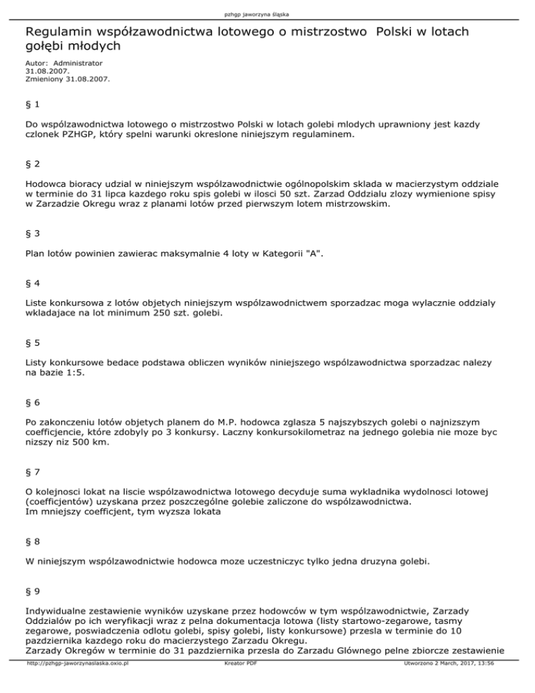 pzhgp jaworzyna śląska Regulamin współzawodnictwa lotowego o mistrzostwo Polski w lotach gołębi młodych Autor: Administrator 31.08.2007. Zmieniony 31.08.2007. §1 Do wspólzawodnictwa lotowego o mistrzostwo Polski w lotach golebi mlodych uprawniony jest kazdy czlonek PZHGP, który spelni warunki okreslone niniejszym regulaminem. §2 Hodowca bioracy udzial w niniejszym wspólzawodnictwie ogólnopolskim sklada w macierzystym oddziale w terminie do 31 lipca kazdego roku spis golebi w ilosci 50 szt. Zarzad Oddzialu zlozy wymienione spisy w Zarzadzie Okregu wraz z planami lotów przed pierwszym lotem mistrzowskim. §3 Plan lotów powinien zawierac maksymalnie 4 loty w Kategorii "A". §4 Liste konkursowa z lotów objetych niniejszym wspólzawodnictwem sporzadzac moga wylacznie oddzialy wkladajace na lot minimum 250 szt. golebi. §5 Listy konkursowe bedace podstawa obliczen wyników niniejszego wspólzawodnictwa sporzadzac nalezy na bazie 1:5. §6 Po zakonczeniu lotów objetych planem do M.P. hodowca zglasza 5 najszybszych golebi o najnizszym coefficjencie, które zdobyly po 3 konkursy. Laczny konkursokilometraz na jednego golebia nie moze byc nizszy niz 500 km. §7 O kolejnosci lokat na liscie wspólzawodnictwa lotowego decyduje suma wykladnika wydolnosci lotowej (coefficjentów) uzyskana przez poszczególne golebie zaliczone do wspólzawodnictwa. Im mniejszy coefficjent, tym wyzsza lokata §8 W niniejszym wspólzawodnictwie hodowca moze uczestniczyc tylko jedna druzyna golebi. §9 Indywidualne zestawienie wyników uzyskane przez hodowców w tym wspólzawodnictwie, Zarzady Oddzialów po ich weryfikacji wraz z pelna dokumentacja lotowa (listy startowo-zegarowe, tasmy zegarowe, poswiadczenia odlotu golebi, spisy golebi, listy konkursowe) przesla w terminie do 10 pazdziernika kazdego roku do macierzystego Zarzadu Okregu. Zarzady Okregów w terminie do 31 pazdziernika przesla do Zarzadu Glównego pelne zbiorcze zestawienie http://pzhgp-jaworzynaslaska.oxio.pl Kreator PDF Utworzono 2 March, 2017, 13:56 pzhgp jaworzyna śląska wyników oraz pelna dokumentacja lotowa dotyczaca 10 najlepszych hodowców w tym wspólzawodnictwie. § 10 W niniejszym wspólzawodnictwie lotowym sklasyfikowanych zostanie : - 3 mistrzów - nagrodzonych pucharami - 100 przodowników - nagrodzonych dyplomami. http://pzhgp-jaworzynaslaska.oxio.pl Kreator PDF Utworzono 2 March, 2017, 13:56