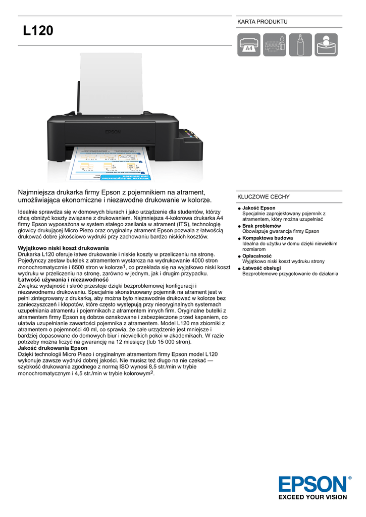 KARTA PRODUKTU L120 Najmniejsza drukarka firmy Epson z pojemnikiem na atrament, umożliwiająca ekonomiczne i niezawodne drukowanie w kolorze. Idealnie sprawdza się w domowych biurach i jako urządzenie dla studentów, którzy chcą obniżyć koszty związane z drukowaniem. Najmniejsza 4-kolorowa drukarka A4 firmy Epson wyposażona w system stałego zasilania w atrament (ITS), technologię głowicy drukującej Micro Piezo oraz oryginalny atrament Epson pozwala z łatwością drukować dobre jakościowo wydruki przy zachowaniu bardzo niskich kosztów. Wyjątkowo niski koszt drukowania Drukarka L120 oferuje łatwe drukowanie i niskie koszty w przeliczeniu na stronę. Pojedynczy zestaw butelek z atramentem wystarcza na wydrukowanie 4000 stron monochromatycznie i 6500 stron w kolorze1, co przekłada się na wyjątkowo niski koszt wydruku w przeliczeniu na stronę, zarówno w jednym, jak i drugim przypadku. Łatwość używania i niezawodność Zwiększ wydajność i skróć przestoje dzięki bezproblemowej konfiguracji i niezawodnemu drukowaniu. Specjalnie skonstruowany pojemnik na atrament jest w pełni zintegrowany z drukarką, aby można było niezawodnie drukować w kolorze bez zanieczyszczeń i kłopotów, które często występują przy nieoryginalnych systemach uzupełniania atramentu i pojemnikach z atramentem innych firm. Oryginalne butelki z atramentem firmy Epson są dobrze oznakowane i zabezpieczone przed kapaniem, co ułatwia uzupełnianie zawartości pojemnika z atramentem. Model L120 ma zbiorniki z atramentem o pojemności 40 ml, co sprawia, że całe urządzenie jest mniejsze i bardziej dopasowane do domowych biur i niewielkich pokoi w akademikach. W razie potrzeby można liczyć na gwarancję na 12 miesięcy (lub 15 000 stron). Jakość drukowania Epson Dzięki technologii Micro Piezo i oryginalnym atramentom firmy Epson model L120 wykonuje zawsze wydruki dobrej jakości. Nie musisz też długo na nie czekać — szybkość drukowania zgodnego z normą ISO wynosi 8,5 str./min w trybie monochromatycznym i 4,5 str./min w trybie kolorowym2. KLUCZOWE CECHY Jakość Epson Specjalnie zaprojektowany pojemnik z atramentem, który można uzupełniać Brak problemów Obowiązuje gwarancja firmy Epson Kompaktowa budowa Idealna do użytku w domu dzięki niewielkim rozmiarom Opłacalność Wyjątkowo niski koszt wydruku strony Łatwość obsługi Bezproblemowe przygotowanie do działania SPECYFIKACJE PRODUKTU L120 TECHNIKA Metoda drukowania Głowica drukująca Micro Piezo™ firmy Epson Minimalna wielkość kropel 3 pl, Z technologią kropli o zmiennej wielkości Technologia tuszów Dye Ink Rozdzielczość drukowania 720 x 720 DPI Konfiguracja dysz 180 dysz czarnych, 59 dysz na kolor Wydajność Jedno stanowisko DRUKOWANIE ZAWARTOŚĆ ZESTAWU Urządzenie podstawowe Kabel zasilający Sterowniki i programy pomocnicze (CD) 4 oddzielne butelki (40 ml) z atramentem (czarny, cyjan, żółty, magenta) Szybkość druku ISO/IEC 24734 8,5 Str./min. Monochromatyczny, 4,5 Str./min. Colour Kolory ZGODNOŚĆ WKŁADÓW ATRAMENTOWYCH Czarny, Cyjan, Żółty, Magenta OBSŁUGA PAPIERU / NOŚNIKÓW Liczba przegródek do papieru 1 Formaty papieru A4, Letter, Użytkownika, Legal Dwustronne Ręczna obsługa Pojemność podajnika papieru 50 Arkusze W standardzie Przetwarzanie nośników Ręczny druk dwustronny T6641 T6642 T6643 wydruku INFORMACJE OGÓLNE T6644 Zużycie energii 0,6 W (tryb uśpienia), 10 W (drukowanie), 2 W Gotowy, 0,3 W (wyłączyć) Wymiary produktu 461 x 215 x 130 mm (Szerokość x Głębokość x Wysokość) Waga produktu 2,4 kg Kompatybilne systemy Mac OS 10.5+, Windows 7, Windows 8, Windows Vista, Windows XP operacyjne Napięcie zasilania AC 100 V - 240 V,50 Hz - 60 Hz Przyłącza USB Zasilanie 100 V, 110V, 220 V, 240V WYDAJNOŚĆ ATRAMENTÓW T664 Series Liczba stron: 4.000* INNE FUNKCJE Karty pamięci Liczba stron: 6.500* nie dot. Colour composite INNE Gwarancja 12 miesiące/miesięcy Klient zanosi do serwisu, 15.000 Strony Dostępne opcjonalne przedłużenie gwarancji INFORMACJA LOGISTYCZNA SKU C11CD76301 Kod kreskowy 8715946532820 szt. 1 Liczba jednostek Kraj pochodzenia Filipiny Rozmiar palety 40 szt. Epson Europe B.V. Sp. z o.o. Oddział w Polsce ul. Bokserska 66 02-690 Warszawa Tel.: +48 22 375 7500 Faks: +48 22 375 7501 Infolinia: 801 64 64 53 (Opłata za połączenie wg taryfy operatora.) www.epson.pl Znaki towarowe oraz zastrzeżone znaki towarowe są własnością firmy Seiko Epson Corporation lub odpowiednich firm. Informacje o produkcie mogą ulec zmianie bez uprzedzenia. Liczba stron: 6.500* * Podana wydajność została ustalona za pomocą oryginalnej metodologii firmy Epson na podstawie symulacji druku wzorców testowych zgodnie z normą ISO/IEC 24712. Podane wydajności NIE są oparte na normie ISO/IEC 24711. Podana wydajność została ustalona na podstawie liczby wymian butelek z atramentem i może różnić sie w zależności od drukowanych obrazów, rodzaju używanego papieru, częstotliwości drukowania oraz warunków pracy, np. temperatury 1. Podana wydajność została ustalona za pomocą oryginalnej metodologii firmy Epson na podstawie symulacji druku wzorców testowych zgodnie z normą ISO/IEC 24712. Podane wydajności NIE są oparte na normie ISO/IEC 24711. Podana wydajność została ustalona na podstawie liczby wymian butelek z atramentem i może różnić sie w zależności od drukowanych obrazów, rodzaju używanego papieru, częstotliwości drukowania oraz warunków pracy, np. temperatury 2. Oszacowano zgodnie z normą ISO/IEC 24734 obrazującą średnią ESAT 3. testów kategorii biznesowej dla drukowania jednostronnego. Więcej informacji na stronie www.epson.eu/testing