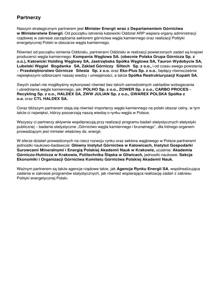 Partnerzy Naszym strategicznym partnerem jest Minister Energii wraz z Departamentem Górnictwa w Ministerstwie Energii. Od początku istnienia katowicki Oddział ARP wspiera organy administracji rządowej w zakresie zarządzania sektorem górnictwa węgla kamiennego oraz realizacji Polityki energetycznej Polski w obszarze węgla kamiennego. Również od początku istnienia Oddziału, partnerami Oddziału w realizacji powierzonych zadań są krajowi producenci węgla kamiennego: Kompania Węglowa SA. (obecnie Polska Grupa Górnicza Sp. z o.o.), Katowicki Holding Węglowy SA, Jastrzębska Spółka Węglowa SA, Tauron Wydobycie SA, Lubelski Węgiel „Bogdanka” SA, Zakład Górniczy „Siltech” Sp. z o.o., i od czasu swego powstania – Przedsiębiorstwo Górnicze „Silesia” Sp. z o.o. oraz Eko-Plus Sp. z o.o., będący równocześnie największymi odbiorcami naszej wiedzy i umiejętności, a także Spółka Restrukturyzacji Kopalń SA. Swych zadań nie moglibyśmy wykonywać również bez takich samodzielnych zakładów wzbogacania i uśredniania węgla kamiennego, jak: POLHO Sp. z o.o., ZOWER Sp. z o.o., CARBO PROCES Recykling Sp. z o.o., HALDEX SA, ZWW JULIAN Sp. z o.o., GWAREX POLSKA Spółka z o.o. oraz CTL HALDEX SA. Coraz bliższym partnerem stają się również importerzy węgla kamiennego na polski obszar celny, w tym także ci najwięksi, którzy poszerzają naszą wiedzę o rynku węgla w Polsce. Wszyscy ci partnerzy aktywnie współpracują przy realizacji programu badań statystycznych statystyki publicznej – badanie statystyczne „Górnictwo węgla kamiennego i brunatnego”, dla którego organem prowadzącym jest minister właściwy ds. energii. W sferze działań prowadzonych na rzecz rozwoju rynku oraz sektora węglowego w Polsce partnerami jednostki naukowo-badawcze: Główny Instytut Górnictwa w Katowicach, Instytut Gospodarki Surowcami Mineralnymi i Energią Polskiej Akademii Nauk w Krakowie, uczelnie: Akademia Górniczo-Hutnicza w Krakowie, Politechnika Śląska w Gliwicach, jednostki naukowe: Sekcja Ekonomiki i Organizacji Górnictwa Komitetu Górnictwa Polskiej Akademii Nauk. Ważnym partnerem są także agencje rządowe takie, jak Agencja Rynku Energii SA, współrealizująca zadania w zakresie programów statystycznych, jak również wspierająca realizację zadań z zakresu Polityki energetycznej Polski. Powered by TCPDF (www.tcpdf.org)