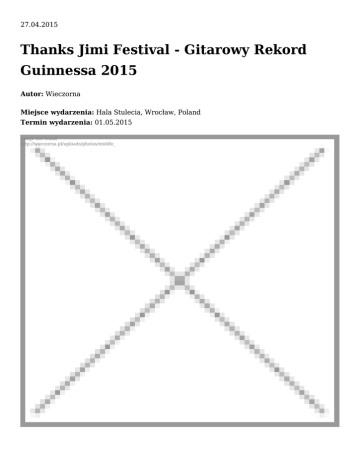 27.04.2015 Thanks Jimi Festival - Gitarowy Rekord Guinnessa 2015 Autor: Wieczorna Miejsce wydarzenia: Hala Stulecia, Wrocław, Poland Termin wydarzenia: 01.05.2015 Image not found http://wieczorna.pl/uploads/photos/middle_ Nazareth, Gipsy Kings, Emir Kusturica & The No Smoking Orchestra, Nigel Kennedy, IRA, Anita Lipnicka, Uli Jon Roth, Magda Piskorczyk, Jarek Śmietana, Grzegorz Skawiński, Leszek Cichoński, Wojciech Hoffmann, Malina Moye, Krzysztof Jaryczewski http://www.last.fm/festival/4044947+Thanks+Jimi+Festival++Gitarowy+Rekord+Guinnessa+2015