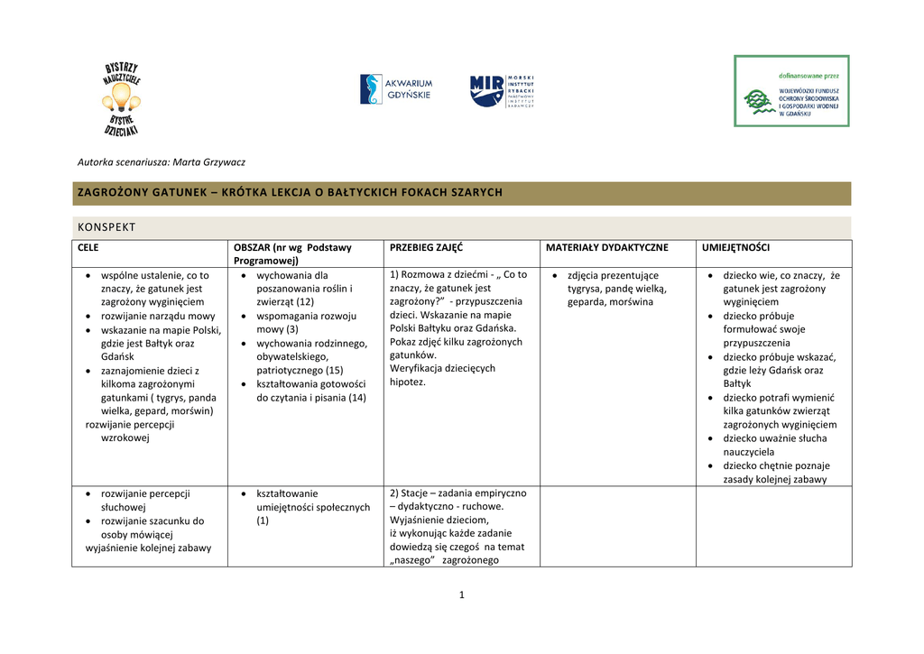 Autorka scenariusza: Marta Grzywacz ZAGROŻONY GATUNEK – KRÓTKA LEKCJA O BAŁTYCKICH FOKACH SZARYCH KONSPEKT CELE wspólne ustalenie, co to znaczy, że gatunek jest zagrożony wyginięciem rozwijanie narządu mowy wskazanie na mapie Polski, gdzie jest Bałtyk oraz Gdańsk zaznajomienie dzieci z kilkoma zagrożonymi gatunkami ( tygrys, panda wielka, gepard, morświn) rozwijanie percepcji wzrokowej rozwijanie percepcji słuchowej rozwijanie szacunku do osoby mówiącej wyjaśnienie kolejnej zabawy OBSZAR (nr wg Podstawy Programowej) wychowania dla poszanowania roślin i zwierząt (12) wspomagania rozwoju mowy (3) wychowania rodzinnego, obywatelskiego, patriotycznego (15) kształtowania gotowości do czytania i pisania (14) kształtowanie umiejętności społecznych (1) PRZEBIEG ZAJĘĆ 1) Rozmowa z dziećmi - „ Co to znaczy, że gatunek jest zagrożony?” - przypuszczenia dzieci. Wskazanie na mapie Polski Bałtyku oraz Gdańska. Pokaz zdjęć kilku zagrożonych gatunków. Weryfikacja dziecięcych hipotez. 2) Stacje – zadania empiryczno – dydaktyczno - ruchowe. Wyjaśnienie dzieciom, iż wykonując każde zadanie dowiedzą się czegoś na temat „naszego” zagrożonego 1 MATERIAŁY DYDAKTYCZNE zdjęcia prezentujące tygrysa, pandę wielką, geparda, morświna UMIEJĘTNOŚCI dziecko wie, co znaczy, że gatunek jest zagrożony wyginięciem dziecko próbuje formułować swoje przypuszczenia dziecko próbuje wskazać, gdzie leży Gdańsk oraz Bałtyk dziecko potrafi wymienić kilka gatunków zwierząt zagrożonych wyginięciem dziecko uważnie słucha nauczyciela dziecko chętnie poznaje zasady kolejnej zabawy rozwijanie odwagi do tego, by dotknąć czegoś co jest schowanego w pudełku – bez patrzenia na to rozwijanie zmysłu dotyku zaznajomienie dzieci z tym, jaka w dotyku jest skóra foki rozwijanie sprawności fizycznej dziecka rozwijanie cierpliwości utrwalenie zasady czekania na swoją kolejkę w zabawie ruchowej rozwijanie zmysłu dotyku zaznajomienie dzieci z tym, w jakim środowisku żyją foki rozwijanie percepcji słuchowej rozwijanie narządu mowy ustalenie, jakie w dotyku są foki odwołanie się do wcześniejszych doświadczeń dzieci poznawania siebie i swojego otoczenia (4) gatunku mieszkającego w Bałtyku/ dostaną część obrazka prezentującego „naszego zwierzaka”. Zadania: I) Poznanie za pomocą zmysłu dotyku „rodzaju skóry” jaki pokrywa fokę. kawałek miękkiego futerka dziecko chętnie poznaje świat za pomocą dotyku dziecko rozpoznaje za pomocą dotyku, jaka w dotyku jest skóra foki dziecko wykonuje skoki w worku dziecko czeka na swoją kolejkę, by nie powodować zagrożenia dla innych dzieci dziecko wie, w jakim środowisku żyją foki wychowania zdrowotnego, kształtowania sprawności fizycznej (5) wdrażania do dbałości o bezpieczeństwo swoje i innych dzieci (6) poznawania siebie i swojego otoczenia (4) II) Skoki w worku – pokonanie wyznaczonego dystansu – za próbę wykonanie zadania dziecko dostaje jedną część obrazka prezentującego fokę. worek, pachołki pierwszy element obrazka prezentującego fokę III) Poznanie za pomocą zmysłu dotyku środowiska w jakim żyje „nasz” zagrożony gatunek. miska z wodą miska z piaskiem i kamieniami wspomagania rozwoju mowy (3) poznawania siebie i swojego otoczenia (4) IV) Pytanie - „ Jaki w dotyku jest „nasz” zwierzak? Za poprawną odpowiedź/próbę odpowiedzi dziecko dostaje drugą część obrazka. drugi element obrazka prezentującego fokę 2 dziecko uważnie słucha nauczyciela dziecko odpowiada na pytanie nauczyciela dziecko wie, jakie w dotyku są foki – dziecko odpowiada na pytanie na podstawie swoich wcześniejszych doświadczeń dziecko uważnie organizuje pole spostrzeżeniowe dziecko wie, co to znaczy, że jakieś zwierzątko jest ssakiem dziecko nazywa kilka gatunków ssaków rozwijanie zmysłu dotyku rozwijanie percepcji wzrokowej wyjaśnienie dzieciom, co to znaczy, że jakiś zwierzak jest ssakiem nazwanie kilku gatunków ssaków rozwijanie percepcji słuchowej rozwijanie narządu mowy ustalenie, gdzie mogą mieszkać foki odwołanie się do wcześniejszych doświadczeń dzieci wychowania dla poszanowania roślin i zwierząt (12) wspomagania rozwoju mowy (3) V) Poznanie za pomocą zmysłu wzroku / dotyku pojęcia „ssak”. Rozmowa z dzieckiem – „Które zwierzęta to ssaki”? butelka ze smoczkiem mleko obrazek kota, psa, małego dziecka wspomagania rozwoju mowy (3) poznawania siebie i swojego otoczenia (4) VI) Pytanie - „ Gdzie może mieszkać „nasz” zwierzak?” Za poprawną odpowiedź/ próbę odpowiedzi dziecko dostaje trzecią część obrazka. trzeci element obrazka prezentującego fokę dziecko wie, gdzie mogą mieszkać foki – dziecko odpowiada na pytanie na podstawie swoich wcześniejszych doświadczeń rozwijanie motoryki małej rozwijanie koordynacji wzrokowo – ruchowej zaznajomienie dzieci z jednym z ulubionych smakołyków fok wychowania zdrowotnego, kształtowania sprawności fizycznej (5) kształtowania gotowości do czytania i pisania (14) VII) Łowienie rybek – zabawa ruchowa. Wyjaśnienie dzieciom, iż ryby są jednym z ulubionych smakołyków zjadanych przez „naszego” zwierzaka. piankowe rybki na tekturce mini wędka rozwijanie sprawności manualnej rozwijanie myślenia przestrzennego zabawy konstrukcyjnej (10) wychowania przez sztukę plastyczną (9) 3) Zadanie manipulacyjne – złożenie obrazka składającego się z czterech elementów. trzy części obrazka prezentującego fokę białe kartki A4 klej dziecko jest sprawne ruchowo dziecko próbuje łowić rybki dziecko chętnie uczestniczy w zabawie ruchowej dziecko wie, czym żywią się foki dziecko układa obrazek z trzech części dziecko próbuje posługiwać się klejem 3 rozwijanie percepcji wzrokowej nauka posługiwania się klejem nauka estetycznego wykonywania pracy plastycznej rozwijanie troski o swoje miejsce pracy rozwijanie percepcji słuchowej rozwijan