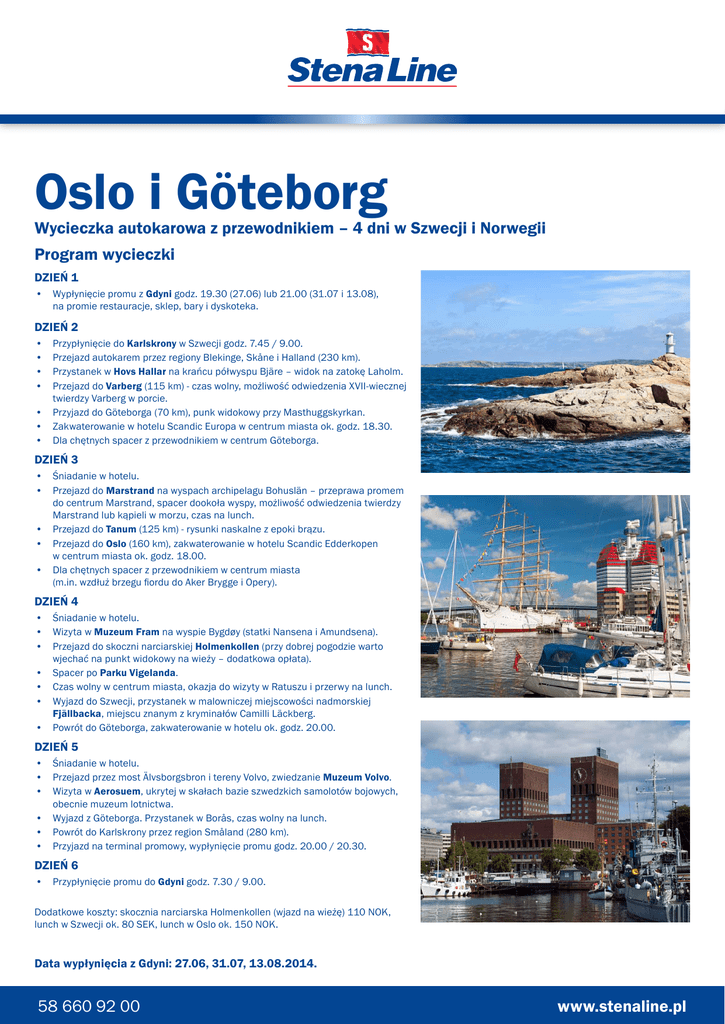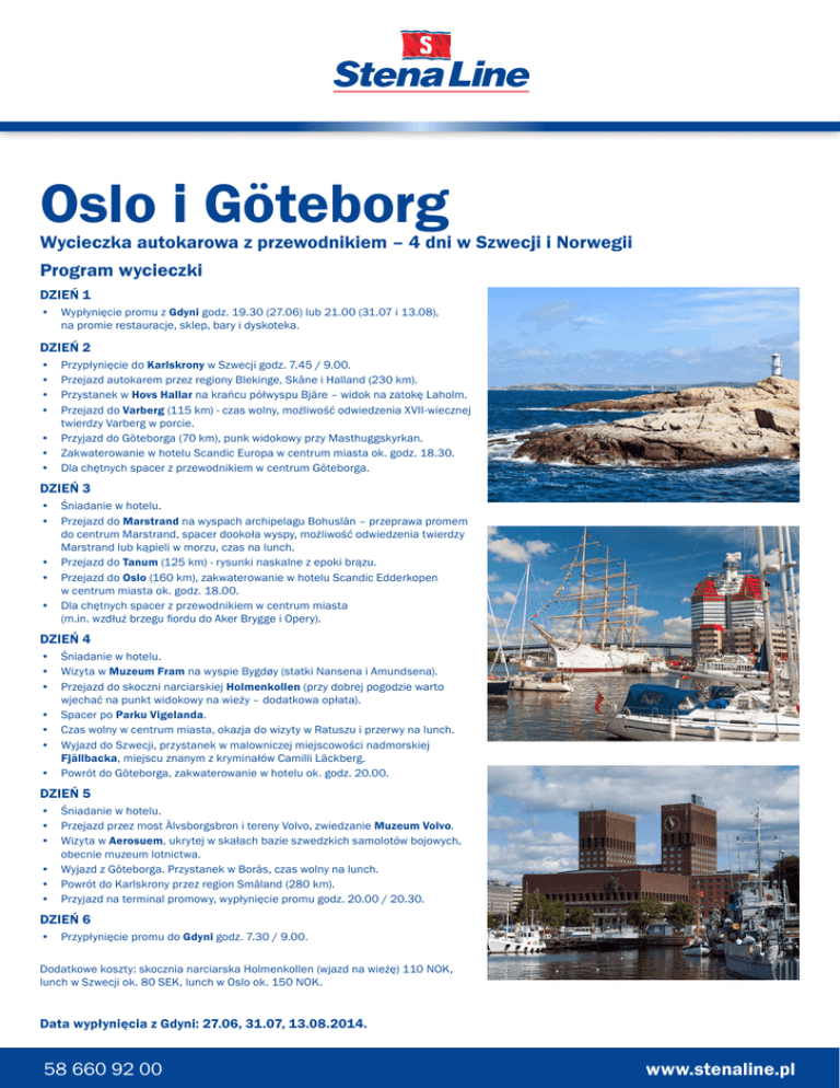 Oslo i Göteborg Wycieczka autokarowa z przewodnikiem – 4 dni w Szwecji i Norwegii Program wycieczki DZIEŃ 1 • Wypłynięcie promu z Gdyni godz. 19.30 (27.06) lub 21.00 (31.07 i 13.08), na promie restauracje, sklep, bary i dyskoteka. DZIEŃ 2 • • • • Przypłynięcie do Karlskrony w Szwecji godz. 7.45 / 9.00. Przejazd autokarem przez regiony Blekinge, Skåne i Halland (230 km). Przystanek w Hovs Hallar na krańcu półwyspu Bjäre – widok na zatokę Laholm. Przejazd do Varberg (115 km) - czas wolny, możliwość odwiedzenia XVII-wiecznej twierdzy Varberg w porcie. • Przyjazd do Göteborga (70 km), punk widokowy przy Masthuggskyrkan. • Zakwaterowanie w hotelu Scandic Europa w centrum miasta ok. godz. 18.30. • Dla chętnych spacer z przewodnikiem w centrum Göteborga. DZIEŃ 3 • Śniadanie w hotelu. • Przejazd do Marstrand na wyspach archipelagu Bohuslän – przeprawa promem do centrum Marstrand, spacer dookoła wyspy, możliwość odwiedzenia twierdzy Marstrand lub kąpieli w morzu, czas na lunch. • Przejazd do Tanum (125 km) - rysunki naskalne z epoki brązu. • Przejazd do Oslo (160 km), zakwaterowanie w hotelu Scandic Edderkopen w centrum miasta ok. godz. 18.00. • Dla chętnych spacer z przewodnikiem w centrum miasta (m.in. wzdłuż brzegu fiordu do Aker Brygge i Opery). DZIEŃ 4 • Śniadanie w hotelu. • Wizyta w Muzeum Fram na wyspie Bygdøy (statki Nansena i Amundsena). • Przejazd do skoczni narciarskiej Holmenkollen (przy dobrej pogodzie warto wjechać na punkt widokowy na wieży – dodatkowa opłata). • Spacer po Parku Vigelanda. • Czas wolny w centrum miasta, okazja do wizyty w Ratuszu i przerwy na lunch. • Wyjazd do Szwecji, przystanek w malowniczej miejscowości nadmorskiej Fjällbacka, miejscu znanym z kryminałów Camilli Läckberg. • Powrót do Göteborga, zakwaterowanie w hotelu ok. godz. 20.00. DZIEŃ 5 • Śniadanie w hotelu. • Przejazd przez most Älvsborgsbron i tereny Volvo, zwiedzanie Muzeum Volvo. • Wizyta w Aerosuem, ukrytej w skałach bazie szwedzkich samolotów bojowych, obecnie muzeum lotnictwa. • Wyjazd z Göteborga. Przystanek w Borås, czas wolny na lunch. • Powrót do Karlskrony przez region Småland (280 km). • Przyjazd na terminal promowy, wypłynięcie promu godz. 20.00 / 20.30. DZIEŃ 6 • Przypłynięcie promu do Gdyni godz. 7.30 / 9.00. Dodatkowe koszty: skocznia narciarska Holmenkollen (wjazd na wieżę) 110 NOK, lunch w Szwecji ok. 80 SEK, lunch w Oslo ok. 150 NOK. Data wypłynięcia z Gdyni: 27.06, 31.07, 13.08.2014. 58 660 92 00 •www.stenaline.pl