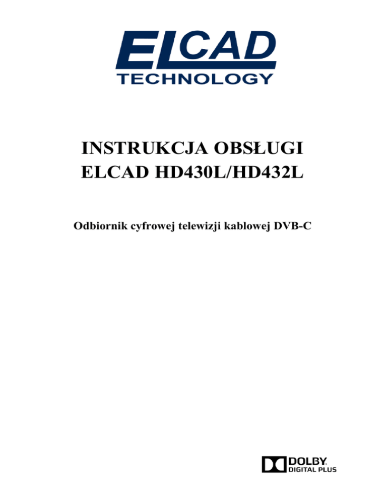 INSTRUKCJA OBSŁUGI ELCAD HD430L/HD432L Odbiornik cyfrowej telewizji kablowej DVB-C Dziękujemy za zakup odbiornika telewizji kablowej HD430L polskiej firmy Elcad Technology! Niniejsza instrukcja pozwala na zapoznanie się z uruchomieniem oraz podstawową obsługą urządzenia. Znajdują się w niej informacje o funkcjach wraz z opisem ich działania. Informacje o urządzeniu, dodatki oraz aktualizację oprogramowania można znaleźć pod adresem http://elcad.eu/. Aktualizacja oprogramowania daje dodatkowe funkcje, które mogły nie być dostępne w momencie zakupu, zachęcamy do regularnego odwiedzania strony poświęconej produktowi. strona 2 Spis treści 1. Odbiornik ................................................................................ 5 2. Pilot zdalnego sterowania ....................................................... 6 3. Podłączanie odbiornika ........................................................... 7 4. Pierwsze uruchomienie ........................................................... 8 5. Skanowanie listy kanałów ....................................................... 8 6. Struktura menu ....................................................................... 9 7. Obsługa ................................................................................. 10 7.1 Lista kanałów ...................................................................... 10 7.2 Edycja listy kanałów ............................................................ 11 7.3 Ustawienia LCN ................................................................... 12 8. Ustawienia ............................................................................ 12 8.1 Ustawienia obrazu .............................................................. 12 8.2 Ustawienia dźwięku ............................................................ 13 8.3 Aktualizacja oprogramowania ............................................ 13 8.4 Przywracanie ustawień fabrycznych ................................... 14 8.5 Sprzętowe przywrócenie ustawień fabrycznych................. 14 8.6 Blokada rodzicielska............................................................ 15 8.7 Blokada menu ..................................................................... 16 9. Zewnętrzna pamięć microSD (opcja) .................................... 16 10. Zewnętrzna pamięć USB ....................................................... 17 11. Opis funkcji............................................................................ 18 strona 3 11.1 EPG oraz programowanie nagrań ..................................... 18 11.2 Funkcja TIMESHIFT............................................................ 18 11.3 Funkcja PVR....................................................................... 18 12. Automatyczne przechodzenie w stan głębokiego uśpienia .. 19 13. Zawartość zestawu ................................................................ 19 14. Środki bezpieczeństwa .......................................................... 20 15. Deklaracja zgodności ............................................................. 21 16. Specyfikacja techniczna ........................................................ 21 strona 4 1. Odbiornik A. B. C. Złącze USB 2.0 (0,5A) Cyfrowy wyświetlacz Czujnik zdalnego sterowania D. E. F. G. H. I. Gniazdo CA Wejście anteny (Złącze typu IEC169-2 75 Ohm) Analogowe wyjście SCART Cyfrowe wyjście HDMI Slot na kartę pamięci microSD (opcja) Elektryczne wyjście S/PDIF oraz analogowe wyjście stereo (lewy/prawy kanał); umożliwia podłączenie: słuchawek z wtyczką mini jack lub wzmacniacza audio (stereo), za pomocą przejściówki 4 polowy minijack na 3 wtyki RCA (męskie): lewy-prawy kanał analogowy, S/PDIF, za pomocą przejściówki 4 polowy minijack na 3 wtyki RCA (żeńskie) oraz gniazdo 3 polowy minijack (żeńskie). J. Gniazdo zasilania (12V) strona 5 2. Pilot zdalnego sterowania FUNKCJE PRZYCISKÓW PILOTA Włącza/wyłącza odbiornik (tryb czuwania) MUTE Włącza/wyłącza dźwięk Wyświetla główną listę OK kanałów/zatwierdza ustawienia Anuluje wybór użytkownika; wychodzi EXIT z menu do trybu oglądania Reguluje głośność odbiornika; steruje ◄/► kursorem lewo/prawo Zmienia kanały; steruje kursorem ▼/▲ góra/dół <</>> Przewija nagranie w tył/ przód Wyświetla listę nagrań (jeśli jest PLAY podłączona zewnętrzna pamięć) Zatrzymuje odtwarzanie; aktywuje PAUSE funkcję Timeshift REC Aktywuje funkcję PVR STOP Zatrzymuje odtwarzane nagranie OPT Wybiera ścieżkę audio lub napisów TXT Uruchamia teletekst ZOOM Powiększa obraz JUMP Powoduje przeskok o kilka sekund SCREEN Zrzut ekranu do pamięci zewnętrznej MENU Wyświetla menu odbiornika INFO Pokazuje informacje o kanale Wyświetla elektroniczny przewodnik EPG po kanałach (EPG) Zwiększa/zmniejsza spowolnienie SLOW+/SLOWnagrania CZERWONY, Zapamiętuje ulubiony kanał po ZIELONY, ŻÓŁTY, dwukrotnym naciśnięciu klawisza NIEBIESKI FAV Wyświetla listę ulubionych kanałów a/A/1 Powraca do poprzedniego kanału TIM Uruchamia kalendarz Umożliwiają wybór kanału; Przyciski wprowadzanie wartości parametrów numeryczne w menu POWER strona 6 3. Podłączanie odbiornika W celu poprawnego działania odbiornika, zgodnie z poniższym rysunkiem, podłącz przewód z anteny (krok A) do gniazda „antena” w odbiorniku. Używając kabla HDMI lub SCART (krok B) podłącz odbiornik do telewizora. Następnie należy podłączyć przewód zasilający do gniazda zasilacza (krok C). W pilocie zdalnego sterowania należy umieścić baterie typu AAA znajdujące się w zestawie. W tym celu zdejmujemy dolną klapkę zabezpieczającą komorę i umieszczamy w niej baterie. Należy zwrócić uwagę na właściwe zamontowanie baterii według polaryzacji +/-. Włącz pilotami dekoder i odbiornik telewizyjny. Za pomocą pilota od odbiornika telewizyjnego wybierz odpowiednie źródło sygnału AV/HDMI/SCART. i Przycisk do wyboru zródła sygnału 