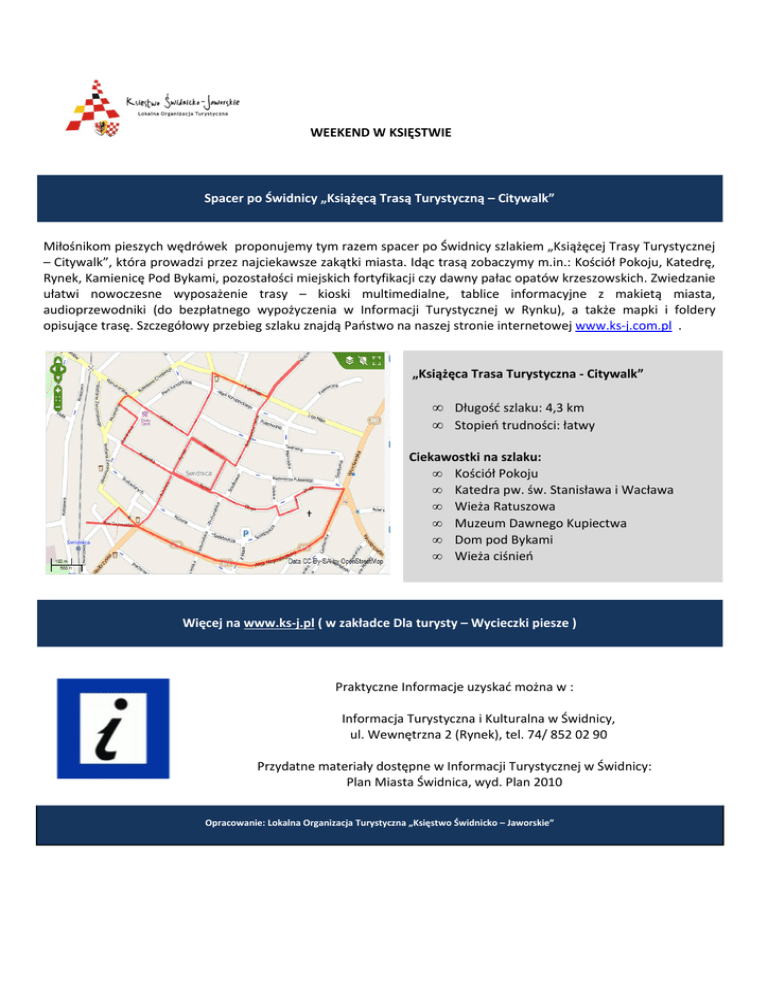 WEEKEND W KSIĘSTWIE Spacer po Świdnicy „Książęcą Trasą Turystyczną – Citywalk” Miłośnikom pieszych wędrówek proponujemy tym razem spacer po Świdnicy szlakiem „Książęcej Trasy Turystycznej – Citywalk”, która prowadzi przez najciekawsze zakątki miasta. Idąc trasą zobaczymy m.in.: Kościół Pokoju, Katedrę, Rynek, Kamienicę Pod Bykami, pozostałości miejskich fortyfikacji czy dawny pałac opatów krzeszowskich. Zwiedzanie ułatwi nowoczesne wyposażenie trasy – kioski multimedialne, tablice informacyjne z makietą miasta, audioprzewodniki (do bezpłatnego wypożyczenia w Informacji Turystycznej w Rynku), a także mapki i foldery opisujące trasę. Szczegółowy przebieg szlaku znajdą Państwo na naszej stronie internetowej www.ks-j.com.pl . „Książęca Trasa Turystyczna - Citywalk” • Długość szlaku: 4,3 km • Stopień trudności: łatwy Ciekawostki na szlaku: • Kościół Pokoju • Katedra pw. św. Stanisława i Wacława • Wieża Ratuszowa • Muzeum Dawnego Kupiectwa • Dom pod Bykami • Wieża ciśnień Więcej na www.ks-j.pl ( w zakładce Dla turysty – Wycieczki piesze ) Praktyczne Informacje uzyskać można w : Informacja Turystyczna i Kulturalna w Świdnicy, ul. Wewnętrzna 2 (Rynek), tel. 74/ 852 02 90 Przydatne materiały dostępne w Informacji Turystycznej w Świdnicy: Plan Miasta Świdnica, wyd. Plan 2010 Opracowanie: Lokalna Organizacja Turystyczna „Księstwo Świdnicko – Jaworskie” WEEKEND W KSIĘSTWIE Twierdza Kłodzka Tym razem proponujemy Państwu wycieczkę do Kłodzka i zwiedzanie górującej nad miastem twierdzy. Swój obecny kształt twierdza zawdzięcza pracom prowadzonym w II połowie XVIII wieku, w wyniku których powstał donżon – centralne dzieło obronne twierdzy – otoczony łańcuchem bastionów, redut, kleszczy i fos wewnętrznych. W donżonie zbudowano trzypoziomowe kazamaty i magazyny o głębokości dochodzącej do 20 metrów, a w kazamatach - zbrojownię, aptekę, laboratorium i pomieszczenia dla załogi. Dodatkowo twierdzę otoczyły suche fosy o głębokości dochodzącej do 10 metrów. Swój obronny charakter twierdza straciła w II połowie XIX w. przekształcając się w magazyny i więzienie. W jej lochach osadzano polskich uczestników Powstania Styczniowego, więźniów politycznych, a w trakcie II wojny światowej żołnierzy podejrzanych o działanie na szkodę III Rzeszy oraz jeńców wojennych różnej narodowości. Działały tu także, przeniesione w 1944 r. z Łodzi wraz z polską załogą, zakłady AEG, produkujące aparaty radiowe do łodzi podwodnych oraz części do rakiet V1 i V2. Po wojnie na terenie twierdzy mieściły się składy i magazyny wojskowe, a od lat 50. do 90. XX w. m.in. wytwórnia win. W chwili obecnej udostępniona jest duża część twierdzy. Niezapomnianych wrażeń dostarcza wędrówka podziemnym labiryntem korytarzy minerskich, a widok z bastionu widokowego na miasto i okolice zachwyci każdego. Dodatkową atrakcję stanowi fort Wielki Kleszcz, którego wyremontowane pomieszczenia - sypialnia, kantyna, kasyno, lazaret, kazamata dowódcy, kazamata strzelecka - pełnią dziś funkcje muzealne, prezentując odwiedzającym różne aspekty codziennego życia pruskich żołnierzy, stacjonujących przed laty na twierdzy. Szczegóły znajdą państwo na stronie www.twierdza.klodzko.pl . Twierdza Kłodzko Ul. Grodzisko 1 57-300 Kłodzko Godziny otwarcia: Pn – pt : 9:00 – 18:00 Sb – Nd : 9:00 – 18:00 bilety: 18/14 zł lub 12/10 zł tel. 74/ 867-34-68 www.twierdza.klodzko.pl Więcej na www.twierdza.klodzko.pl Praktyczne Informacje uzyskać można w : Informacja Turystyczna i Kulturalna w Świdnicy, ul. Wewnętrzna 2 (Rynek), tel. 74/ 852 02 90 Przydatne materiały dostępne w Informacji Turystycznej w Świdnicy: Mapa Ziemia Kłodzka , wyd. PLAN 2012r Opracowanie: Lokalna Organizacja Turystyczna „Księstwo Świdnicko – Jaworskie”