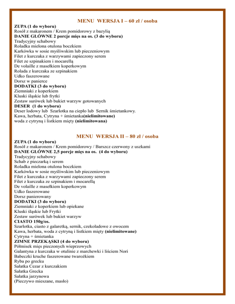 MENU WERSJA I – 60 zł / osoba ZUPA (1 do wyboru) Rosół z makaronem / Krem pomidorowy z bazylią DANIE GŁÓWNE 2 porcje mięs na os. (3 do wyboru) Tradycyjny schabowy Roladka mielona otulona boczkiem Karkówka w sosie myśliwskim lub pieczeniowym Filet z kurczaka z warzywami zapieczony serem Filet ze szpinakiem i mocarellą De volaille z masełkiem koperkowym Rolada z kurczaka ze szpinakiem Udko faszerowane Dorsz w panierce DODATKI (3 do wyboru) Ziemniaki z koperkiem Kluski śląskie lub frytki Zestaw surówek lub bukiet warzyw gotowanych DESER (1 do wyboru) Deser lodowy lub Szarlotka na ciepło lub Sernik śmietankowy. Kawa, herbata, Cytryna + śmietanka(nielimitowane) woda z cytryną i listkiem mięty (nielimitowana) MENU WERSJA II – 80 zł / osoba ZUPA (1 do wyboru) Rosół z makaronem / Krem pomidorowy / Barszcz czerwony z uszkami DANIE GŁÓWNE 2,5 porcje mięs na os. (4 do wyboru) Tradycyjny schabowy Schab z pieczarką i serem Roladka mielona otulona boczkiem Karkówka w sosie myśliwskim lub pieczeniowym Filet z kurczaka z warzywami zapieczony serem Filet z kurczaka ze szpinakiem i mocarellą De volaille z masełkiem koperkowym Udko faszerowane Dorsz panierowany DODATKI (3 do wyboru) Ziemniaki z koperkiem lub opiekane Kluski śląskie lub Frytki Zestaw surówek lub bukiet warzyw CIASTO 150g/os. Szarlotka, ciasto z galaretką, sernik, czekoladowe z owocem Kawa, herbata, woda z cytryną i listkiem mięty (nielimitowane) Cytryna + śmietanka ZIMNE PRZEKĄSKI (4 do wyboru) Półmisek mięs pieczonych wieprzowych Galantyna z kurczaka w otulinie z marchewki i liściem Nori Babeczki kruche faszerowane twarożkiem Ryba po grecku Sałatka Cezar z kurczakiem Sałatka Grecka Sałatka jarzynowa (Pieczywo mieszane, masło) MENU WERSJA III – 100 zł / osoba ZUPA (1 do wyboru) Rosół z makaronem / Krem pomidorowy / Krem pieczarkowy / Krem cebulowo-porowy DANIE GŁÓWNE 3 porcje mięs na os. (5 do wyboru) Tradycyjny schabowy Schab z pieczarką i serem Roladki mielone otulone boczkiem Karkówka w sosie myśliwskim lub pieczeniowym Rolada z karkówki ze śliwką i kurczakiem Filet z kurczaka z warzywami zapieczony serem Filet z kurczaka ze szpinakiem i mocarellą Kotlet De volaille z masełkiem koperkowym Łódeczki drobiowe z warzywami Udko faszerowane Steki z udek z warzywami z grilla Dorsz w panierce DODATKI (4 do wyboru) Ziemniaki z koperkiem lub opiekane Kluski śląskie lub frytki Zestaw surówek lub bukiet warzyw Mix sałat z vinegretem i słonecznikiem CIASTO 200g/os. Szarlotka, sernik, ciasto z galaretką, W-Z , czekoladowe, OWOCE SEZONOWE 200g/os. Kawa, herbata, woda z cytryną i listkiem mięty (nielimitowane) Sok pomarańczowy i jabłkowy 0,5l/os. Cytryna + śmietanka ZIMNE PRZEKĄSKI (6 do wyboru) Półmisek mięs pieczonych wieprzowych Galantyna z kurczaka w otulinie z marchewki i liściem Nori Babeczki kruche faszerowane twarożkiem, pesto bazylikowym, Pasztet z żurawiną Duet śledziowy Ryba po grecku Sałatka Grecka Sałatka Gyros Sałatka jarzynowa (Pieczywo mieszane, masło) DRUGIE DANIE CIEPŁE (1 do wyboru) Flaczki z pieczywem / Żurek z jajkiem / Barszcz czerwony z uszkami lub z pasztecikiem MENU WERSJA IV – 130 zł / osoba ZUPA (1 do wyboru) Rosół z makaronem / Krem pomidorowy / Krem pieczarkowy / Krem cebulowo-porowy Krem z białych warzyw z prażonymi migdałami DANIE GŁÓWNE – 3,5 porcje mięs na os. (6 do wyboru) Tradycyjny schabowy Zwijaniec schabowy z kapustą i grzybami Roladki mielone otulone boczkiem Karkówka w sosie myśliwskim lub pieczeniowym Rolada z karkówki ze śliwką Filet z kurczaka z warzywami zapieczony serem Kotlet De volaille z masełkiem koperkowym Rolada z kurczaka ze szpinakiem i mocarellą Łódeczki drobiowe z warzywami Udko z kaczki pieczone w sosie winnym Steki z udek z warzywami Dorsz w panierce Łosoś w ziołach DODATKI (5 do wyboru) Ziemniaki z koperkiem lub opiekane Kluski śląskie lub frytki Zestaw surówek lub bukiet warzyw Mix sałat z vinegretem i słonecznikiem CIASTO 250g/os. Szarlotka, sernik, ciasto z galaretką, W-Z, czekoladowe, toffi, OWOCE SEZONOWE 250g/os. Kawa, herbata, woda z cytryną i listkiem mięty (nielimitowane) Cytryna + śmietanka Sok pomarańczowy i jabłkowy 0,5l/os. ZIMNE PRZEKĄSKI (7 do wyboru) Półmisek mięs pieczonych wieprzowych Galantyna z kurczaka w otulinie z marchewki i liściem Nori Tatar wołowy z ogórkiem i cebulką Pasztet z żurawiną Rolada z łososia wędzonego z serkiem Babeczki kruche faszerowane twarożkiem, pesto bazylikowym, Duet śledziowy Ryba po grecku Sałatka Grecka Sałatka z szynka parmeńska i serem pleśniowym Sałatka jarzynowa (Pieczywo mieszane, masło) DRUGIE DANIE CIEPŁE Flaczki z pieczywem / Żurek z jajkiem / Barszcz czerwony z uszkami lub z pasztecikiem (1 do wyboru) Golonka pieczona i Szaszłyki drobiowe 1 por. /osoba - 50/50 Kapusta zasmażana lub Bigos