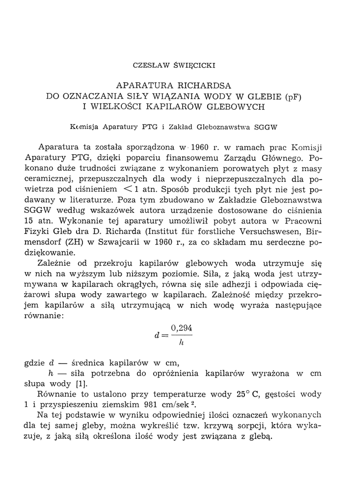 CZESŁAW ŚW IĘCICKI APARATURA RICHARDSA DO OZNACZANIA SIŁY W IĄZANIA WODY W GLEBIE (pF) I W IELKOŚCI KAPILARÓW GLEBOWYCH K om isja A paratury PTG i Z akład G leb ozn aw stw a SGGW A p aratu ra ta została sporządzona w 1960 r. w ram ach prac Komisji A p aratu ry PTG, dzięki poparciu finansow em u Zarządu Głównego. Po konano duże trudności zw iązane z w ykonaniem porow atych płyt z m asy ceram icznej, przepuszczalnych dla w ody i nieprzepuszczalnych dla po w ietrza pod ciśnieniem < 1 atn. Sposób produkcji tych płyt nie jest po daw any w literaturze. Poza tym zbudowano w Zakładzie G leboznaw stw a SGGW w edług w skazówek autora urządzenie dostosow ane do ciśnienia 15 atn. W ykonanie tej a p a ra tu ry um ożliw ił pobyt autora w Pracow ni Fizyki Gleb dra D. R icharda (Institut fü r forstliche V ersuchsw esen, B irm ensdorf (ZH) w Szw ajcarii w I960 r., za co składam m u serdeczne po dziękow anie. Zależnie od przekroju kapilarów glebow ych w oda u trzym uje się w nich na w yższym lub niższym poziomie. Siła, z jaką w oda jest u trz y m yw ana w kapilarach okrągłych, rów na się sile adhezji i odpowiada cię żarow i słupa w ody zaw artego w kapilarach. Zależność m iędzy przekro jem kapilarów a siłą utrzym ującą w nich wodę w yraża następujące rów nanie : 0,294 d = ------h gdzie d — średnica kapilarów w cm, h — siła potrzebna do opróżnienia kapilarów w yrażona w cm słupa wody [1 ]. R ów nanie to ustalono przy tem peraturze wody 25° C, gęstości wody 1 i przyspieszeniu ziem skim 981 c m /se k 2. Na tej podstaw ie w w yniku odpowiedniej ilości oznaczeń w ykonanych dla tej samej gleby, m ożna w ykreślić tzw. krzyw ą sorpcji, która w yka zuje, z jaką siłą określona ilość w ody jest zw iązana z glebą. Aparatura Richardsa do oznaczania siły wiązania wody w glebie 625 N ajbardziej interesuje nas zawartość wody w glebie, odpow iadająca tzw. pojem ności polowej oraz trw ałem u punktow i w iędnięcia roślin. Na podstaw ie krzyw ej sorpcji w ody obliczam y procentow ą zaw artość różnej wielkości porów w glebie. W yróżniam y pory drobne o średnicy < 0.2 j.i, w których woda zw iązana siłami, w ynoszącym i ponad 15 atn, nie jest dostępna dla roślin, pory średnie o 0 0,2— 8 u, w których w oda jest zw iązana siłam i rów nym i 0,345 do 15 atn i jest dostępna dla roślin oraz pory grube o 0 > 8 \i, w których w oda zw iązana jest siłam i m niej szymi od 0,345 atn. Pory te w glebach o tzw. norm alnym „drenażu n a tu ra ln y m ” [1] są w ypełnione pow ietrzem . Oznaczanie wody związanej (przy sile ssącej < 1 atn) w ykonujem y w celu oznaczenia w glebie zapasu w ody łatw o dostępnej dla roślin oraz tzw. polowej pojem ności wodnej. Porow ata p ły ta z m asy ceram icznej posiada pory o wielkości < 1 u i w zw iązku z tym woda w przestw orach tej pły ty jest utrzym yw ana z siłą Rys. 1. S ch em at działan ia p orow atej p ły ty R ichardsa. od w ad n ian e pod ciśn ien iem 1,1 atn N ajw ięk sze pory są m niejszą od 1 atn. Obudow a p ły ty jest bardzo prosta i każdy zakład naukow y we w łasnym zakresie może ją w ykonać (najlepiej nadają się do tego celu odpow iednich rozm iarów herm entyczne garnki do gotow ania pod zwiększonym ciśnieniem). Działanie porow atej p ły ty jest przedsta wione na rys. 1, a obudowa p ły ty na rys. 2. P ły tę um ieszczam y w zam kniętej przestrzeni. Na płycie ustaw iam y pierścień o wysokości 2,5 cm 0 5 c m 1, zaw ierający próbkę gleby o stru k tu rze nienaruszonej. Pierścień pow inien dobrze przylegać do płyty, nad k tórą w ytw arzam y w kam erze ciśnienie m niejsze od 1 atn. Przez pory p ły ty woda jest w ypychana na zew nątrz. Równocześnie w porach p ły ty pow staje pew ne ssanie, które pow oduje w yciąganie wody z kapilarów glebowych. W zależności od w iel kości ssania, które jest rów ne w ytw orzonem u ciśnieniu, woda z określo nej grubości kapilarów glebow ych zostaje usunięta. Czas odw adniania trw a 10— 20 godz, zależnie od składu m echanicznego gleby [1]. 1 24 godziny przed um ieszczen iem gleb ę w odą destylow an ą. p ły ty z próbkam i w kam erze n asycam y 626 С. Święcicki Ciśnienie do 0,35 atn regulujem y za pomocą kolum ny wodnej, pow y żej — za pom ocą m anom etru sprężynowego. P raktycznie oznaczam y pojem ności wodne przy 0,020, 0,040, 0,080, 0,160, 0,345, 0,690 atn. Ja k w ykazały doświadczenia, każde oznaczenie Rys. 2. S chem at oznaczania w od y w gleb ie zw iązanej siłam i 0— 1 atn porow atą p łytą R ichardsa 1 — m anom etr głów n y, 2 — reduktor ciśnien ia, 3 — u szczelka, 4 — pierścień, 5 — próbka gleby, 6 — dren, 7 — porow ata płyta ceram iczna. 3 — od p ływ w od y. 9 — m anom etr w od n y, 10 — butla z p ow ietrzem , 11 — regulator, 12 — m em brana gum ow a trw a 18 godzin dla gleb lekkich i średnich i do 30 godz dla gleb ciężkich [1]. Po tym okresie czasu próbki w yjm ujem y z aparatu i pobieram y część każdej z nich do naczyńka wagowego, suszym y do 105° С i oznaczamy zaw artość wody. Pozostałe na płycie próbki um ieszczam y ponownie w aparacie dla oznaczania wilgotności przy innym ciśnieniu. Ilość wody w próbce oznaczamy w procentach wagow ych i objętościowych. O z n a c z a n i e s i l n i e z w i ą z a n e j w o d y (przy sile ssącej 1,5 atn) w ykonujem y w celu oznaczenia tzw. trw ałego punktu więdnięcia roślin. Do tego celu służy tzw. a p aratu ra m em branow a Richardsa. Oznaczenia silnie związanej wody w glebie słaboszkieletowej dokonu jem y w próbkach o n atu raln ej strukturze, natom iast w glebach szkiele tow ych próbki przesiew am y przez sito o 0 oczek 1 mm. Każdą z próbek um ieszczam y w pierścieniach o wysokości 1 cm i 0 5 cm. A p aratu ra m em branow a składa się z dwóch zasadniczych części — podstaw y i przykryw y, których w ytrzym ałość jest obliczo