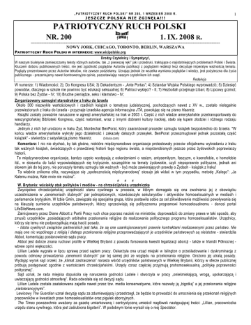 „PATRIOTYCZNY RUCH POLSKI” NR 200, 1 WRZESIEŃ 2008 R. JESZCZE POLSKA NIE ZGINĘŁA!!! 1 PATRIOTYCZNY RUCH POLSKI NR. 200 1. IX. 2008 R. ----------------------------------------------------------------------------------------------------------------------------------------------------------------- NOWY JORK, CHICAGO, TORONTO, BERLIN, WARSZAWA PATRIOTYCZNY RUCH POLSKI W INTERNECIE: www.wicipolskie.org Drodzy Czytelnicy i Sympatycy!, W naszym biuletynie zamieszczamy teksty różnych autorów, tak „z pierwszej ręki” jak i przedruki, traktujące o najistotniejszych problemach Polski i Świata. Kluczem doboru publikowanych treści, nie jest zgodność poglądów Autorów publikacji z poglądami redakcji lecz decyduje imperatyw ważnością tematu. Poglądy prezentowane przez Autorów tekstów, nie zawsze podzielamy. Uznając jednak że wszelka wymiana poglądów i wiedzy, jest pożyteczna dla życia publicznego - prezentujemy nawet kontrowersyjne opinie, pozostawiając naszym czytelnikom ich osąd. Redakcja W numerze: 1) Wiadomości; 2); Do Kongresu USA; 3) Dekadentyzm - „Ante Portas”; 4) Sztandar Wojska Polskiego wyprowadzić; 5) Dziesięć powodów, dlaczego w szkole nie powinno być edukacji seksualnej; 6) Patrioci wyklęci? - II; 7) Hezbollah przejmuje Liban; 8) Lipcowy grzmot; 9) Polska bez Żydów - IV; 10) Brudne pieniądze, seks i kłamstwo - IV; Zorganizowany szmugiel starodruków z Iraku do Izraela Około 300 niezwykle wartościowych i rzadkich książek o tematyce judaistycznej, pochodzących nawet z XV w., zostało nielegalnie przewiezionych z Iraku do Izraela - przyznaje izraelska agencja informacyjna JTA, powołując się na pismo Haaretz. Książki zostały poważnie naruszone w agresji amerykańskiej na Irak w 2003 r. Część z nich władze amerykańskie przetransportowały do waszyngtońskiej Biblioteki Kongresu, część natomiast, wraz z innymi dobrami kultury irackiej, stało się łupem złodziei i różnego rodzaju handlarzy. Jednym z nich był urodzony w Iraku Żyd, Mordechai BenPorat, który zaaranżował proceder szmuglu książek bezpośrednio do Izraela. "W końcu władze amerykańskie wykryły jego działalność i zakazały dalszych przesyłek. BenPorat przeszmuglował jednak pozostałą część (bibula.com) książek" - stwierdza z satysfakcją pismo Haaretz. Komentarz: I nic nie słychać, by tak głośne, niektóre międzynarodowe organizacje protestowały przeciw oficjalnemu wykradaniu z Iraku tak ważnych książek, świadczących o prawdziwej historii tego regionu świata, a nieprzerobionych jeszcze przez żydowskich poprawiaczy historii. Te międzynarodowe organizacje, bardzo często występują z oskarżeniami o rasizm, antysemityzm, faszyzm, o ksenofobie, o homofobie itd., w stosunku do ludzi wypowiadających się krytycznie, szczególnie na tematy żydowskie, czyli niepoprawnie polityczne, jednak ani słowem jak do tej pory, nie poruszyły tematu szmuglu tak ważnych - być może zawierających prawdę o Żydach - książek z Iraku! Ta właśnie znikoma elita, nazywająca się „społecznością międzynarodową” stosuje jak widać w tym przypadku, metodę „Kalego”: „Ja Kalemu można, Kale mnie nie można”. --- -- --- -- -- --- -- -- --- -- -- --- -- -- --- -- -- -- --- -- -- --- -- -- --- -- -- --- -- -- --- -- -- --- -- --- -- --- -- -- --- -- -- --- -- -- --- -- -- --- -- -- -- --- -- -- --- -- -- --- -- -- --- -- -- --- -- -- --- -- --- -- --- -- -- --- -- -- --- -- -- --- -- -- --- -- -- -- --- -- -- --- -- -- --- -- -- --- -- -- --- -- -- --- -- --- -- --- -- -- --- -- -- --- -- -- --- -- -- --- -- -- -- --- -- -- --- -- -- --- -- -- --- -- -- --- -- -- --- -- --- -- --- -- -- --- -- -- --- -- -- --- -- -- --- -- -- -- --- -- -- --- -- -- --- -- -- --- -- -- --- -- -- --- -- --- -- --- -- -- --- -- -- --- -- -- --- -- -- --- -- -- -- --- -- -- --- -- -- --- -- -- --- -- -- --- -- -- --- -- --- -- --- -- -- --- -- -- --- -- -- --- -- -- --- -- -- -- --- -- -- --- -- -- --- -- -- --- -- -- --- -- -- --- -- --- -- --- -- -- --- -- -- --- -- -- --- -- -- --- -- -- -- --- -- -- --- -- -- --- -- -- --- -- -- --- -- -- --- -- --- -- --- -- -- --- -- -- --- -- -- --- -- -- --- -- -- -- --- -- -- # # # W. Brytania: wściekły atak polityków i mediów - na chrześcijańską urzędniczkę Zwycięstwo chrześcijańskiej urzędniczki stanu cywilnego w procesie, w którym domagała się ona zwolnienia jej z obowiązku uczestniczenia w „ceremoniach ślubnych” par jednopłciowych, rozwścieczyło sekularystów i aktywistów homoseksualnych w mediach i parlamencie brytyjskim. W Izbie Gmin, zawiązała się specjalna grupa, która postawiła sobie za cel zlikwidowanie możliwości powoływania się na klauzulę sumienia urzędników państwowych, którzy sprzeciwiają się politycznemu programowi homoseksualnemu - donosi portal LifeSiteNews.com. Zainicjowany przez Diane Abbott z Partii Pracy ruch chce poprzez naciski na ministrów, doprowadzić do zmiany prawa w taki sposób, aby zmusić urzędników „posiadających arbitralne przekonania religijne do realizowania politycznego programu homoseksualistów. Urzędnicy, którzy się temu nie podporządkują mają tracić posady. - Istota cywilnych związków partnerskich jest taka, że są one usankcjonowanymi prawnie kontraktami realizowanymi przez państwo. Nie mają one nic wspólnego z religią i dlatego przekonania religijne przeprowadzających je urzędników państwowych są nieistotne - stwierdziła Abbot, komentując postanowienie sądu pracy. Abbot jest dobrze znana ruchowi prolife w Wielkiej Brytanii z powodu forsowania kwestii legalizacji aborcji - także w Irlandii Północnej wbrew opinii większości. Lillian Ladele wygrała w lipcu sprawę przed sądem pracy. Oskarżyła ona urząd miejski w Islington o prześladowanie i dyskryminację z powodu odmowy prowadzenia „ceremonii ślubnych” par tej samej płci ze względu na przekonania religijne. Grożono jej utratą posad