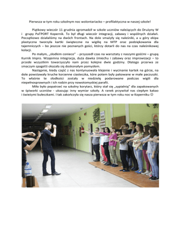 Pierwsza w tym roku szkolnym noc wolontariacko – profilaktyczna w naszej szkole! Piątkowy wieczór 11 grudnia zgromadził w szkole uczniów należących do Drużyny W i grupy PaTPORT Kopernik. To był długi wieczór integracji, zabawy i wspólnych działań. Początkowo działaliśmy na dwóch frontach. Na dole smażyły się naleśniki, a u góry ekipa plastyczna tworzyła kartki świąteczne na wigilię na MTP oraz podziękowania dla tajemniczych – bo jeszcze nie poznanych gości, którzy dotarli do nas na czas naleśnikowej kolacji. Po małym, „słodkim conieco” - przyszedł czas na warsztaty z naszymi gośćmi – grupą Kurnik Impro. Wzajemna integracja, duża dawka śmiechu i zabawy oraz improwizacji – to przede wszystkim towarzyszyło nam przez kolejne dwie godziny. Dlatego przerwa ze smaczym spagetti okazała się doskonałym pomysłem. Następnie, kiedy część z nas kontynuowała klejenie i wycinanie kartek na górze, na dole powstawały kruche korzenne ciasteczka, kóre potem były pakowane w małe paczuszki. To właśnie te słodkości zostały w niedzielę podarowane podczas wigili dla niepełnosprawnych i ich rodzin przy nowotomyskiej parafii. Miło było popatrzeć na szkolny korytarz, który stał się „sypialnią” dla zapakowanych w śpiworki uczniów - ukazując inny wymiar szkoły. A ranek przywitał nas ciepłym kakao i świeżymi bułeczkami. I tak zakończyła się nasza pierwsza w tym roku noc w Koperniku
