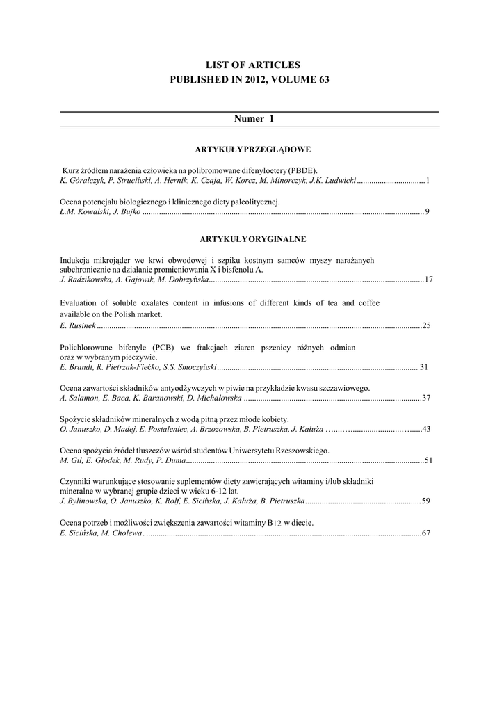 LIST OF ARTICLES PUBLISHED IN 2012, VOLUME 63 Numer 1