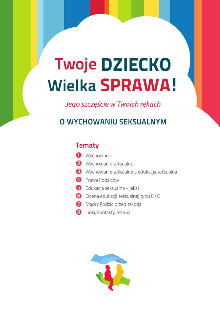 Twoje DZIECKO Wielka SPRAWA! Jego szczęście w Twoich rękach O WYCHOWANIU SEKSUALNYM Tematy ì í î ï ð ñ ò ß Wychowanie Wychowanie seksualne Wychowanie seksualne a edukacja seksualna Prawa Rodziców Edukacja seksualna – jaka? Ocena edukacji seksualnej typu B i C Mądry Rodzic przed szkodą Linki, kontakty, lektura Drodzy Rodzice, U początku małżeńskiego życia zaprosiliście Pana Jezusa, aby wszedł w Wasze wspólne życie poprzez sakrament małżeństwa i przemieniał Wasze serca. Dzięki Jego łasce Wasza miłość wzajemna może pogłębiać się, możecie kochać coraz mocniej i piękniej, tak jak Chrystus kocha, czyli miłością wielką, wspaniałą, ale też miłością ofiarną po oddanie życia, bezwarunkową i przebaczającą. Miłością, która daje życie. Owocem miłości małżonków są dzieci, zrodzone z miłości, powołane do miłości, ale też potrzebujące miłości, aby rozwijać się i wzrastać. Dzieci potrzebują miłości rodziców jak wody i pokarmu. Nikt ani nic nie może w pełni zastąpić rodziców w tej misji. Szkoła, Wspólnota Kościoła, inne organizacje mogą jedynie pomagać, wspierać, umacniać rodziców, nigdy ich zastąpić. Miłość rodziców nie może być nierozumna. Odpowiedzialność rodziców wobec Pana Boga i dzieci wymaga mądrej, roztropnej miłości, która gwarantuje, że wychowanie staje się coraz bardziej odpowiedzialne. To znaczy staje się autentyczną troską o dobro dzieci, o ich rozwój. Dlatego potrzeba ducha mądrości, aby rozeznawać, co jest dobre dla dzieci, a co nie jest; co można dzieciom zaproponować, a co trzeba odrzucić; które propozycje płynące z różnych stron służą pięknemu rozwojowi dzieci, a które go ograniczają czy kierują w niewłaściwą stronę. Stąd nasza akcja i nasza książeczka, aby pomóc Wam, Drodzy Rodzice. Aby przypomnieć Wasze piękne i ważne powołanie i płynącą z niego odpowiedzialność, ale także pomóc w roztropnym rozpoznawaniu tego, co proponują Wam i Waszym dzieciom różne instytucje i organizacje, aby mądrze decydować. Proszę, abyście nie rezygnowali z tego rozpoznawania oraz decydowania i nie przekazywali go w inne ręce. Ufamy, że skoro Dobry Bóg uczynił Was swoimi współpracownikami w przekazywaniu życia, nie zostawi Was w towarzyszeniu dzieciom w ich dojrzewaniu. Niech Dobry Bóg błogosławi Wam w tej misji. bp Damian Bryl 2 Twoje Dziecko – Wielka Sprawa! Jego szczęście w Twoich rękach Na początek Mamo! Tato! Czy wiesz, że… …jesteś pierwszym i niezastąpionym wychowawcą! …masz prawa i obowiązki! …rodzina jest najbardziej odpowiednim środowiskiem wychowawczym, w tym również wychowania seksualnego! Czy tego chcesz, czy nie chcesz – masz ogromny wpływ na życie swojego dziecka. Pragniesz szczęścia dla swojego dziecka? Przeczytaj, przemyśl, przekaż dalej… 3 Mamo! Tato! Pamiętasz? …jesteś pierwszym i niezastąpionym wychowawcą! ì WYCHOWANIE Co to jest wychowanie? Wychowanie jest ukierunkowanym procesem, który dokonuje się w relacji między osobami: wychowawcą i wychowankiem (np.: rodzic – dziecko, nauczyciel – uczeń). Każde dobre wychowanie wymaga określenia celu wychowania oraz systemu wartości 1. System wartości uzdalnia człowieka do podejmowania odpowiedzialnych decyzji w ważnych sprawach życiowych. WYCHOWANIE = CEL + WARTOŚCI do czego ma prowadzić? DO MIŁOSCI! … męstwo odwaga radość czystość umiarkowanie wytrwałość szczerość przyjaźń … Wartości przekazują młodemu człowiekowi najbliżsi, głównie rodzice, ale również inne osoby, z którymi jest on związany. 1 4 A. Urbaniak, Wychować dobrego człowieka, Bonami, 2012. Nabywanie przez młodego człowieka zdolności do podejmowania działań rozeznanych przez niego jako dobre jest istotnym elementem dobrego wychowania. Miarą zdolności do czynienia dobra są pewne umiejętności – cnoty – między innymi: męstwa, cierpliwości, odwagi, wytrwałości, umiarkowania, czystości. Te i inne cnoty – umiejętności składają się na miarę zdolności do miłości. Wychowanie jest to proces, który trwa i rozwija się według ustalonych reguł, które wynikają z przyjętego systemu wartości. Rozwój winien być wszechstronny i powinien dotyczyć wszystkich sfer życia człowieka: fizycznej, psychicznej, społecznej i duchowo-religijnej 2. Rola wychowawcy polega najczęściej na objaśnianiu oraz towarzyszeniu i przewodnictwu w życiu wychowanka, a szczególnie na dawaniu świadectwa. Sam proces zasadniczo dokonuje się w osobie wychowanka, który posiadając odpowiednią wiedzę oraz kierując się sumieniem, rozumem i wolną, wolą podejmuje trud kształtowania własnego charakteru i wchodzi na drogę rozwoju. Rozwój ten powinien trwać do końca życia. Jaki jest cel wychowania? Celem wychowania jest rozwój młodego człowieka do pełni człowieczeństwa i osiągnięcie szczęścia. Pełnia człowieczeństwa wyraża się poprzez miłość do Boga i ludzi. CEL WYCHOWANIA = PEŁEN ROZWÓJ + SZCZĘŚCIE po prostu MIŁOŚĆ do Boga do ludzi Jakimi podstawowymi środkami wychowawczymi dysponują Rodzice? Podstawowymi środkami wychowawczymi, według hierarchii ważności są: świadectwo – to jest przykład rodziców, następnie: dialog z dzieckiem oraz władza rodzicielska 3. Władza rodzicielska nie w rozumieniu ucisku i przemocy, ale jako służba rodzinie oparta na odpowiedzialności i dająca poczucie bezpieczeństwa. 2 3 A. Urbaniak, Wychować dobrego człowieka, Bonami, 2012. S. Sławiński, Wychowywać do posłuszeństwa, Instytut Wydawniczy PAX, Warszawa, 1994. 5 RODZICE DZIECKO wychowanie przez: przykład otwartą rozmowę (dialog) władzę rodzicielską rozumianą jako służba Dlaczego rodzina jest niezastąpiona w przygotowaniu dziecka do życia społecznego? Z badań zawartych w dokumencie pt.: Rola ojca i postawy Polaków wobec ojcostwa w świetle badań społecznych Biura i Analiz Dokumentacji Ka