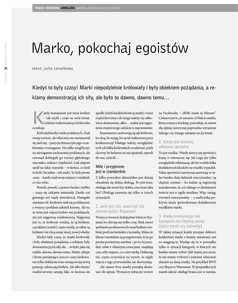 marketing w praktyce TEMAT NUMERU ANALIZA MARKO, POKOCHAJ EGOISTÓW tekst: Julia Izmałkowa luty 2016 26 Marko, pokochaj egoistów Kiedyś to były czasy! Marki niepodzielnie królowały i były obiektem pożądania, a reklamy demonstracją ich siły, ale było to dawno, dawno temu… K ażdy konsument jest teraz królem – tak myśli i czuje na swój temat. I właśnie traktowania po królewsku oczekuje. Król miał kiedyś wielu poddanych. Znał swoją wartość, ale właściwie nie zastanawiał się nad nią – pozycja tłumaczyła jego oczekiwania i wymagania. Nie tylko mógł liczyć na nienaganne zachowanie poddanych, ale zewsząd dobiegały go wyrazy głębokiego szacunku, miłości i lojalności. Lud chętnie szedł na takie warunki – w końcu, co król to król. On jeden – ich wielu. To były proste czasy – każdy znał swoje miejsce i wiedział, co ma robić. Powoli, powoli, a potem bardzo szybko – czasy się ciekawie zmieniały. Zaszło coś gorszego niż rządy demokracji. Nastąpiła zamiana ról. Królowie stali się poddanymi, a wszyscy poddani założyli korony. Ale to, że teraz jest więcej królów niż poddanych, nie jest najgorszą wiadomością. Najgorszą jest to, że królowie wiedzą, że są królami, a poddani (marki) często myślą, że także są królami i nie chcą uznać innej, nowej władzy. Kiedyś były czasy, że marki królowały i były obiektem pożądania, a reklamy były demonstracją ich siły, ale… to było, jako się rzekło, dawno, dawno temu. Marki, sklepy i firmy pamiętające jeszcze czasy królowania tylko deklaratywnie uznają swoją nową pozycję, odrzucają Kotlera. Ale albo firmy/ marki/serwisy uznają fakt, że korona im spadła (jeżeli kiedykolwiek ją miały) i teraz rządzi ktoś inny i do niego należy się całkowicie dostosować, albo… realne jest zagrożenie stopniowego odejścia w zapomnienie. Konsumenci zachowują się jak królowie, bo chcą, bo mogą, bo są tak traktowani przez konkurencję! Dlatego należy uwzględnić tych ich kilka królewskich oczekiwań, jeżeli chcemy, by łaskawie na nas spojrzeli, zajrzeli do nas, wrócili… Mile i przyjemnie jest w standardzie Z kilku powodów absurdalne jest dzisiaj chwalenie się dobrą obsługą. Po pierwsze, obsługa nie może być dobra, ona musi taka być! Obsługę zauważa się tylko w trzech sytuacjach: 1. Jeśli jest zła, może być zła zawsze (patrz Rayanair) Wszyscy otwarcie hejtują linie lotnicze Rayanair, bo oferują one tylko cenę. Brak nawet spełnienia podstawowych zasad kultury osobistej podczas kontaktu z tą marką. Mimo że klienci mentalnie są przygotowani, że to po prostu powietrzny autobus – po to, by poradzić sobie z własnymi emocjami, znajdują czas, żeby napisać, co o nim myślą. Deklarują też, często oczywiście na wyrost, że nigdy więcej z tego przewoźnika nie skorzystają. Ale nawet love marki potrafią dostawać złe opinie. Wystarczy zobaczyć review na Facebooku – „RISK made in Warsaw”. Ciekawe jest to, że uznanie, iż Risk to marka, którą wszyscy kochają, powoduje, że nawet złą opinię zazwyczaj poprzedza wyrażenie takiego czy innego uznania na jej temat. 2. Kiedy jest totalnie, odlotowo genialna To jest rzadkie. Wtedy zazwyczaj opowieści krążą w internecie, np. jak Lego nie tylko uwzględniło reklamację, ale też wysłało kilka dodatkowych klocków na wszelki wypadek. Takie opowieści zazwyczaj zawierają w sobie bardzo duży ładunek emocjonalny i są chętnie czytane – bo ludzie są naprawdę zaszokowani, że coś takiego w dzisiejszym świecie jest w ogóle możliwe. Więc zasięg, również emocjonalny – z nadwyżką pokrywa straty spowodowane dodatkowym wysiłkiem marki. 3. Kiedy konkurencja lub kategoria ma fatalną opinię (patrz banki czy telewizje) W takiej sytuacji każdy przejaw dobroci konkretnej marki z branży uznawany jest za osiągnięcie. Wydaje się to w porządku tylko w sytuacji kategorii, w których nie bardzo mamy wybór (lub mamy poczucie, że nie mamy wyboru) i jesteśmy właściwie skazani na daną markę. Na przykład RWE czy Okęcie w Warszawie. W przypadku tych marek jakość obsługi brana jest w nawias, Zawłaszczanie klienta nic nie daje Niektórzy uważają, że ich konsument to ICH konsument. Kiedy w Izmałkowa Consulting przygotowujemy arkusze badawcze służące do sprawdzenia postaw konsumenckich – klienci często wykreślają wszystko, co nie jest związane z ich biznesami. Bo szkoda czasu… Kiedy zamawiają badania, chcą wiedzieć, jak się klienci zachowują tylko w ich sklepie, jak postępują z ich produktami, jakie mają oczekiwania wobec właśnie ich marki. Rzadko zainteresują się stosunkiem do produktów konkurencji – w zasadzie tylko wtedy, jeśli są bardzo otwarci i mają spory budżet. No więc wiadomość dla nich mam taką, że to, jak się klienci zachowują w ich sklepie, jest najmniej ważne – to konsekwencja tego, w jakim żyją świecie i czego na co dzień doświadczają. Możemy być otwarci i elastyczni wobec wielu sugestii i próśb co do tego, jak prowadzić badanie, ale jednej rzeczy jesteśmy absolutnie pewni – musimy zapytać ludzi o ich najlepsze doświadczenia – gdziekolwiek, w jakiejkolwiek kategorii biznesu by to nie było. „Najlepsze”, „najbardziej poruszające”, „pierwsze, które im przychodzi do głowy” – to są słowa klucze. Badana kategoria nie jest wcale najważniejsza. Kiedyś robiliśmy badania jakości obsługi klientów VIP w jednym z banków. Żaden z klientów nie wymienił bankowego doświadczenia jako swojego najlepszego, ale za to pojawiła się w ich wypowiedziach dwukrotnie firma obsługująca… szkolenia i konferencje. Mówiono o jej reakcji na potrzeby i problemy bez dyskusji na temat winy, bez uwag na temat wielkości/małości problemu. Zachowanie tej firmy okazało się czymś, co najbardziej zapadło w pamięć naszym rozmówcom – ważnym i zajętym ludziom. Zaskak