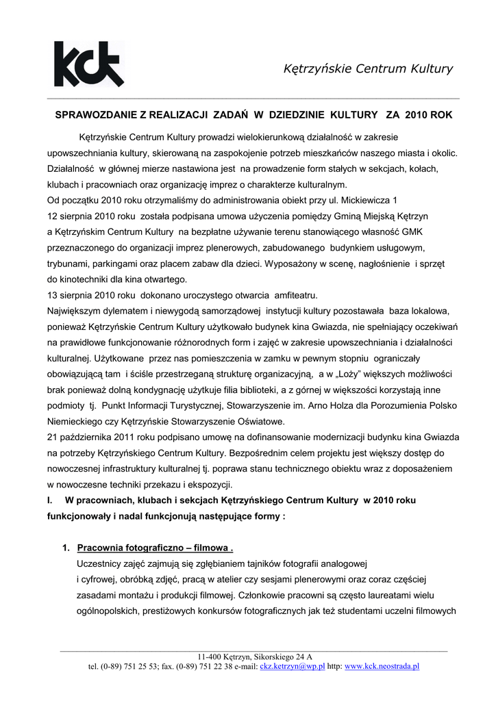 Kętrzyńskie Centrum Kultury ___________________________________________________________________________________________________ SPRAWOZDANIE Z REALIZACJI ZADAŃ W DZIEDZINIE KULTURY ZA 2010 ROK Kętrzyńskie Centrum Kultury prowadzi wielokierunkową działalność w zakresie upowszechniania kultury, skierowaną na zaspokojenie potrzeb mieszkańców naszego miasta i okolic. Działalność w głównej mierze nastawiona jest na prowadzenie form stałych w sekcjach, kołach, klubach i pracowniach oraz organizację imprez o charakterze kulturalnym. Od początku 2010 roku otrzymaliśmy do administrowania obiekt przy ul. Mickiewicza 1 12 sierpnia 2010 roku została podpisana umowa użyczenia pomiędzy Gminą Miejską Kętrzyn a Kętrzyńskim Centrum Kultury na bezpłatne używanie terenu stanowiącego własność GMK przeznaczonego do organizacji imprez plenerowych, zabudowanego budynkiem usługowym, trybunami, parkingami oraz placem zabaw dla dzieci. Wyposażony w scenę, nagłośnienie i sprzęt do kinotechniki dla kina otwartego. 13 sierpnia 2010 roku dokonano uroczystego otwarcia amfiteatru. Największym dylematem i niewygodą samorządowej instytucji kultury pozostawała baza lokalowa, ponieważ Kętrzyńskie Centrum Kultury użytkowało budynek kina Gwiazda, nie spełniający oczekiwań na prawidłowe funkcjonowanie różnorodnych form i zajęć w zakresie upowszechniania i działalności kulturalnej. Użytkowane przez nas pomieszczenia w zamku w pewnym stopniu ograniczały obowiązującą tam i ściśle przestrzeganą strukturę organizacyjną, a w „Loży” większych możliwości brak ponieważ dolną kondygnację użytkuje filia biblioteki, a z górnej w większości korzystają inne podmioty tj. Punkt Informacji Turystycznej, Stowarzyszenie im. Arno Holza dla Porozumienia Polsko Niemieckiego czy Kętrzyńskie Stowarzyszenie Oświatowe. 21 października 2011 roku podpisano umowę na dofinansowanie modernizacji budynku kina Gwiazda na potrzeby Kętrzyńskiego Centrum Kultury. Bezpośrednim celem projektu jest większy dostęp do nowoczesnej infrastruktury kulturalnej tj. poprawa stanu technicznego obiektu wraz z doposażeniem w nowoczesne techniki przekazu i ekspozycji. I. W pracowniach, klubach i sekcjach Kętrzyńskiego Centrum Kultury w 2010 roku funkcjonowały i nadal funkcjonują następujące formy : 1. Pracownia fotograficzno – filmowa . Uczestnicy zajęć zajmują się zgłębianiem tajników fotografii analogowej i cyfrowej, obróbką zdjęć, pracą w atelier czy sesjami plenerowymi oraz coraz częściej zasadami montażu i produkcji filmowej. Członkowie pracowni są często laureatami wielu ogólnopolskich, prestiżowych konkursów fotograficznych jak też studentami uczelni filmowych _____________________________________________________________________________________________ 11-400 Kętrzyn, Sikorskiego 24 A tel. (0-89) 751 25 53; fax. (0-89) 751 22 38 e-mail: [email protected] http: www.kck.neostrada.pl Kętrzyńskie Centrum Kultury ___________________________________________________________________________________________________ Pracownia wyposażona jest w atelier ( tła, softboxy ), ciemnię analogową ( trzy stanowiska), sprzęt do cyfrowej obróbki zdjęć i filmów ( trzy stanowiska), kamerę HDV – Canon XHAL z oprzyrządowaniem. Zajęcia odbywają się w środy i piątki Uczestnicy zajęć niejednokrotnie tworzą dokumentację działalności KCK jak również imprez i uroczystości organizowanych w naszym mieście. Pod kierunkiem instruktora ds. upowszechniania fotografii przygotowują ekspozycje wystaw fotograficznych w galerii usytuowanej na parterze budynku ( trochę przyciasnej), fotografują wydarzenia naszego miasta i instytucji. W zajęciach pracowni uczestniczy około piętnastu osób. 2. Pracownia muzyczna: Uczestnicy sekcji muzycznej zaspokajają potrzebę kontaktu z muzyką spędzając czas wolny i próbują swoich możliwości pod kierunkiem instruktora ds. upowszechniania muzyki prowadzona jest także nauka gry na gitarze i perkusji. Zajęcia prowadzone są od poniedziałku do piątku w godzinach popołudniowych w kętrzyńskim zamku na parterze skrzydła biblioteki. Pracownia wyposażona jest w pianino cyfrowe YAMAHA DGX-620, perkusję MAPEX Q, pianino elektryczne RHODES oraz wzmacniacze basowe YAMAHA BST i gitarowe BOX ELECTRONICS i TAURUS TURBO. NA stanie pracowni znajduje się również zestaw nagłośnieniowy, nad którym opiekę sprawuje instruktor ds. upowszechniania muzyki / akustyk. Niedogodnością pracowni jest brak typowego pomieszczenia magazynowego do przechowywania sprzętu ( wybudowano w klatce wyjściowej kina prowizoryczny magazyn podręczny polepszając troszkę stan rzeczy.) 3. Pracownia plastyczna: Uczestnikami jednego z kółek są małe dzieci, celem pracowni jest rozwijanie wyobraźni dziecięcej i zdolności manualnych, a także poznawanie wielu technik plastycznych. Zajęcia prowadzone są w formie zabawy plastycznej, którą mali uczestnicy uwielbiają , przychodząc na nie systematycznie. W zajęciach kółka plastycznego uczestniczy średnio 20 dzieci. Koło Plastyczne „VENA” Uczestnikami zajęć są osoby, które lubią malować i pragną rozwijać swoje uzdolnienia plastyczne, szkolić warsztat. Osoby uzdolnione artystycznie uczestniczące w zajęciach integrują się wymieniając doświadczenia , organizują wystawy swoich prac. _____________________________________________________________________________________________ 11-400 Kętrzyn, Sikorskiego 24 A tel. (0-89) 751 25 53; fax. (0-89) 751 22 38 e-mail: [email protected] http: www.kck.neostrada.pl Kętrzyńskie Centrum Kultury ___________________________________________________________________________________________________ Na zajęcia uczestniczą również ci, którzy w przyszłości chcą kontynuować naukę na kierunkach plastycznych w szkołach i uczelniach artystycznych ( stali uczestnicy zajęć – 5 osób). Pracownia wyposażona jest w 15 profe